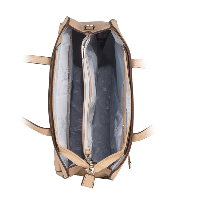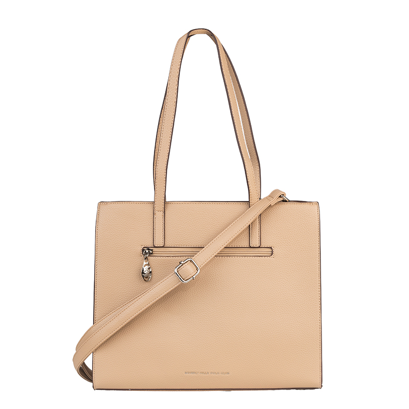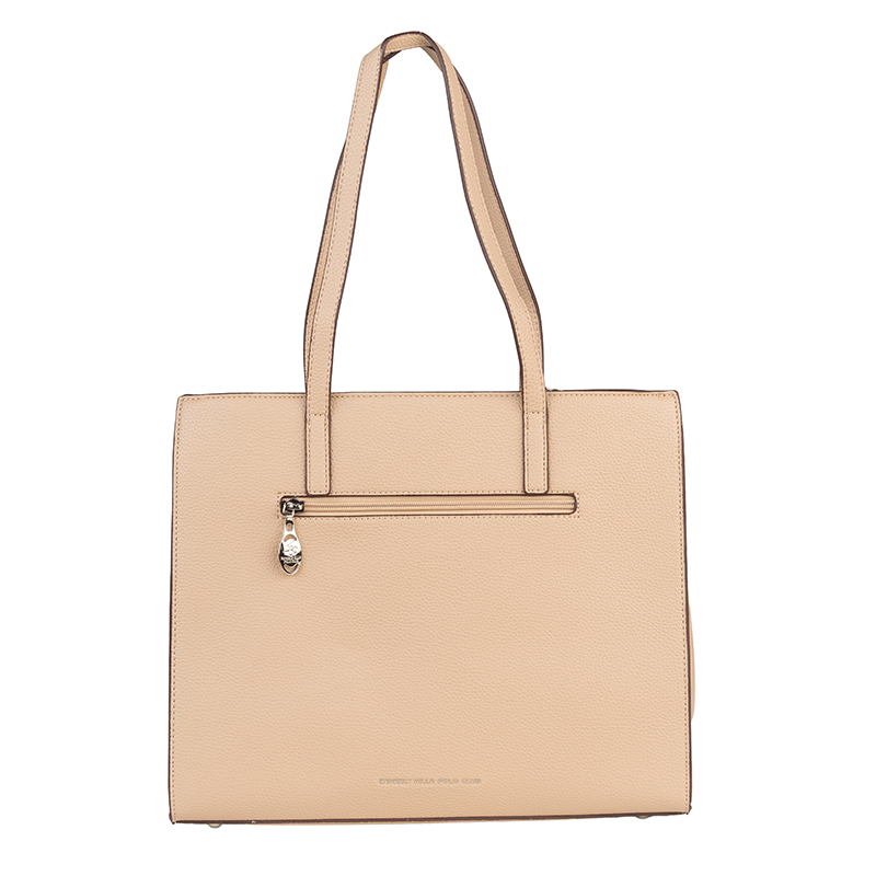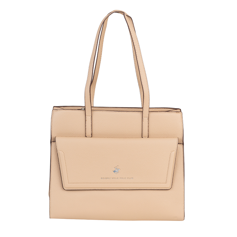 Тази дамска чанта от еко кожа в нежен бежов цвят впечатлява с изчистен, структурен силует и изискана линия, подходяща както за офис, така и за свободно време. Размерите 33,5 x 27 x 12 см осигуряват достатъчно пространство за документи формат А4, таблет, портмоне и всички ежедневни принадлежности. Основното отделение се затваря с цип и предлага вътрешни разделители и джобове, които помагат всичко да бъде подредено и лесно откриваемо. Отпред е разположен стилен капак с магнитно закопчаване, който оформя допълнително отделение – практично място за телефон или ключове. Двете дръжки позволяват удобно носене в ръка или на рамо, а включената дълга регулируема презрамка дава възможност чантата да се носи и „crossbody“. Фина метална емблема с логото на Beverly Hills Polo Club допълва елегантния характер на модела и го превръща в отличен избор за делови и стилни визии.