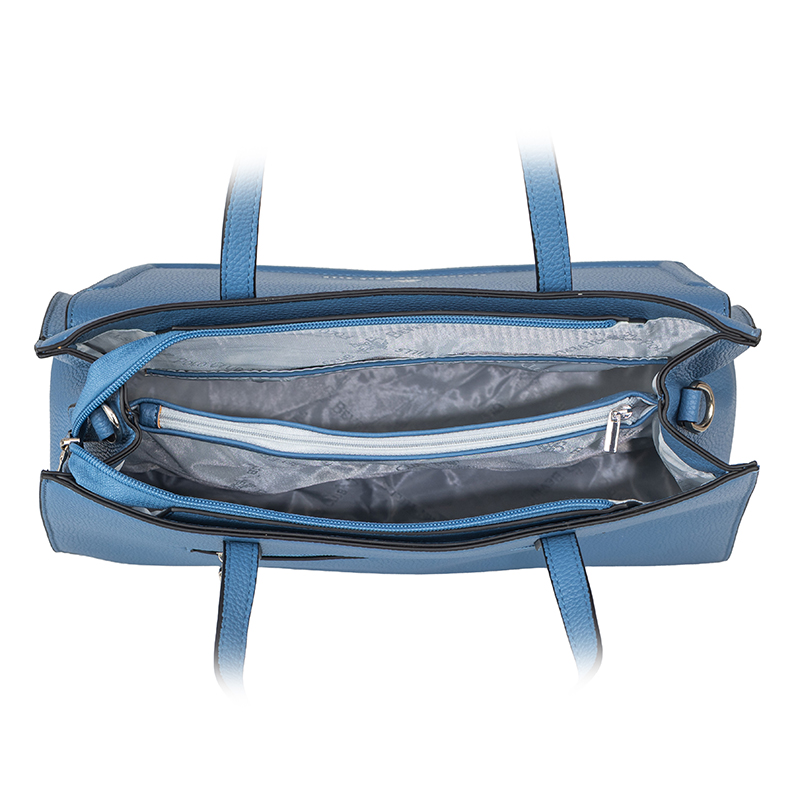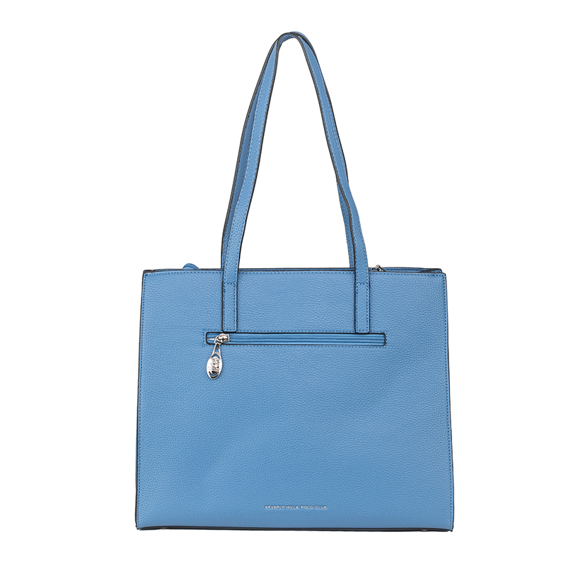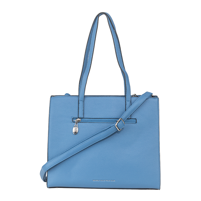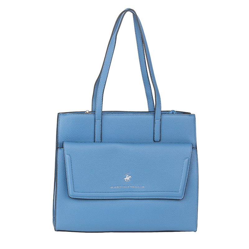 Тази дамска чанта от еко кожа в небесно син цвят впечатлява с изчистен, структурен силует и изискана линия, подходяща както за офис, така и за свободно време. Размерите 33,5 x 27 x 12 см осигуряват достатъчно пространство за документи формат А4, таблет, портмоне и всички ежедневни принадлежности. Основното отделение се затваря с цип и предлага вътрешни разделители и джобове, които помагат всичко да бъде подредено и лесно откриваемо. Отпред е разположен стилен капак с магнитно закопчаване, който оформя допълнително отделение – практично място за телефон или ключове. Двете дръжки позволяват удобно носене в ръка или на рамо, а включената дълга регулируема презрамка дава възможност чантата да се носи и „crossbody“. Фина метална емблема с логото на Beverly Hills Polo Club допълва елегантния характер на модела и го превръща в отличен избор за делови и стилни визии.