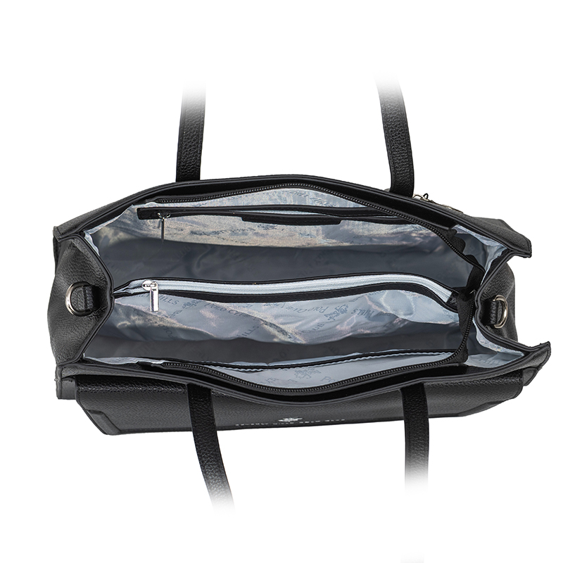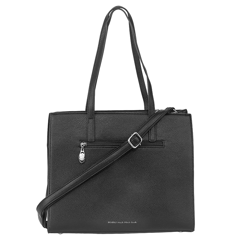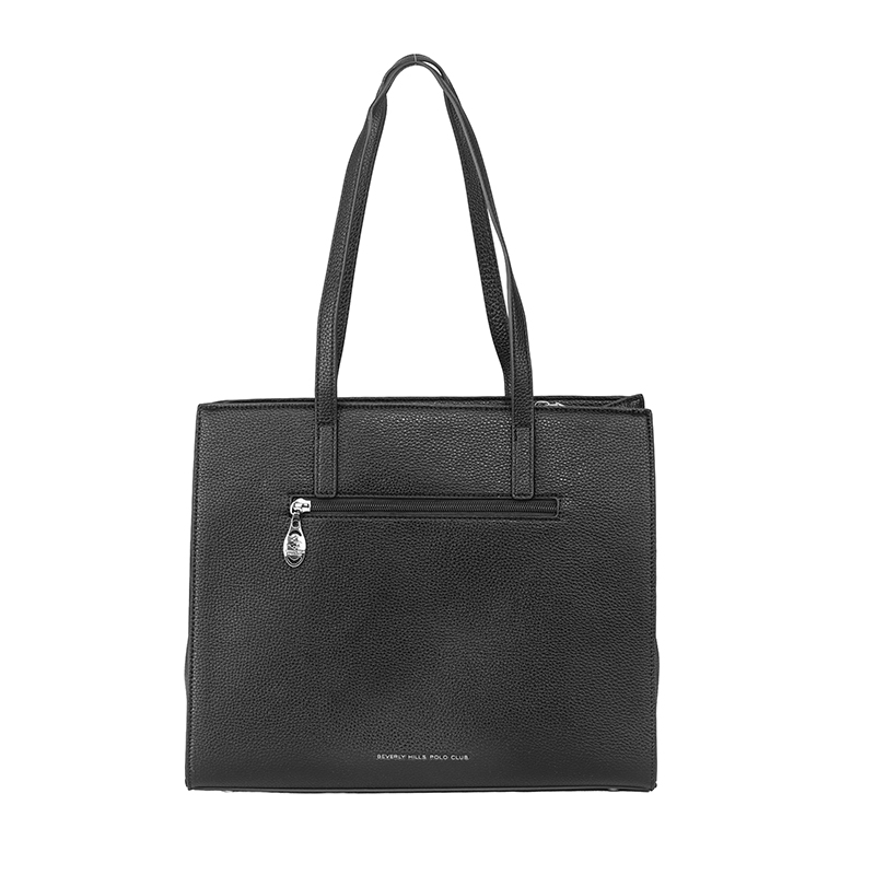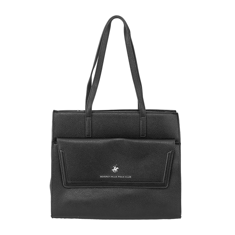Тази дамска чанта от еко кожа в класически черен цвят впечатлява с изчистен, структурен силует и изискана линия, подходяща както за офис, така и за свободно време. Размерите 33,5 x 27 x 12 см осигуряват достатъчно пространство за документи формат А4, таблет, портмоне и всички ежедневни принадлежности. Основното отделение се затваря с цип и предлага вътрешни разделители и джобове, които помагат всичко да бъде подредено и лесно откриваемо. Отпред е разположен стилен капак с магнитно закопчаване, който оформя допълнително отделение – практично място за телефон или ключове. Двете дръжки позволяват удобно носене в ръка или на рамо, а включената дълга регулируема презрамка дава възможност чантата да се носи и „crossbody“. Фина метална емблема с логото на Beverly Hills Polo Club допълва елегантния характер на модела и го превръща в отличен избор за делови и стилни визии.
