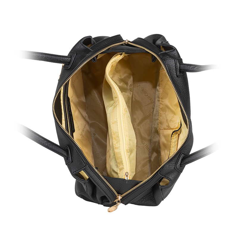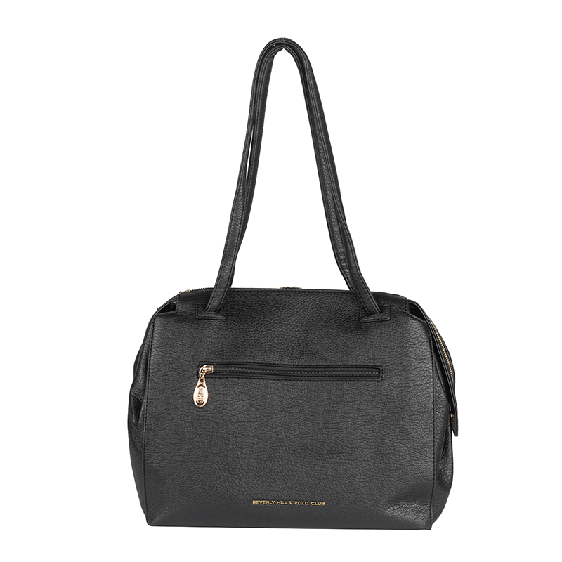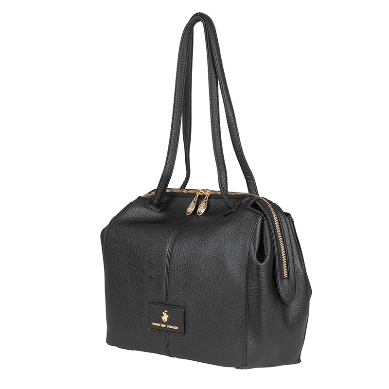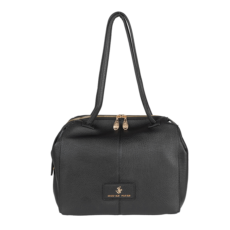 Тази дамска чанта от еко кожа впечатлява с мек силует и изчистен дизайн, който лесно се комбинира с различни тоалети – от офис визия до ежедневен стил. Моделът е в класически черен нюанс и размери 30 x 22 x 14 см, осигуряващи достатъчно пространство за портмоне, телефон, козметична чантичка, очила и други необходими принадлежности. Основното отделение се затваря с цип и е допълнено с вътрешни джобчета за по-добра организация на вещите. Двете дълги дръжки позволяват удобно носене на рамо. На предната част е поставена финна плочка с логото Beverly Hills Polo Club, която придава премиум завършек и подчертава качеството на модела. Еко кожата е устойчива на износване и лесна за почистване, което прави чантата практичен избор за ежедневна употреба.