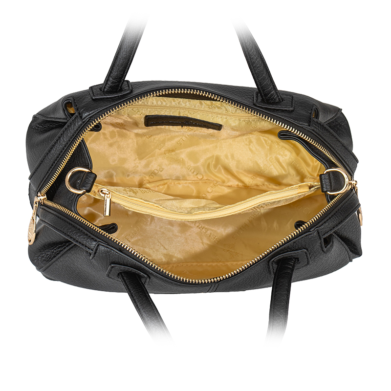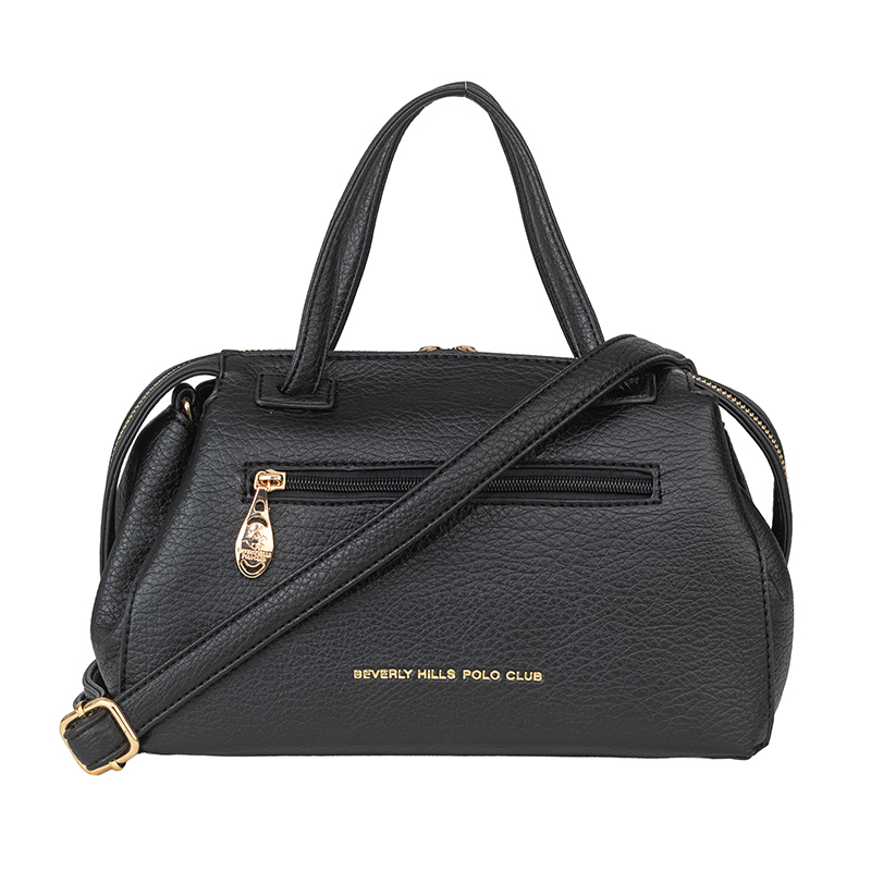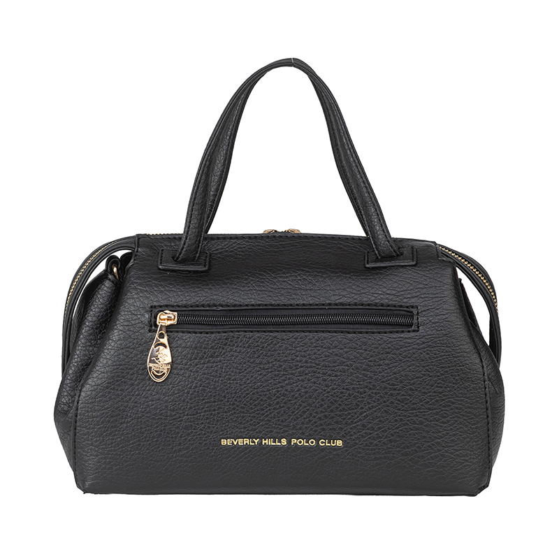 Тази дамска чанта от еко кожа в черно е перфектният баланс между стил и удобство. Меката, леко структурирана форма и размерите 27 x 16 x 14 см я правят подходяща за ежедневна употреба – побира портмоне, телефон, козметика, очила и други необходими принадлежности. Основното отделение се затваря с цип по цялата дължина, осигурявайки сигурност на съдържанието, а вътрешните джобчета помагат за добра организация на аксесоарите. Двете къси дръжки придават елегантен вид и позволяват удобно носене в ръка, докато свалящата се и регулируема дълга презрамка дава възможност чантата да се носи и през рамо или „crossbody“. Фината плочка с логото Beverly Hills Polo Club на предната част добавя премиум акцент и подчертава изисканата линия на модела, който лесно се комбинира с различни стилове облекло.