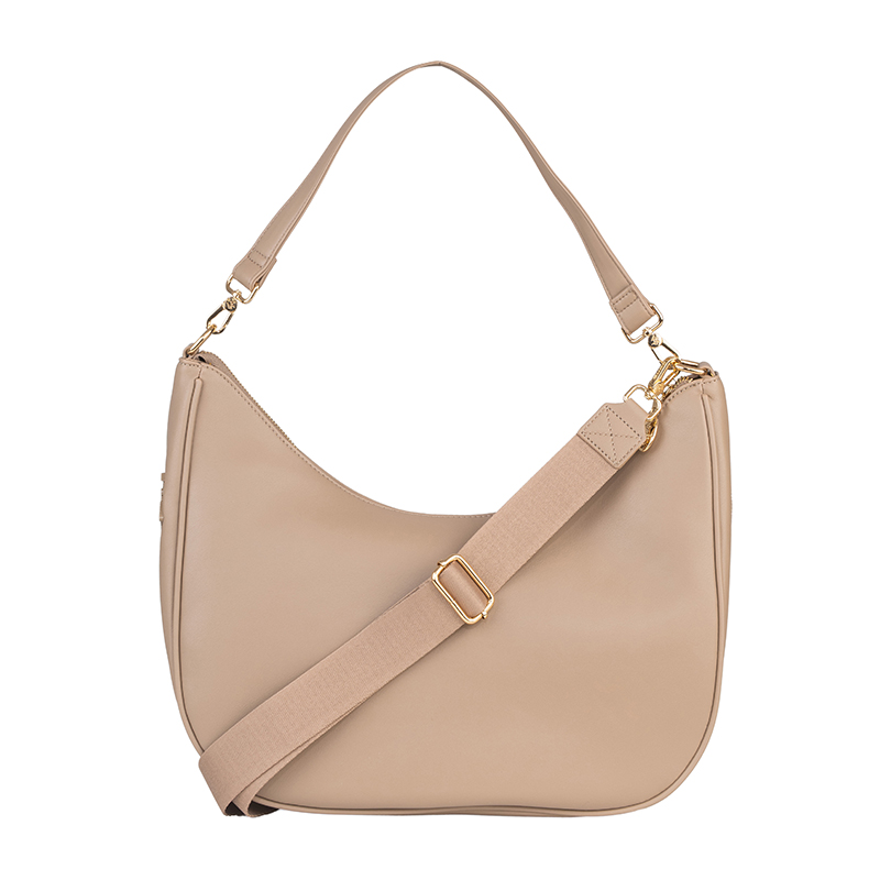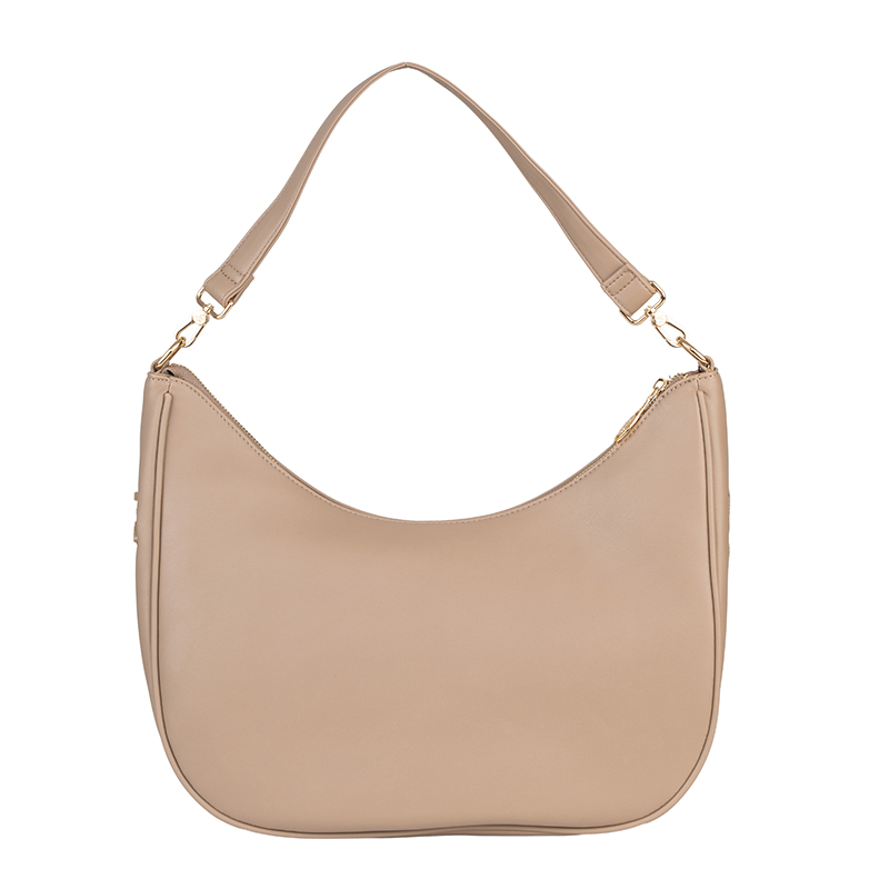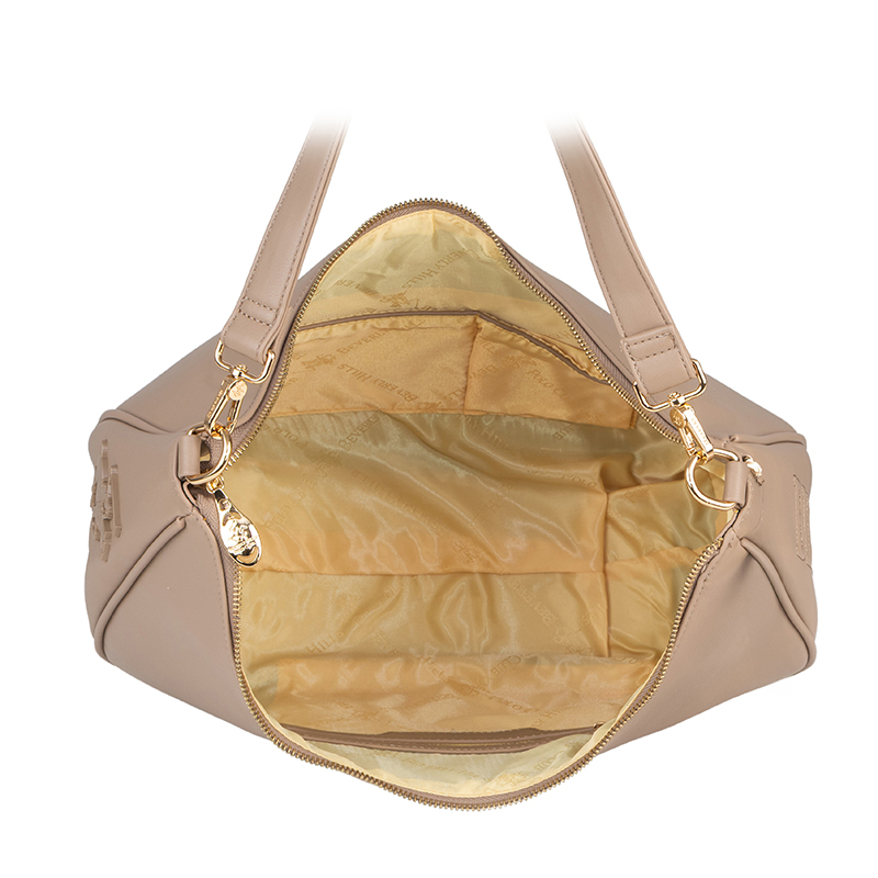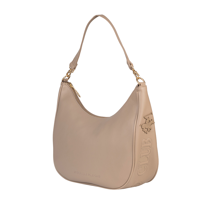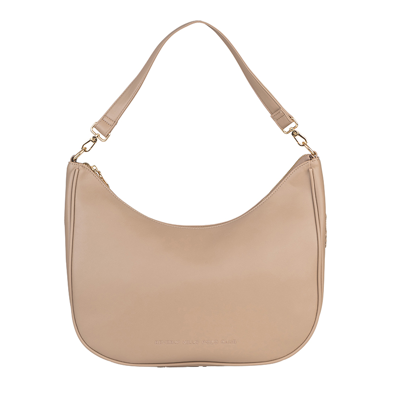 Тази дамска чанта тип „hobo“ е изработена от висококачествена еко кожа и впечатлява с мек, закръглен силует и изчистена линия. Моделът е в бежов цвят, който се съчетава лесно както с casual, така и с по-елегантни тоалети. Просторното основно отделение с цип побира портмоне, телефон, козметична чантичка, очила и други необходими принадлежности. Късата дръжка позволява удобно носене на рамо, а включената дълга сваляща се презрамка дава възможност раницата да се носи „crossbody“. Металните елементи в топъл златист тон и дискретното лого Beverly Hills Polo Club придават изискан акцент и подчертават премиум характера на модела. Еко кожата е устойчива на износване и лесна за поддръжка, което прави аксесоара идеален за активното ежедневие.