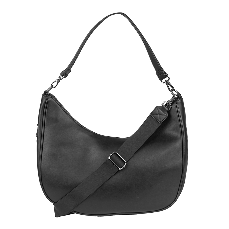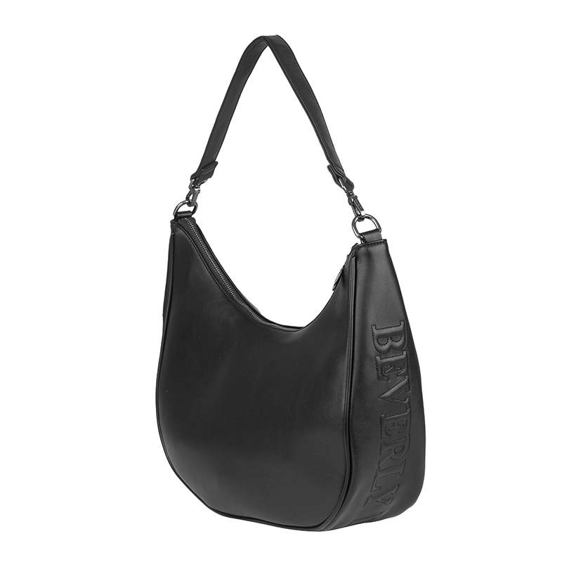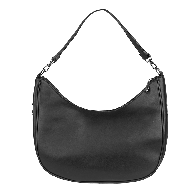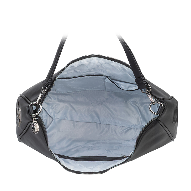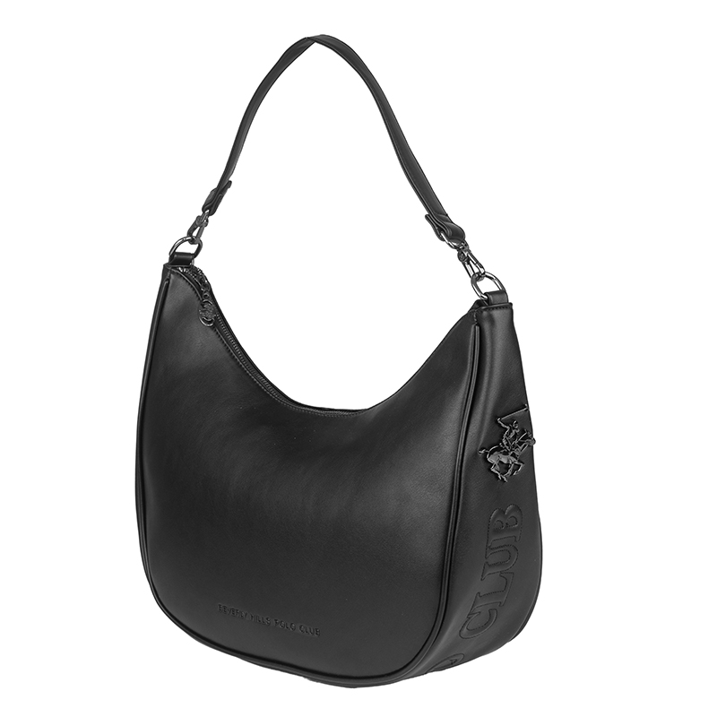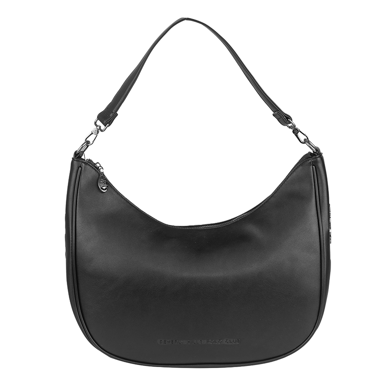 Тази дамска чанта тип „hobo“ е изработена от висококачествена еко кожа и впечатлява с мек, закръглен силует и изчистена линия. Моделът е в черен цвят, който се съчетава лесно както с casual, така и с по-елегантни тоалети. Просторното основно отделение с цип побира портмоне, телефон, козметична чантичка, очила и други необходими принадлежности. Късата дръжка позволява удобно носене на рамо, а включената дълга сваляща се презрамка дава възможност раницата да се носи „crossbody“. Металните елементи в топъл златист тон и дискретното лого Beverly Hills Polo Club придават изискан акцент и подчертават премиум характера на модела. Еко кожата е устойчива на износване и лесна за поддръжка, което прави аксесоара идеален за активното ежедневие.