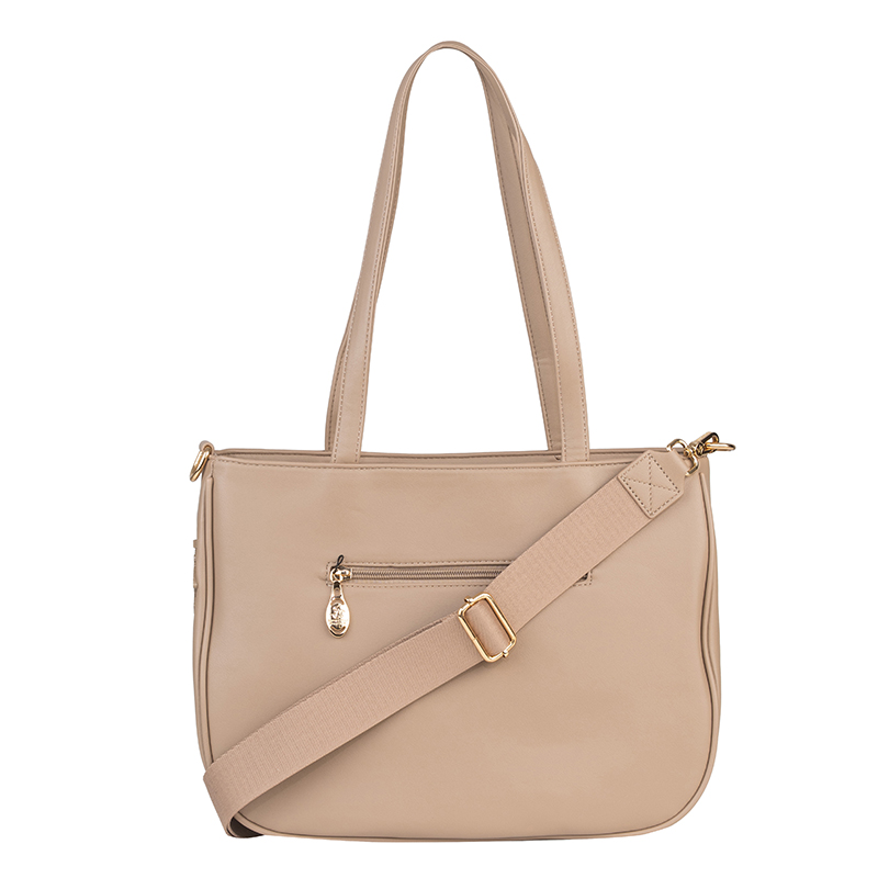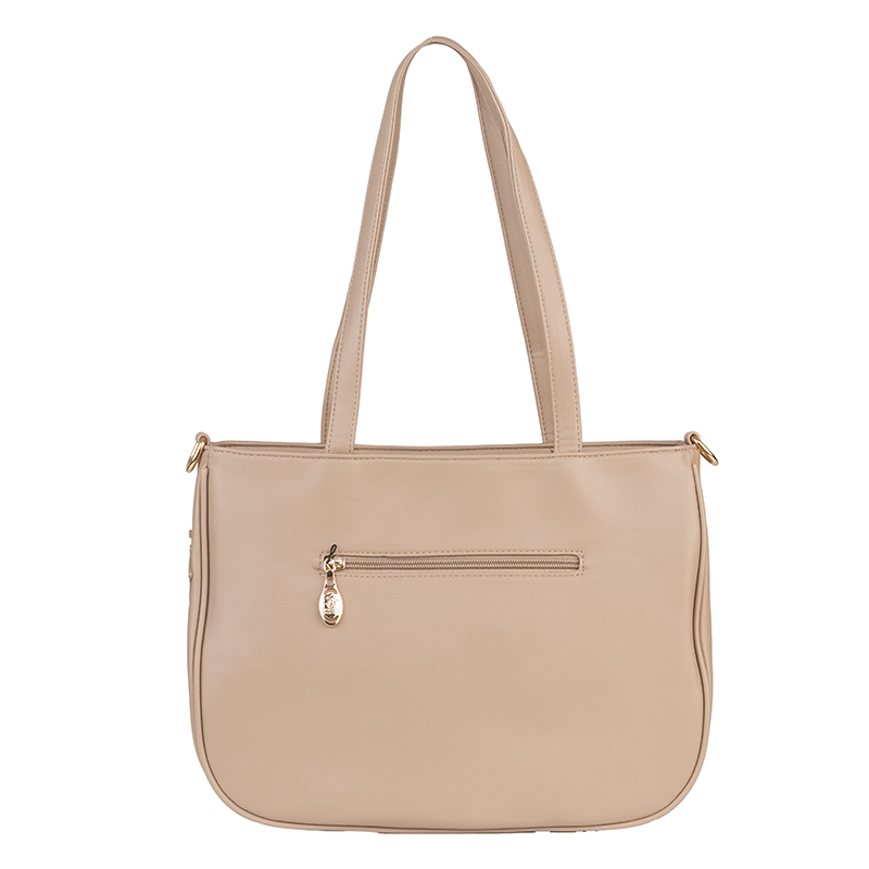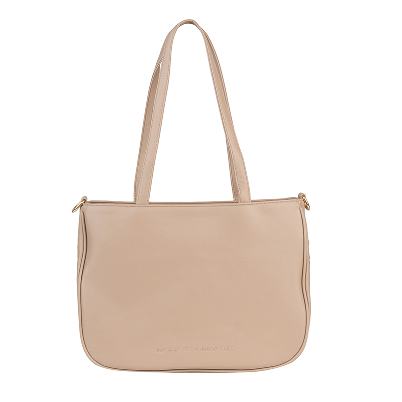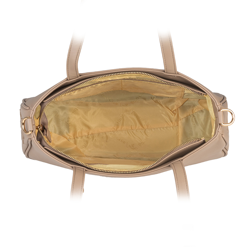 Тази дамска чанта от еко кожа впечатлява с изчистен, прав силует и нежно излъчване. Моделът е в класически бежов цвят и размери 34 x 25,5 x 11 см – достатъчно просторен за портмоне, телефон, козметична чантичка, документи и малък таблет. Основното отделение се затваря с цип и е допълнено с вътрешен джоб, който помага да поддържате съдържанието подредено и лесно достъпно. Двете дълги дръжки позволяват удобно носене на рамо, а свалящата се и регулируема дълга презрамка дава възможност чантата да се носи и „crossbody“. Меката еко кожа е приятна на допир и устойчива на ежедневна употреба, а дискретното лого Beverly Hills Polo Club придава завършен, елегантен акцент.