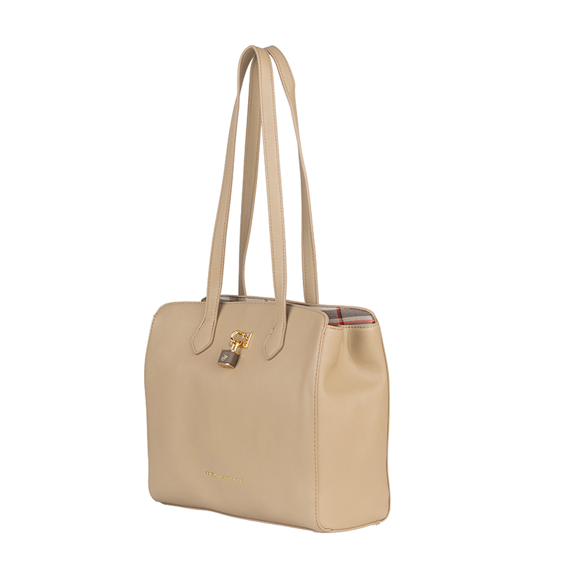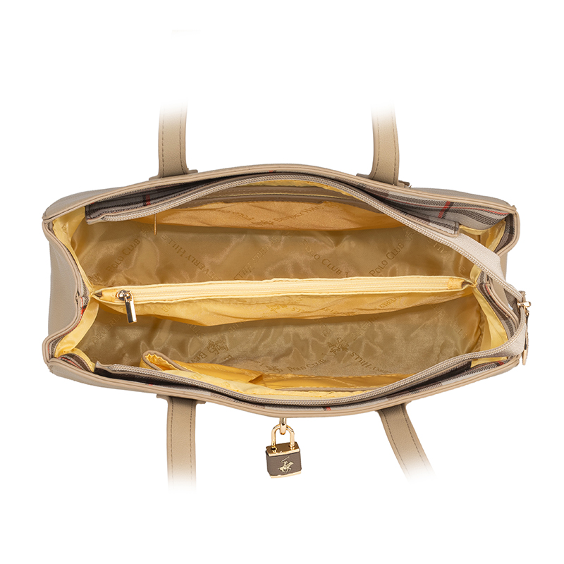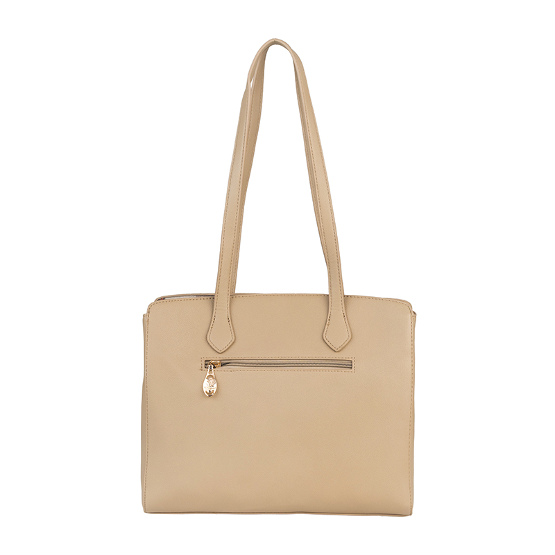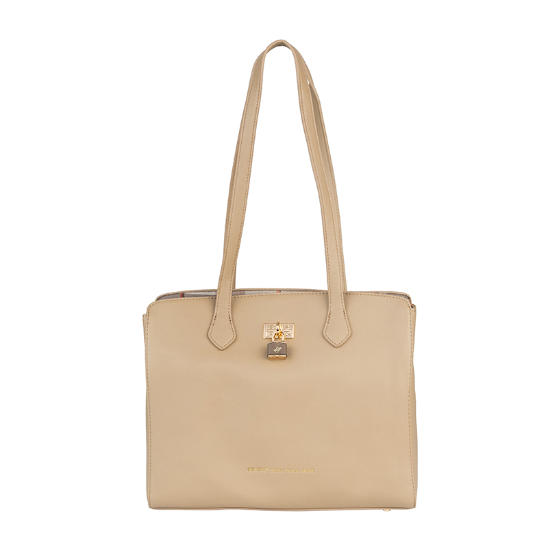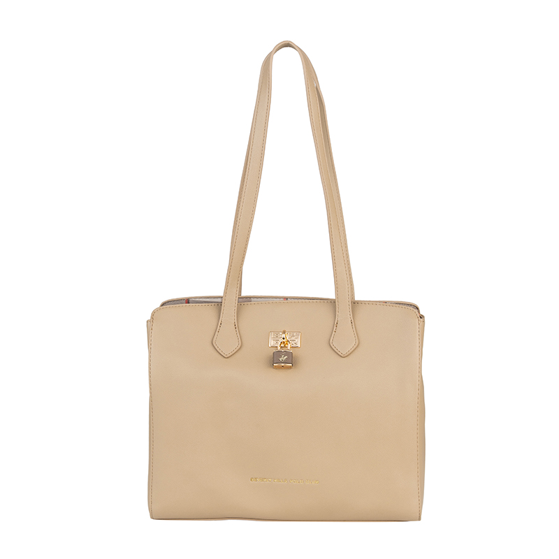Дамската чанта е изработена от висококачествена еко кожа и се отличава с елегантна форма и изчистен силует. Бежовият цвят придава универсален и класически вид, подходящ за всякакви тоалети – от ежедневни до по-официални. Размерите 32 x 25 x 12,5 см осигуряват широко и удобно вътрешно пространство, което позволява лесно съхранение на портфейл, телефон, документи и други необходими принадлежности. Моделът разполага с дълги и стабилни дръжки за комфортно носене на рамо, както и с практично основно отделение, което се затваря сигурно и поддържа вещите добре организирани. Металният декоративен елемент отпред добавя луксозен акцент и подчертава стила на чантата.