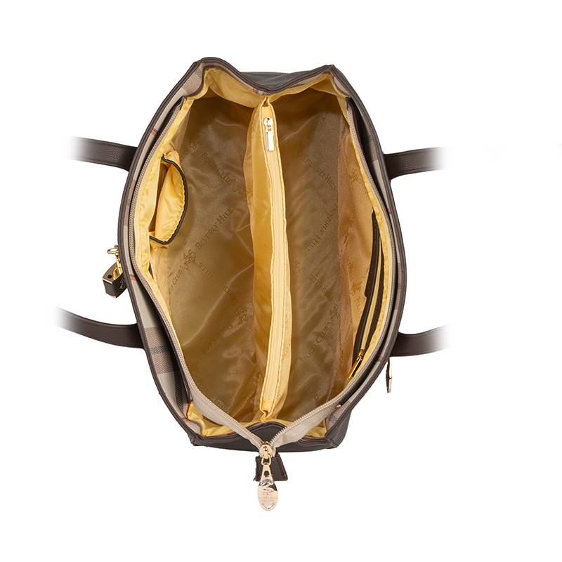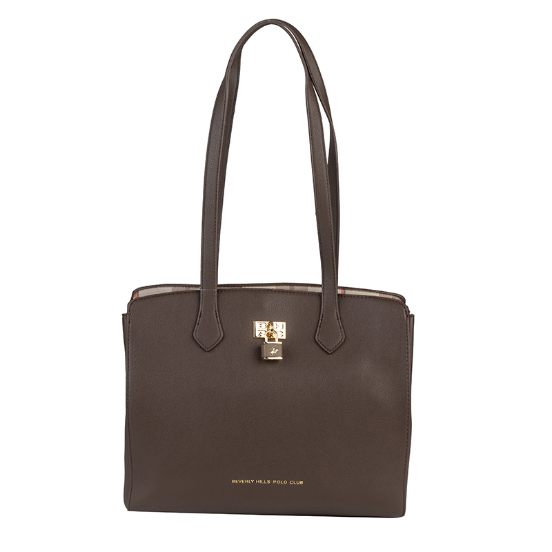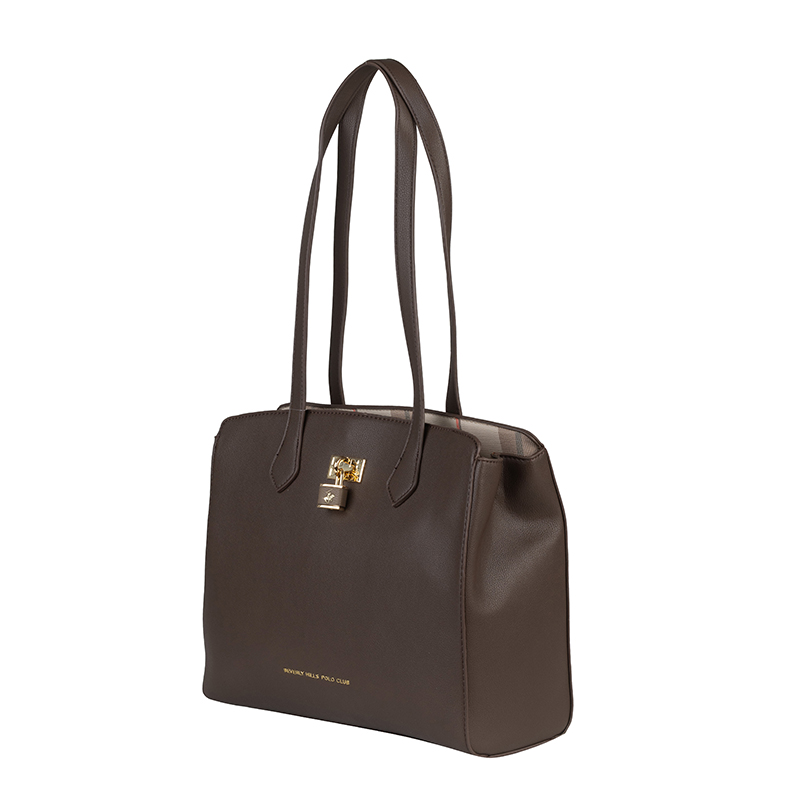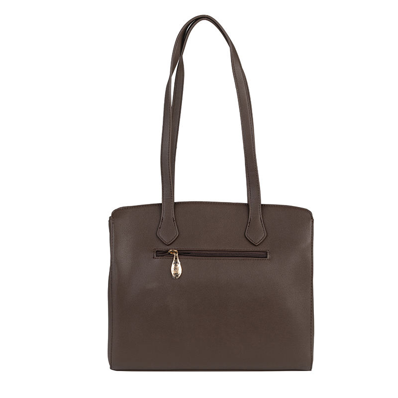 Дамската чанта е изработена от висококачествена еко кожа и се отличава с елегантна форма и изчистен силует. Кафявият цвят придава универсален и класически вид, подходящ за всякакви тоалети – от ежедневни до по-официални. Размерите 32 x 25 x 12,5 см осигуряват широко и удобно вътрешно пространство, което позволява лесно съхранение на портфейл, телефон, документи и други необходими принадлежности. Моделът разполага с дълги и стабилни дръжки за комфортно носене на рамо, както и с практично основно отделение, което се затваря сигурно и поддържа вещите добре организирани. Металният декоративен елемент отпред добавя луксозен акцент и подчертава стила на чантата.