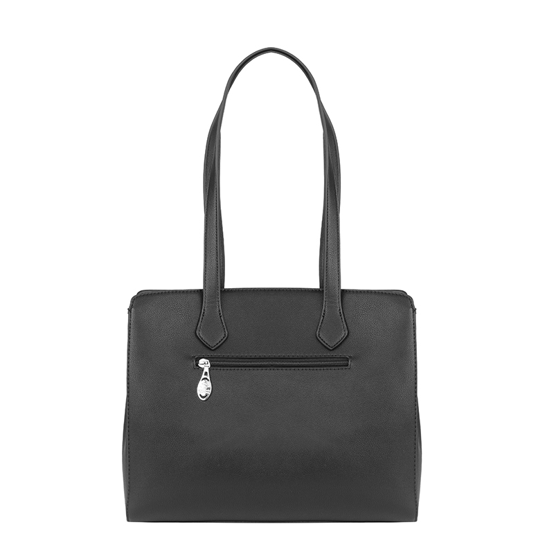 Дамската чанта е изработена от висококачествена еко кожа и се отличава с елегантна форма и изчистен силует. Черният цвят придава универсален и класически вид, подходящ за всякакви тоалети – от ежедневни до по-официални. Размерите 32 x 25 x 12,5 см осигуряват широко и удобно вътрешно пространство, което позволява лесно съхранение на портфейл, телефон, документи и други необходими принадлежности. Моделът разполага с дълги и стабилни дръжки за комфортно носене на рамо, както и с практично основно отделение, което се затваря сигурно и поддържа вещите добре организирани. Металният декоративен елемент отпред добавя луксозен акцент и подчертава стила на чантата.
