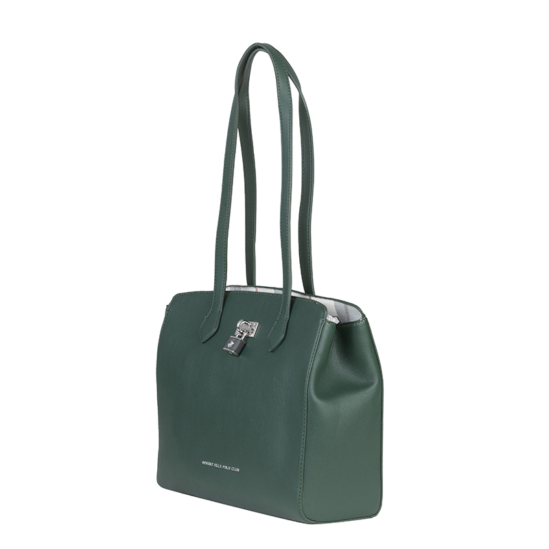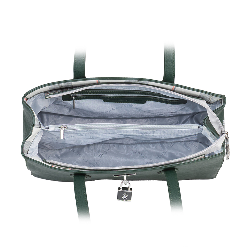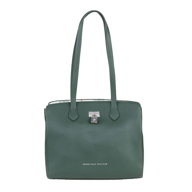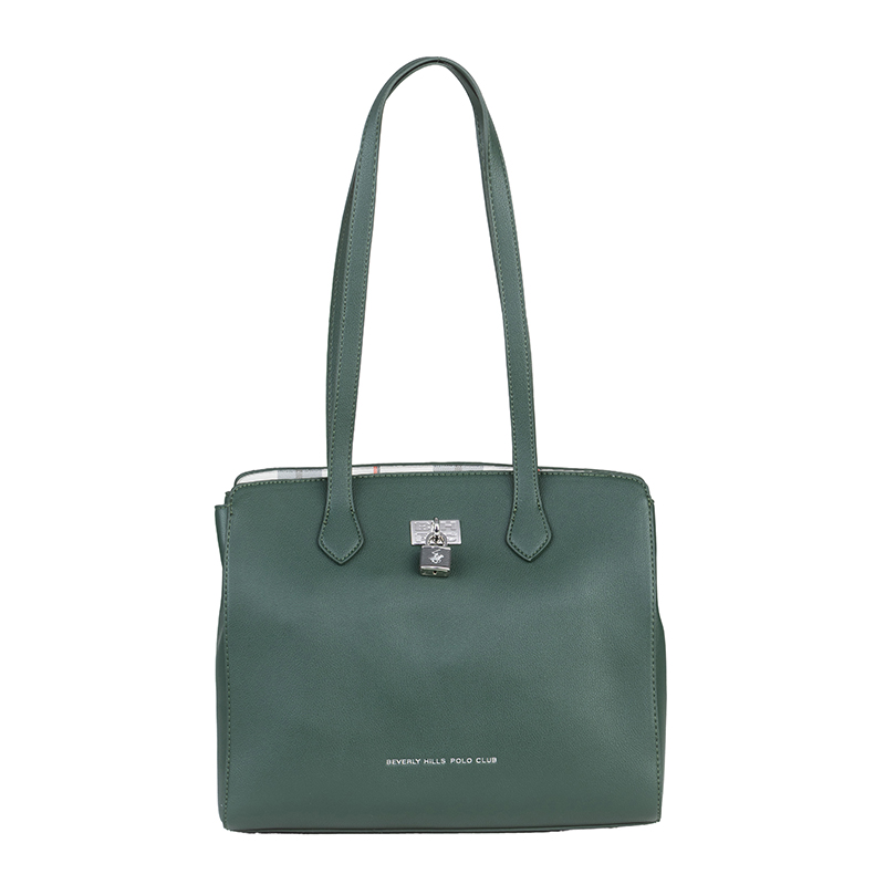 Дамската чанта е изработена от висококачествена еко кожа и се отличава с елегантна форма и изчистен силует. Зеленият цвят придава свеж и модерен вид, подходящ за разнообразни тоалети – от ежедневни до по-елегантни. Размерите 32 x 25 x 12,5 см осигуряват широко и удобно вътрешно пространство, което позволява лесно съхранение на портфейл, телефон, документи и други необходими принадлежности. Моделът разполага с дълги и стабилни дръжки за комфортно носене на рамо, както и с практично основно отделение, което се затваря сигурно и поддържа вещите добре организирани. Металният декоративен елемент отпред добавя луксозен акцент и подчертава стила на чантата.