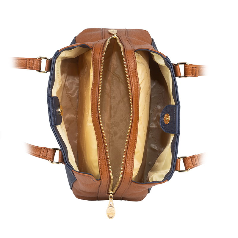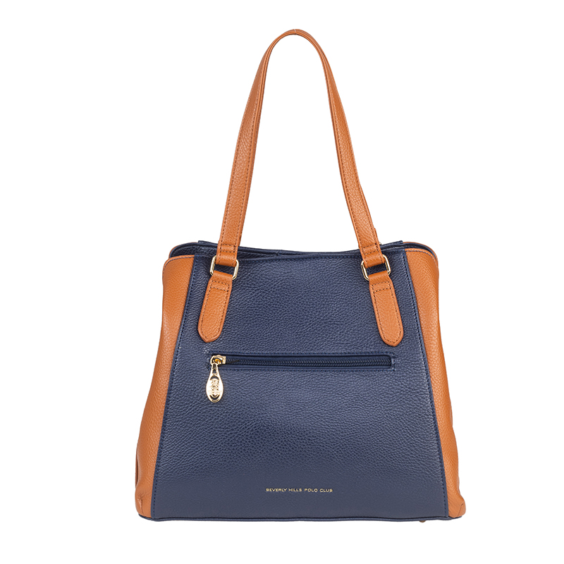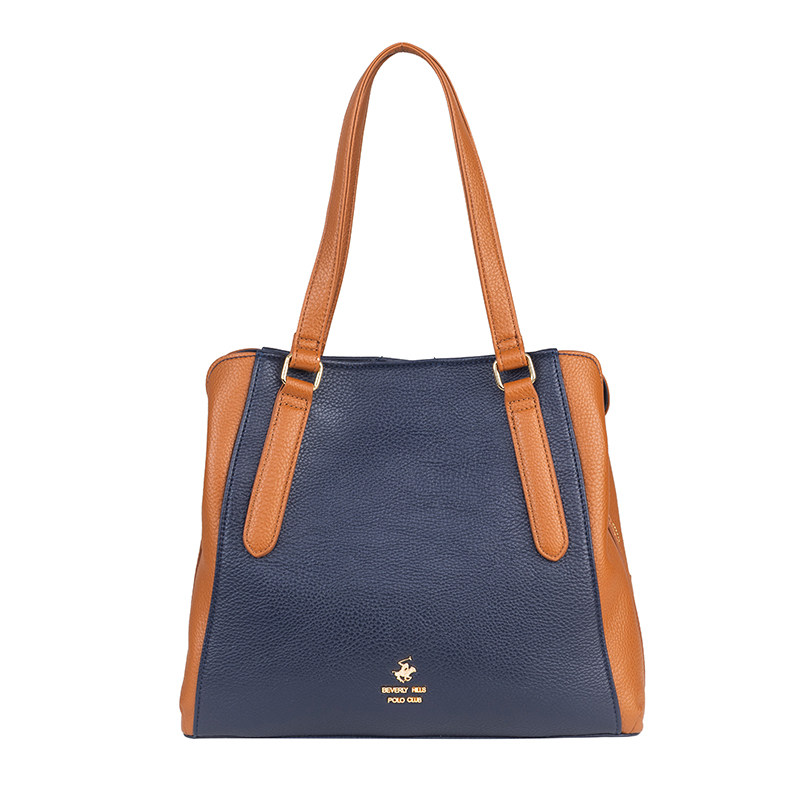 Тази дамска чанта от еко кожа впечатлява с изчистен, но запомнящ се дизайн. Моделът е в син и кафяв цвят, който лесно се комбинира с различни тоалети – от офис облекло до по-лежерни визии. Размерите 32 x 27,5 x 12,5 см осигуряват достатъчно пространство за портмоне, телефон, документи, несесер и други ежедневни принадлежности. Основното отделение се затваря сигурно и е организирано с вътрешни джобчета, които помагат всичко да бъде подредено и лесно достъпно. Дискретното лого Beverly Hills Polo Club в долната част придава премиум акцент и завършва елегантната визия на модела.
