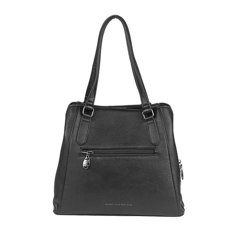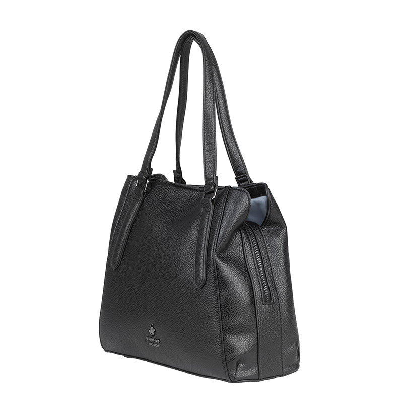 Тази дамска чанта от еко кожа впечатлява с изчистен, но запомнящ се дизайн. Моделът е в класически черен цвят, който лесно се комбинира с различни тоалети – от офис облекло до по-лежерни визии. Размерите 32 x 27,5 x 12,5 см осигуряват достатъчно пространство за портмоне, телефон, документи, несесер и други ежедневни принадлежности. Основното отделение се затваря сигурно и е организирано с вътрешни джобчета, които помагат всичко да бъде подредено и лесно достъпно. Дискретното лого Beverly Hills Polo Club в долната част придава премиум акцент и завършва елегантната визия на модела.
