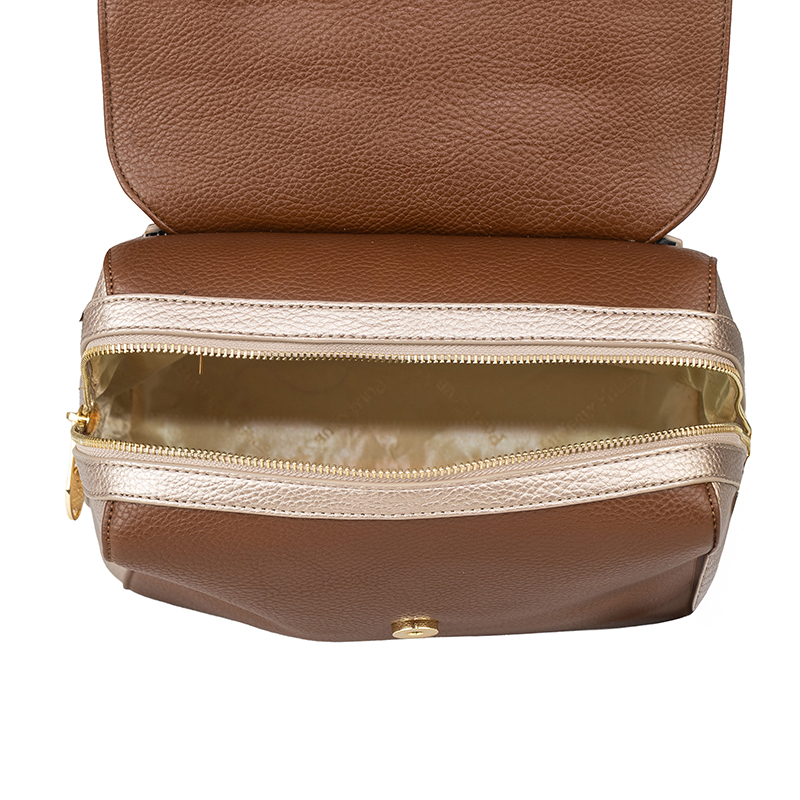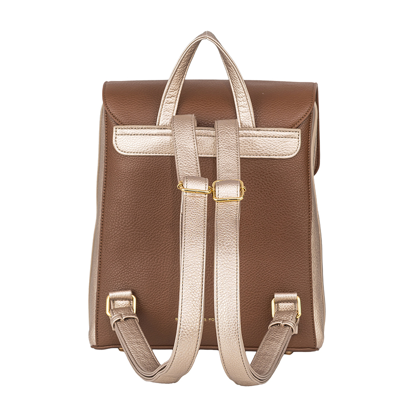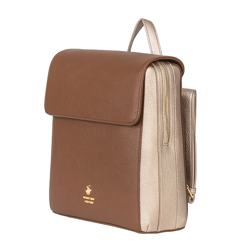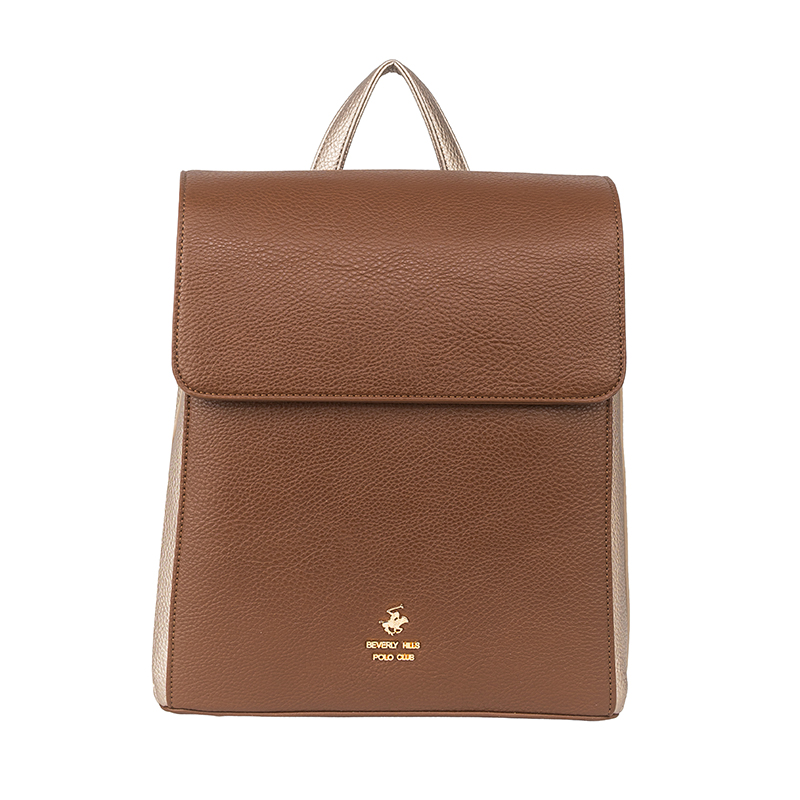Тази дамска раница от еко кожа впечатлява с изискан двуцветен дизайн. Стегнатият силует и размерите 26 x 30,5 x 11 см осигуряват достатъчно пространство за портмоне, телефон, несесер и други ежедневни принадлежности, като раницата запазва стилен и подреден вид. Големият капак придава изчистена линия и допълнителна сигурност, а основното отделение е организирано с вътрешни джобчета за по-добър ред. Регулируемите презрамки позволяват удобно напасване според ръста и предпочитанията, а горната дръжка дава възможност раницата да се носи и в ръка. Финото златисто лого Beverly Hills Polo Club в долната част подчертава премиум излъчването и прави модела подходящ както за ежедневни, така и за по-елегантни визии.