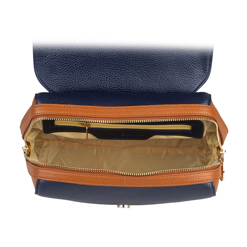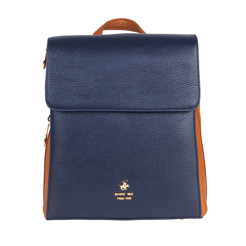 Тази дамска раница от еко кожа впечатлява с изискан двуцветен дизайн. Стегнатият силует и размерите 26 x 30,5 x 11 см осигуряват достатъчно пространство за портмоне, телефон, несесер и други ежедневни принадлежности, като раницата запазва стилен и подреден вид. Големият капак придава изчистена линия и допълнителна сигурност, а основното отделение е организирано с вътрешни джобчета за по-добър ред. Регулируемите презрамки позволяват удобно напасване според ръста и предпочитанията, а горната дръжка дава възможност раницата да се носи и в ръка. Финото златисто лого Beverly Hills Polo Club в долната част подчертава премиум излъчването и прави модела подходящ както за ежедневни, така и за по-елегантни визии.