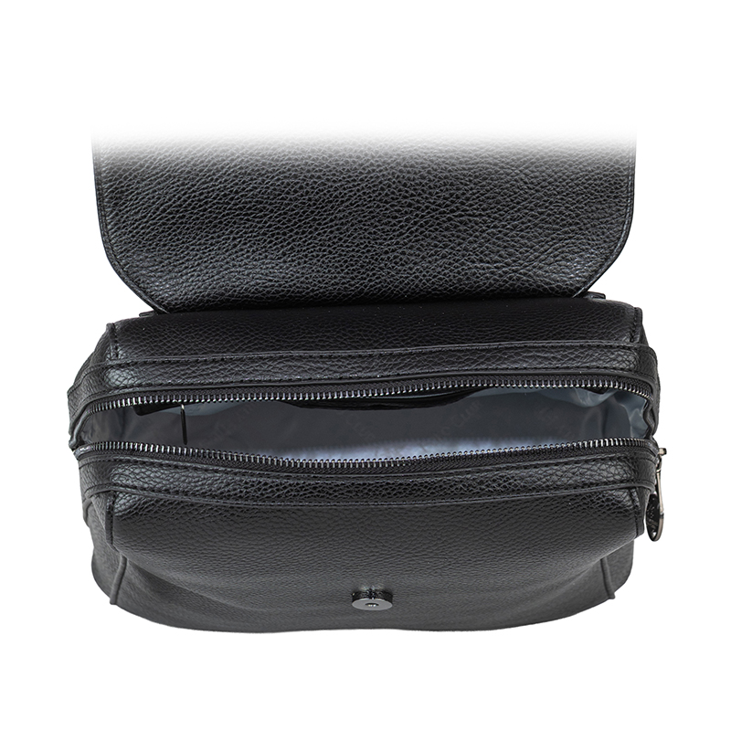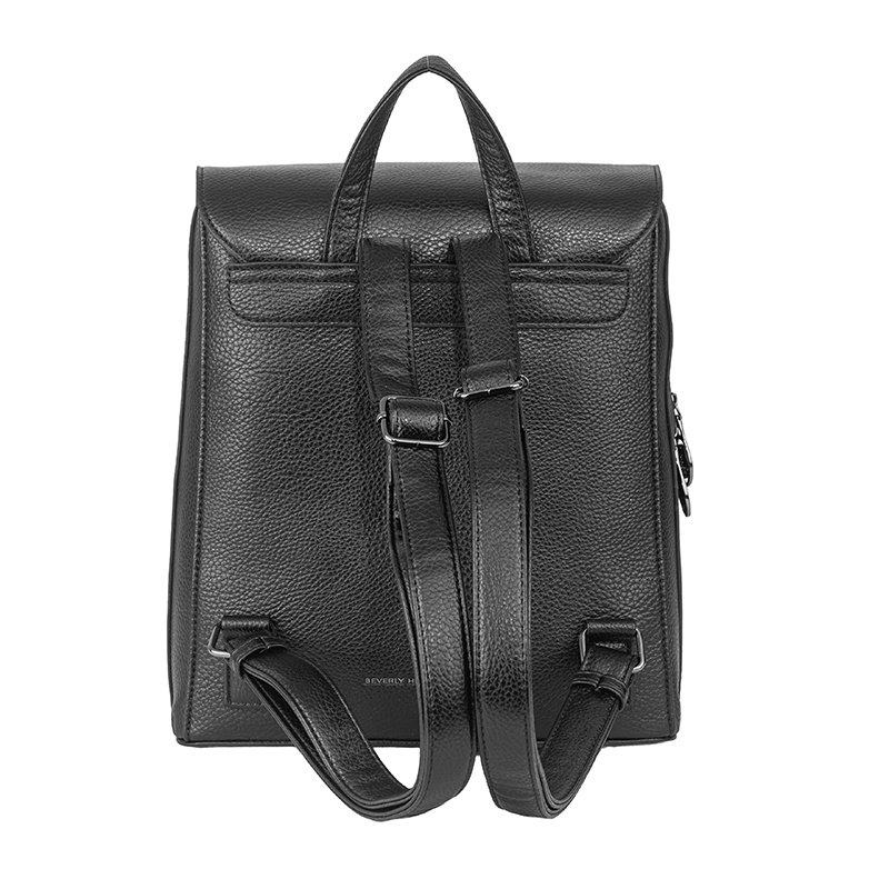 Тази дамска раница от еко кожа впечатлява с изискан дизайн. Стегнатият силует и размерите 26 x 30,5 x 11 см осигуряват достатъчно пространство за портмоне, телефон, несесер и други ежедневни принадлежности, като раницата запазва стилен и подреден вид. Големият капак придава изчистена линия и допълнителна сигурност, а основното отделение е организирано с вътрешни джобчета за по-добър ред. Регулируемите презрамки позволяват удобно напасване според ръста и предпочитанията, а горната дръжка дава възможност раницата да се носи и в ръка. Финото златисто лого Beverly Hills Polo Club в долната част подчертава премиум излъчването и прави модела подходящ както за ежедневни, така и за по-елегантни визии.