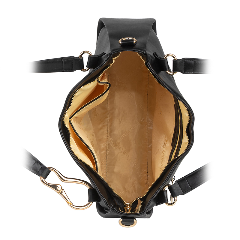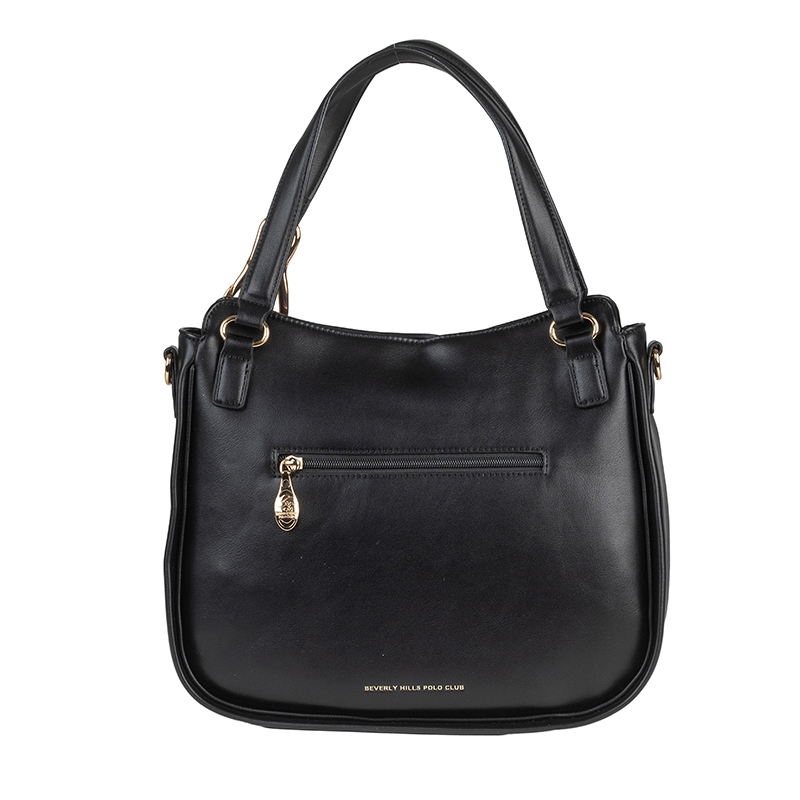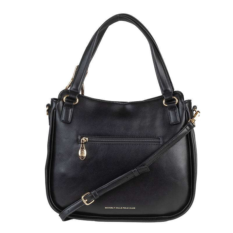Тази дамска чанта впечатлява с изчистен, но много стилен дизайн и мека линия на силуета. Изработена е от висококачествена еко кожа в черен цвят, който лесно се комбинира с различни цветове и стилове облекло. Размерите 33 x 29 x 10 см осигуряват достатъчно пространство за ежедневните необходими вещи – портмоне, телефон, документи, козметична чантичка и други. Основното отделение се затваря сигурно и е организирано с вътрешни джобчета, които помагат всичко да бъде подредено и лесно достъпно. Двете стабилни дръжки позволяват удобно носене на рамо или в ръка, а включената дълга, регулируема презрамка дава възможност за носене и „crossbody“. Дискретното златисто лого Beverly Hills Polo Club отпред добавя фин луксозен акцент и подчертава премиум характера на модела.