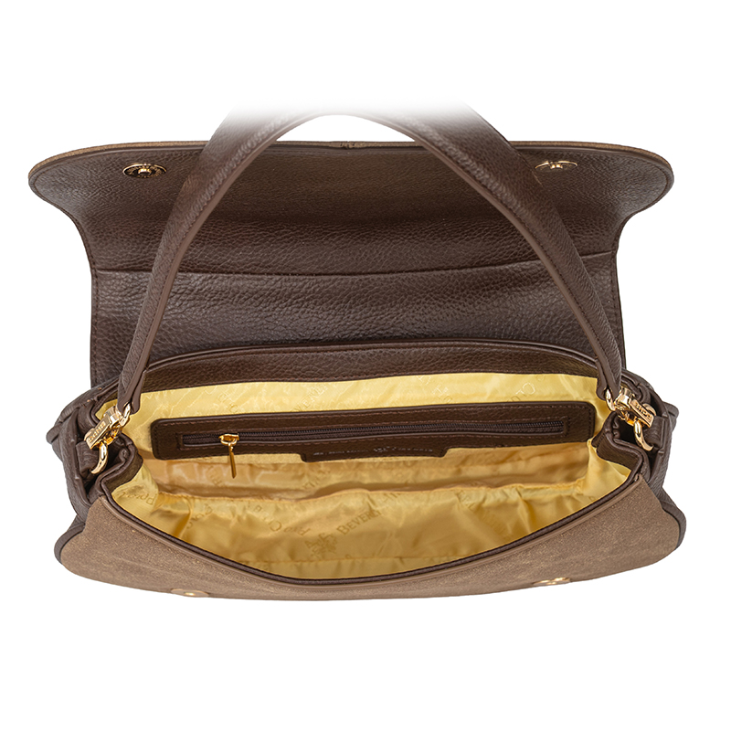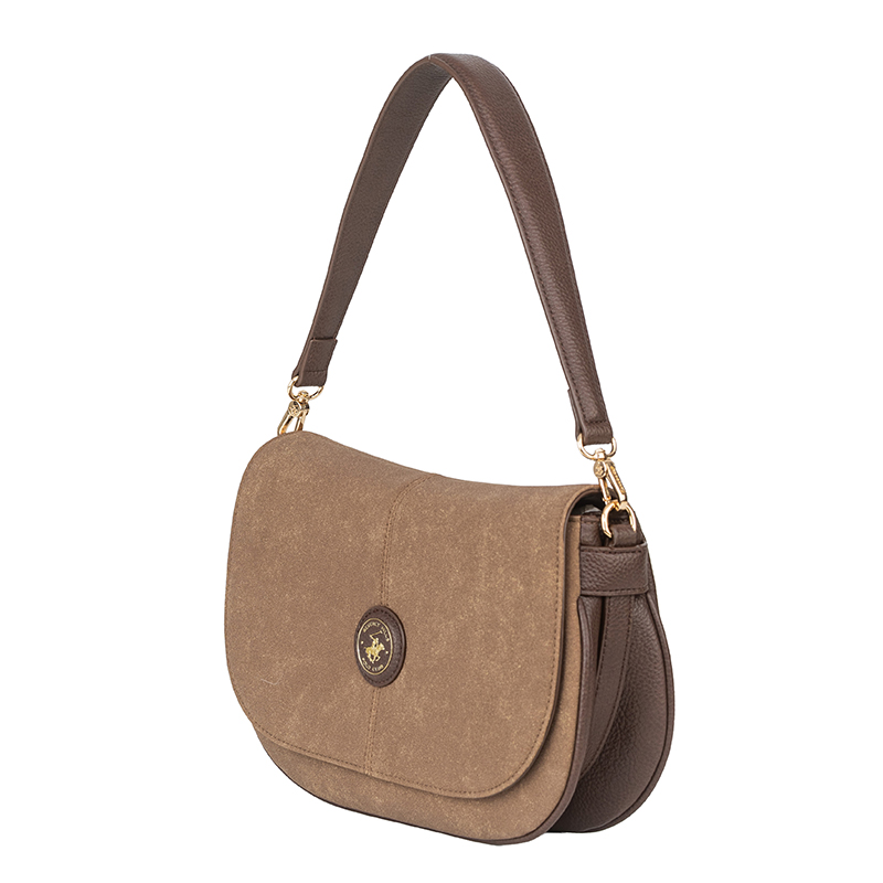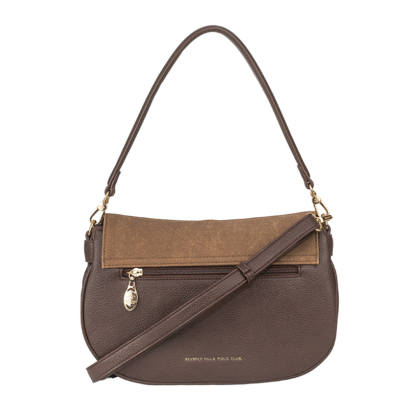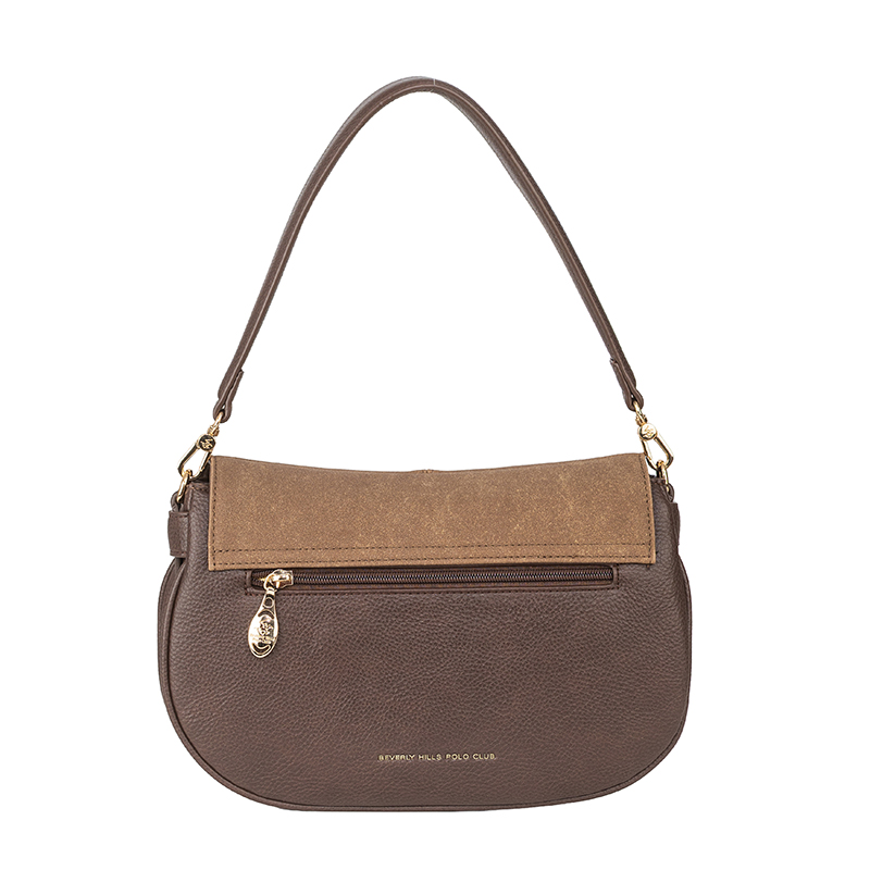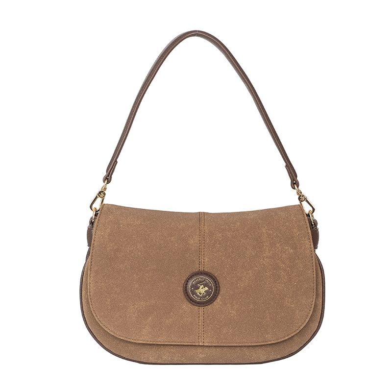 Тази дамска чанта е с елегантна полулунична форма и мек силует, който приляга комфортно към тялото. Външната част наподобява велурена текстура, а дръжката и регулируемата дълга презрамка са в по-тъмен тон за стилен контраст. Компактните размери 29 x 19 x 10 см я правят идеален избор както за ежедневие, така и за излизане вечер. Закопчаването е с цип под капак, което осигурява сигурност на съдържанието, а вътрешното отделение е достатъчно просторно за портфейл, телефон, ключове и други необходими вещи. Кръглото лого Beverly Hills Polo Club отпред завършва излъчването с фин, марков акцент.