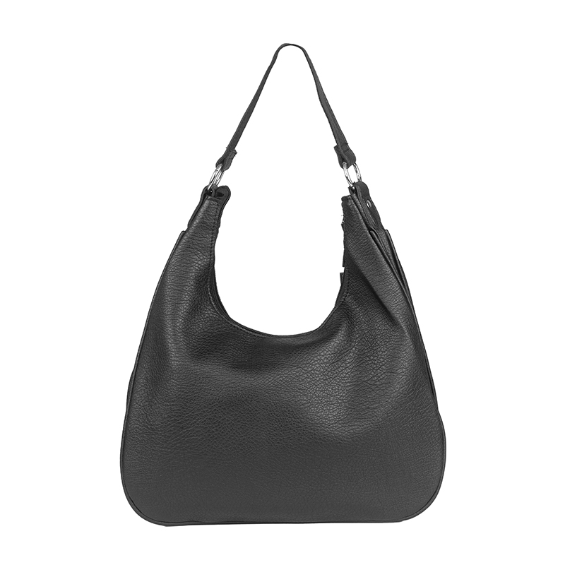 Тази дамска чанта в черен цвят впечатлява с модерна полукръгла форма „hobo“, която пада красиво по рамото. На лицевата страна е разположен практичен джоб с цип за бърз достъп до телефон или ключове, декориран с малък, сваляем калъф в същия стил – идеален за монети или слушалки. Основното отделение се затваря с цип и предлага достатъчно пространство за портфейл, документи и ежедневните ви принадлежности.