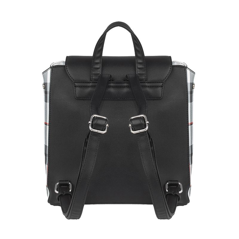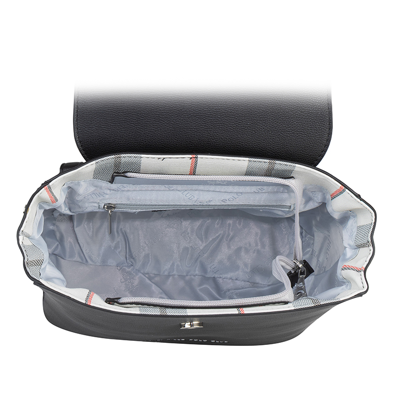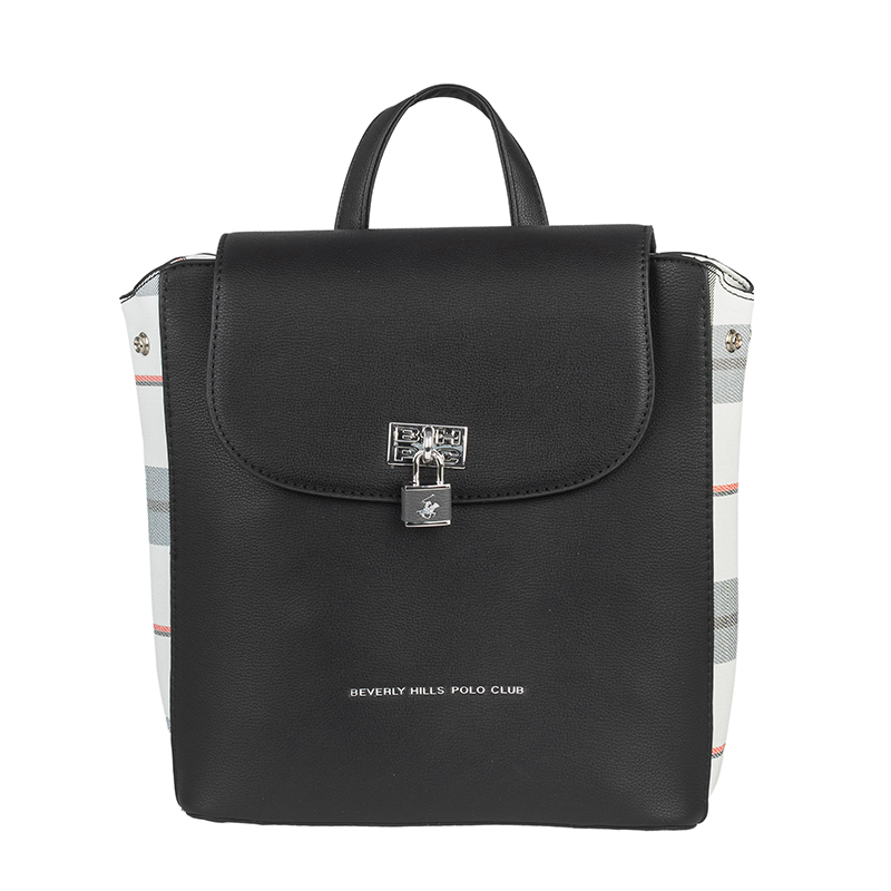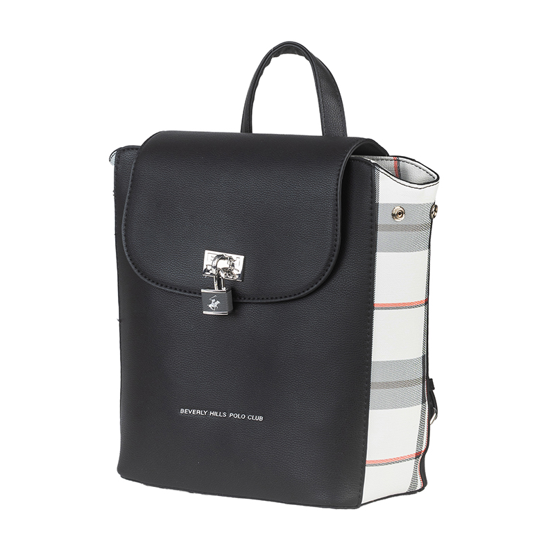 Тази дамска раница в черен цвят е изработена от висококачествена еко кожа и впечатлява с елегантна и същевременно младежка визия. Гладкият преден капак с метално закопчаване придава изчистен силует, а страничните панели в каре добавят модерен акцент. Компактните размери 23 x 27 x 12 см я правят идеална за ежедневни разходки, работа или уикенд пътувания. Регулируемите презрамки позволяват удобно напасване според предпочитанията, а горната дръжка дава възможност раницата да се носи и в ръка. Дискретното златисто лого Beverly Hills Polo Club отпред подчертава премиум характера на модела и го прави лесен за комбиниране както с ежедневни, така и с по-елегантни тоалети.
