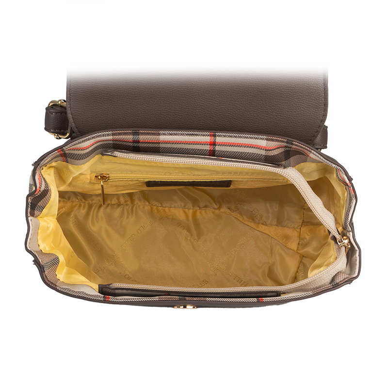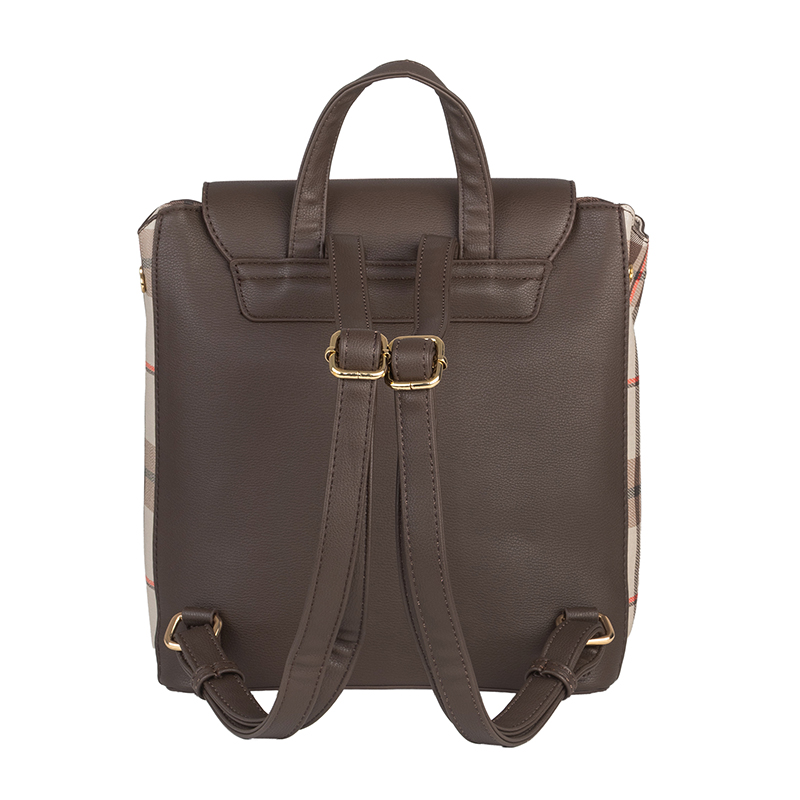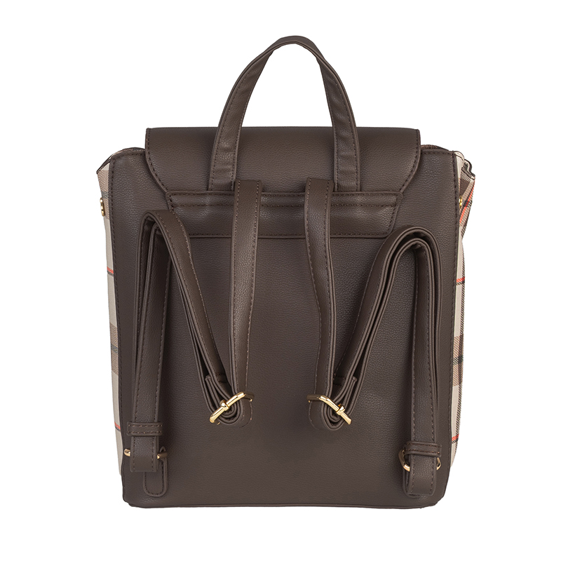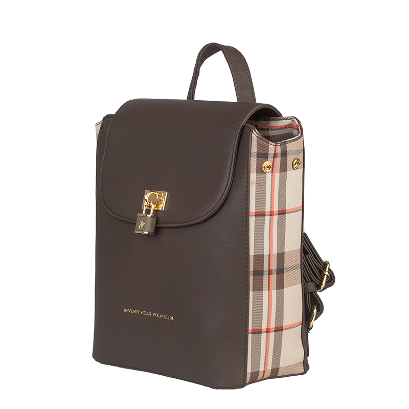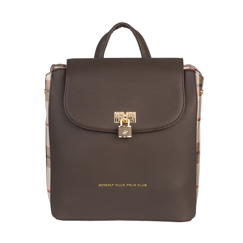 Тази дамска раница в кафяв цвят е изработена от висококачествена еко кожа и впечатлява с елегантна и същевременно младежка визия. Гладкият преден капак с метално закопчаване придава изчистен силует, а страничните панели в каре добавят модерен акцент. Компактните размери 23 x 27 x 12 см я правят идеална за ежедневни разходки, работа или уикенд пътувания. Регулируемите презрамки позволяват удобно напасване според предпочитанията, а горната дръжка дава възможност раницата да се носи и в ръка. Дискретното златисто лого Beverly Hills Polo Club отпред подчертава премиум характера на модела и го прави лесен за комбиниране както с ежедневни, така и с по-елегантни тоалети.