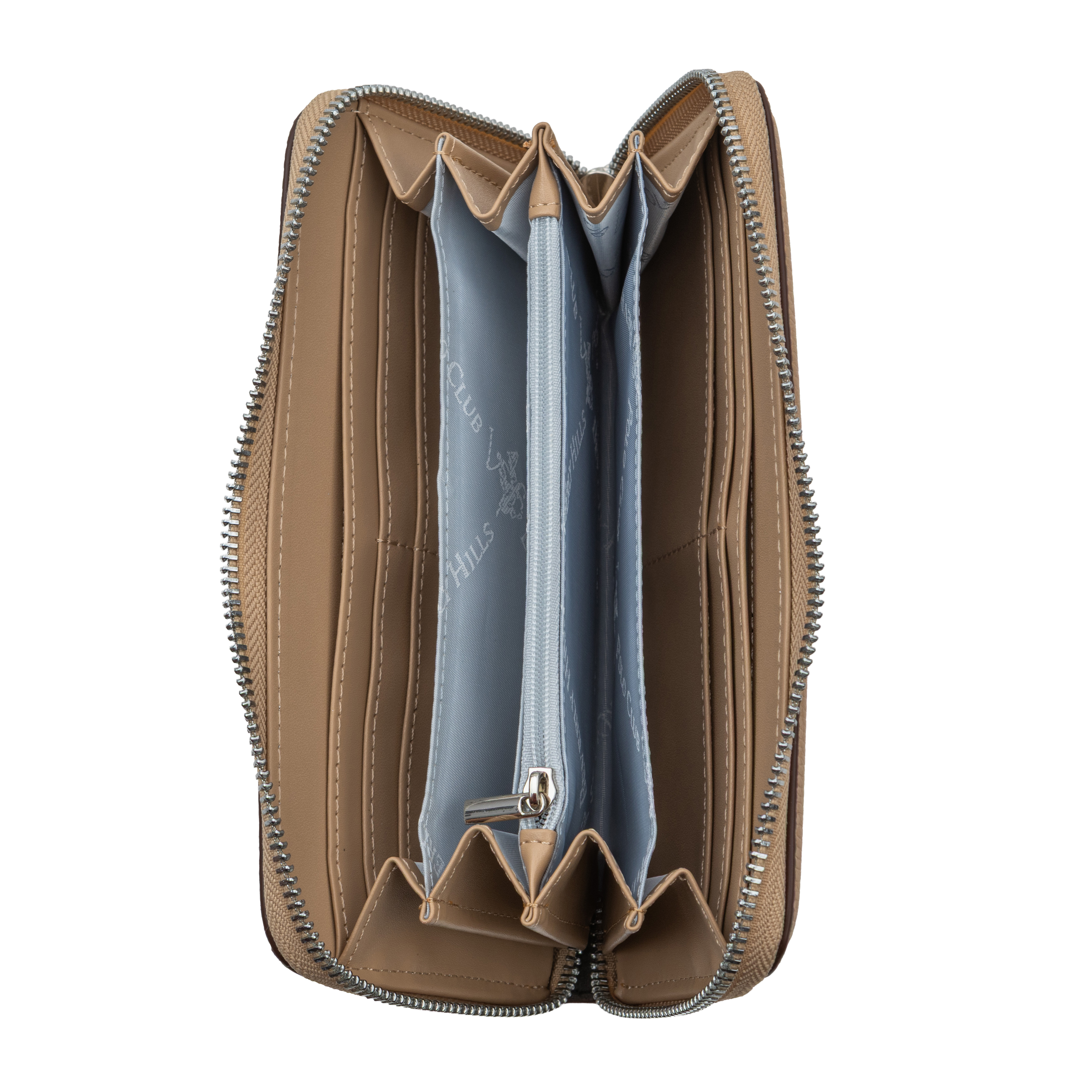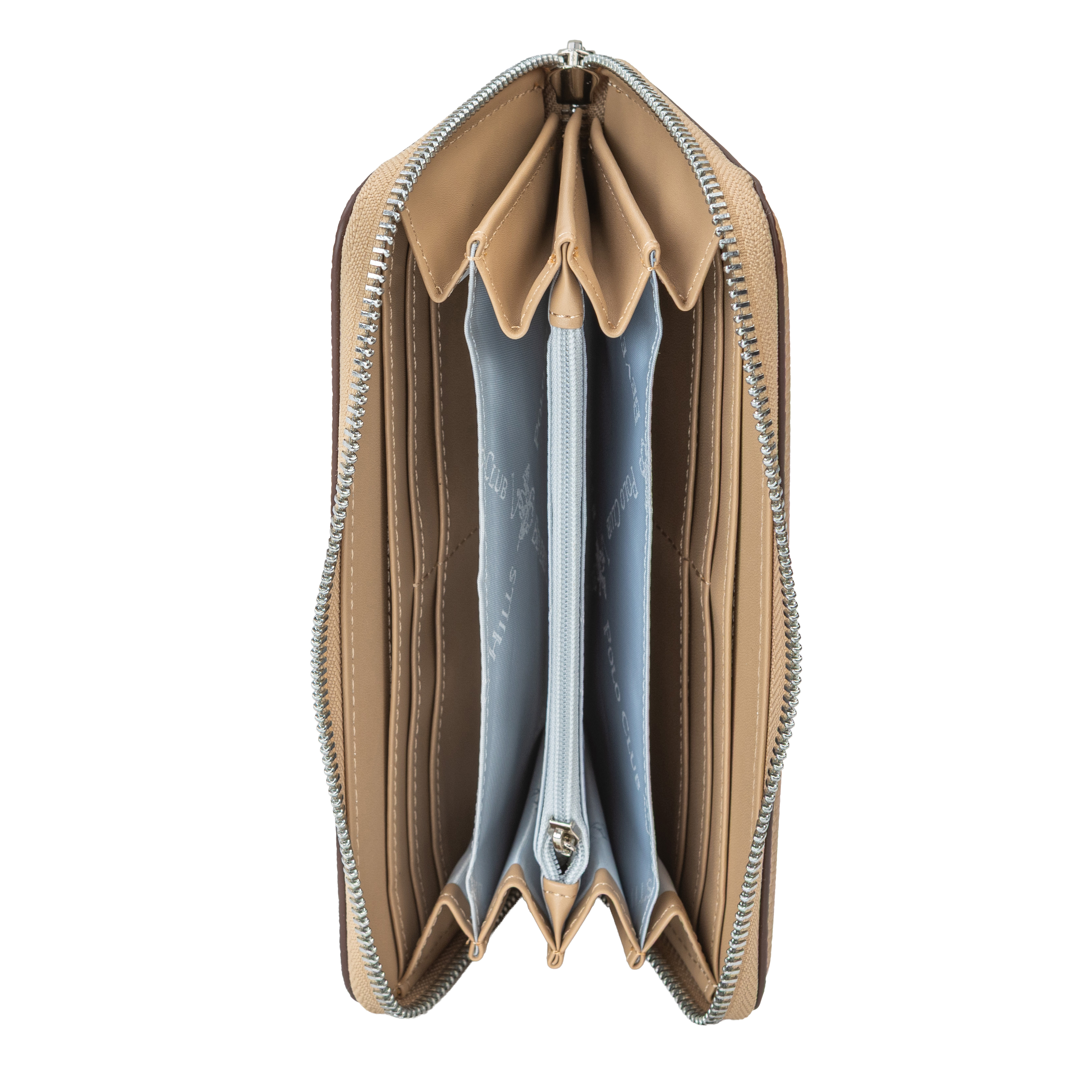Това дамско портмоне от еко кожа в нежно бежово е стилен акцент към всяка дамска чанта. Моделът е с изчистена правоъгълна форма и обиколен цип, който осигурява сигурно затваряне и предпазва съдържанието. Вътрешността е тип „акордеон“ с няколко отделения, които позволяват лесно разделяне на банкноти, карти и бележки. Еко кожата е приятна на допир и се поддържа лесно, а дискретното лого на Beverly Hills Polo Club придава завършен, луксозен вид.