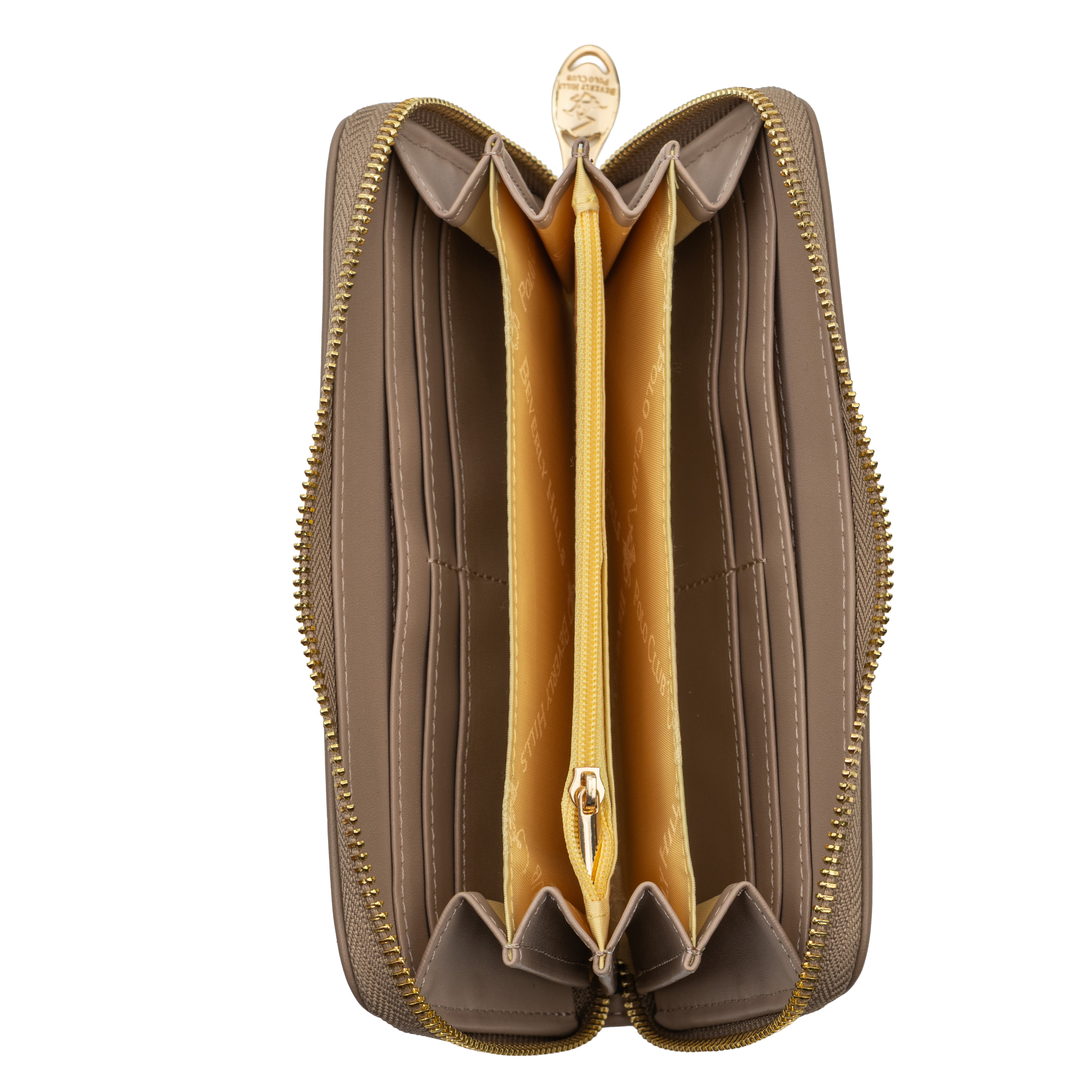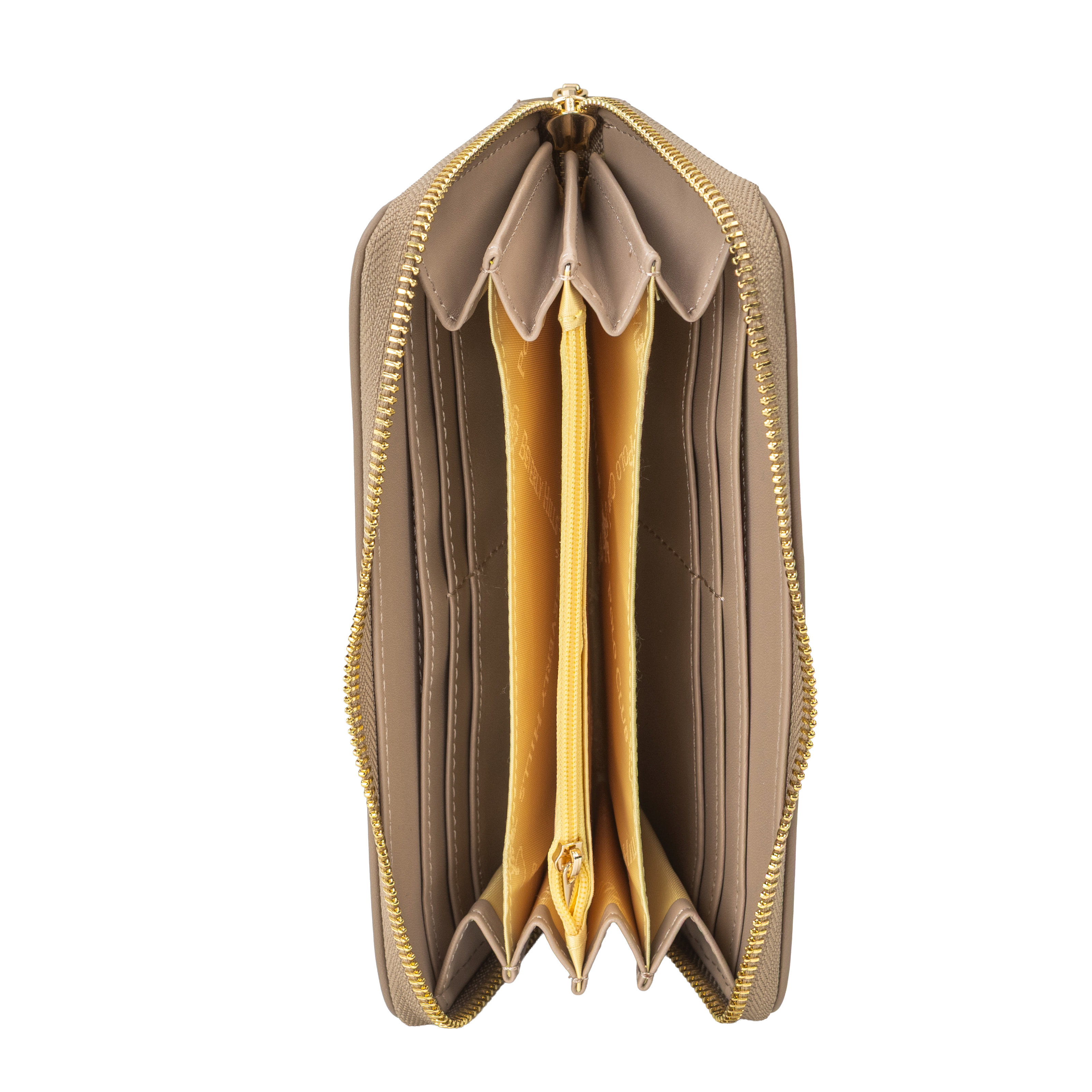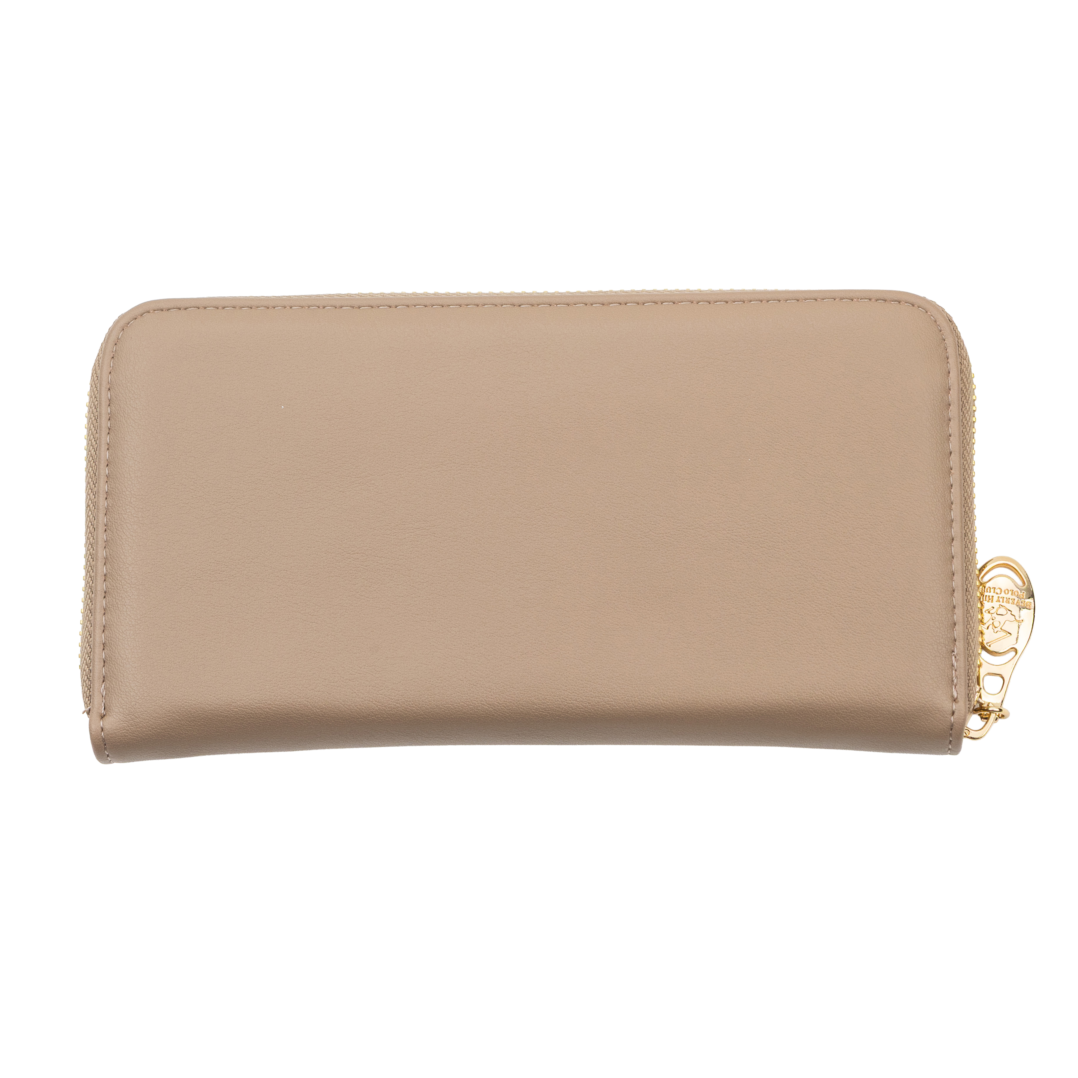 Това дамско портмоне от еко кожа впечатлява с нежен бежов цвят и изчистения правоъгълен силует. Обиколният цип осигурява надеждно затваряне и предпазва съдържанието, а вътрешността е организирана с няколко разширяващи се отделения за банкноти, карти, документи и бележки. Меката на допир еко кожа се поддържа лесно и запазва свежия си вид при ежедневна употреба. Голямото релефно лого на Beverly Hills Polo Club на предната част придава стилен акцент и превръща портмонето в красив завършек на всяка дамска визия – и в отличен избор за подарък.