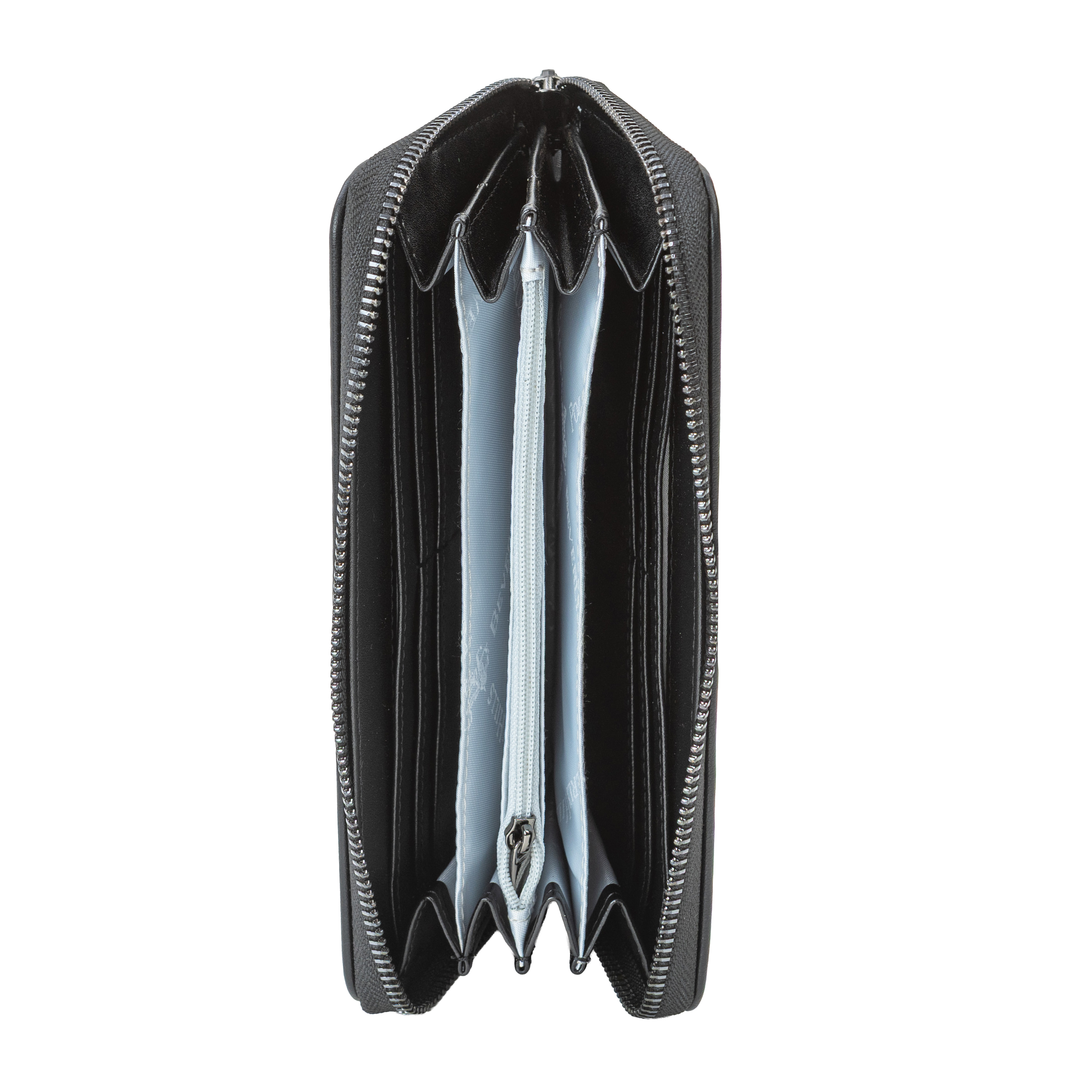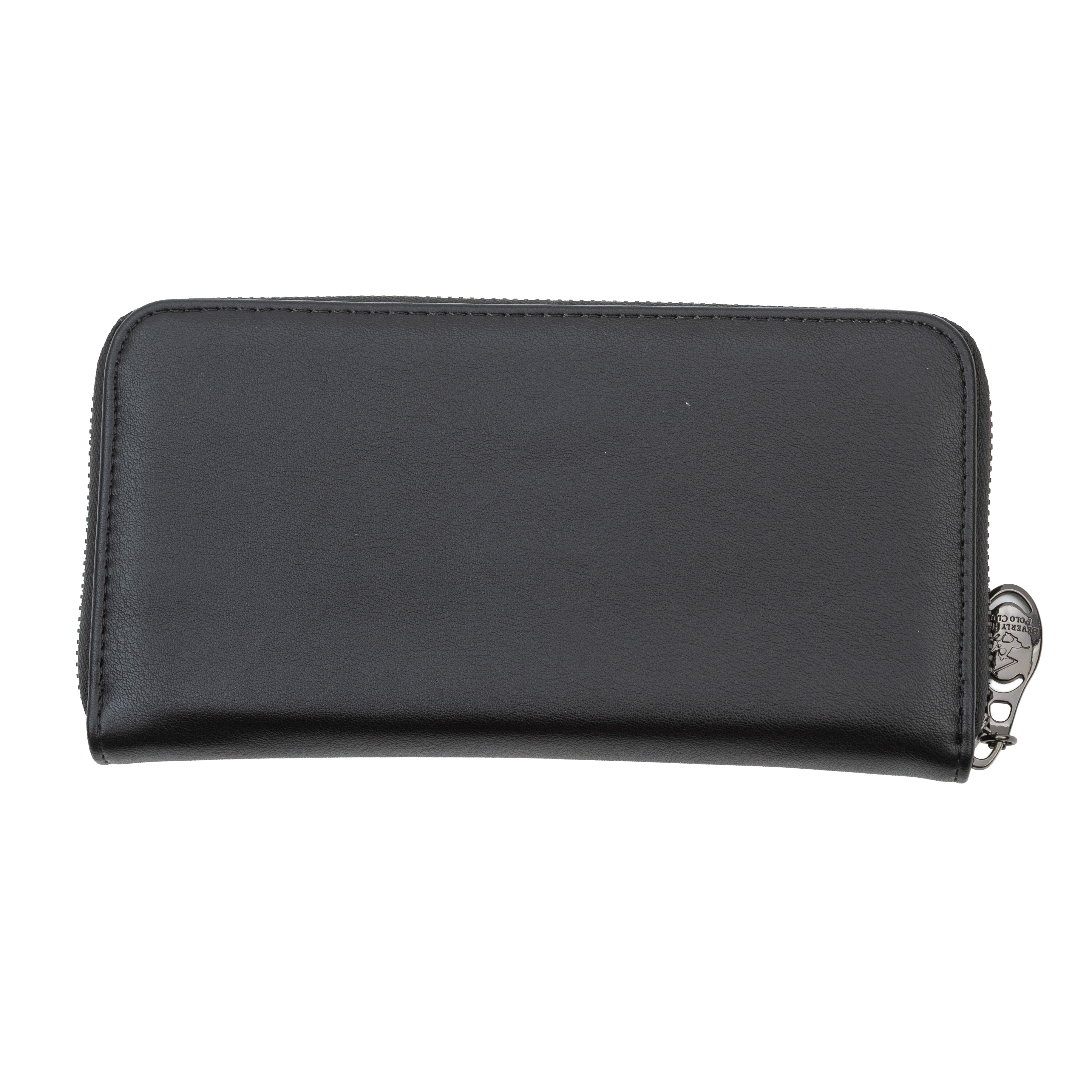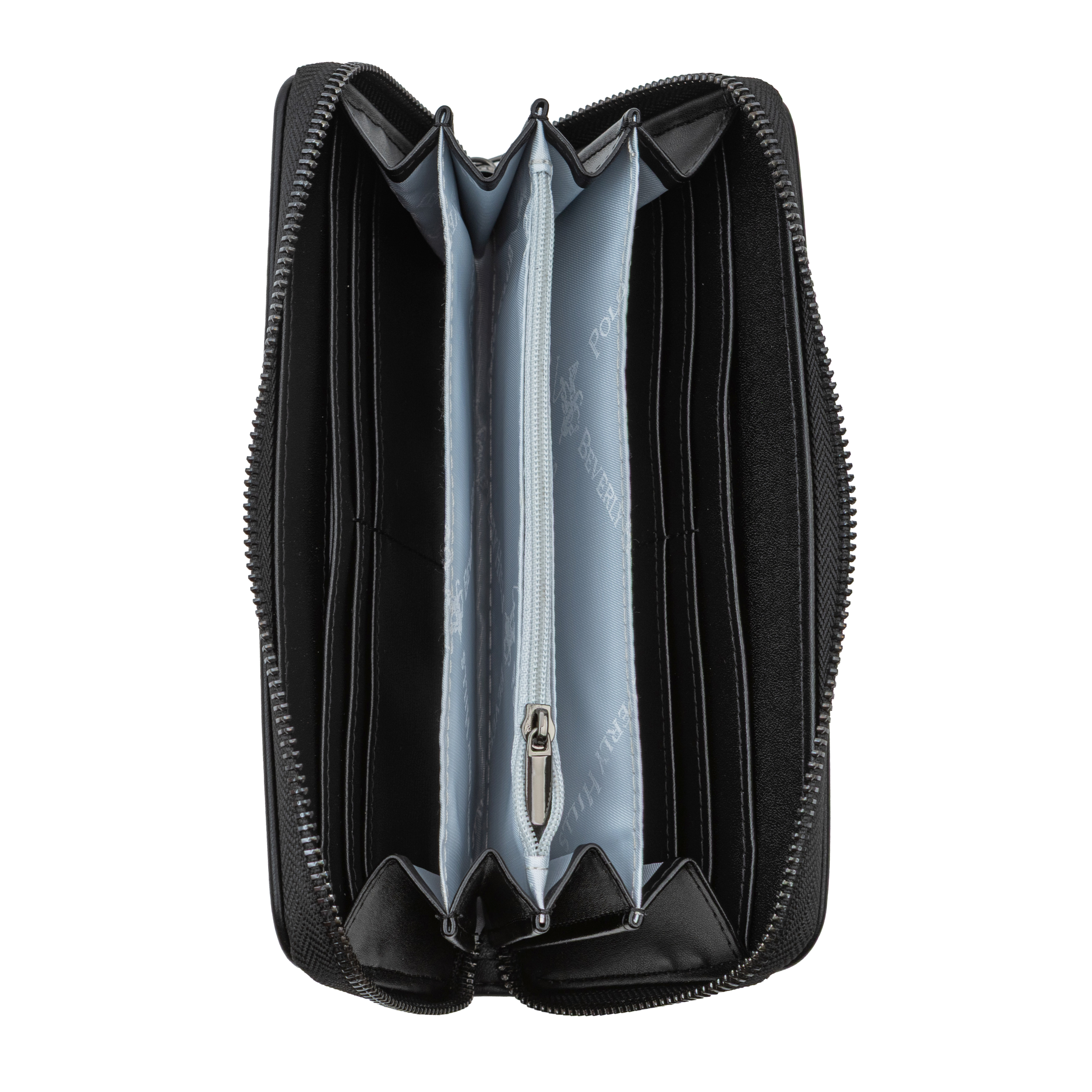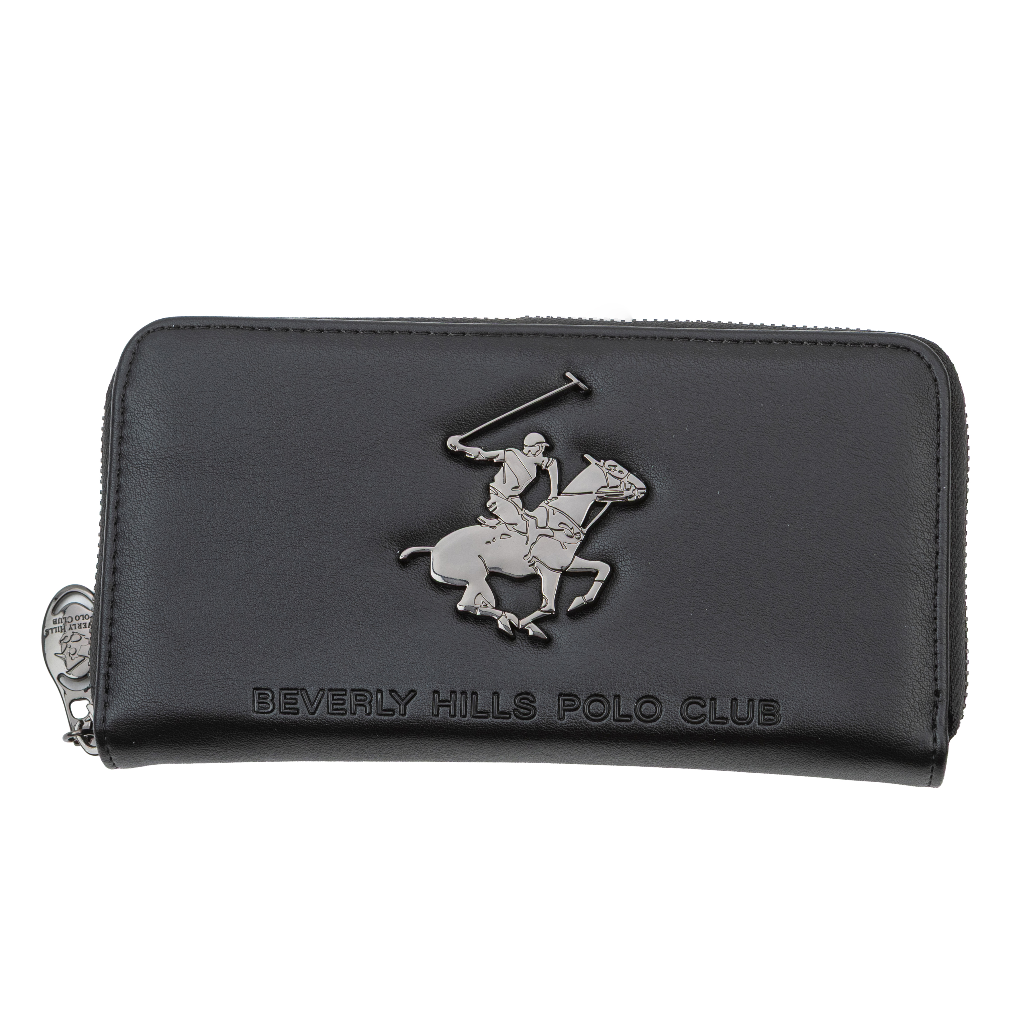 Това дамско портмоне от еко кожа впечатлява с класически черен цвят и изчистения правоъгълен силует. Обиколният цип осигурява надеждно затваряне и предпазва съдържанието, а вътрешността е организирана с няколко разширяващи се отделения за банкноти, карти, документи и бележки. Меката на допир еко кожа се поддържа лесно и запазва свежия си вид при ежедневна употреба. Голямото релефно лого на Beverly Hills Polo Club на предната част придава стилен акцент и превръща портмонето в красив завършек на всяка дамска визия – и в отличен избор за подарък.