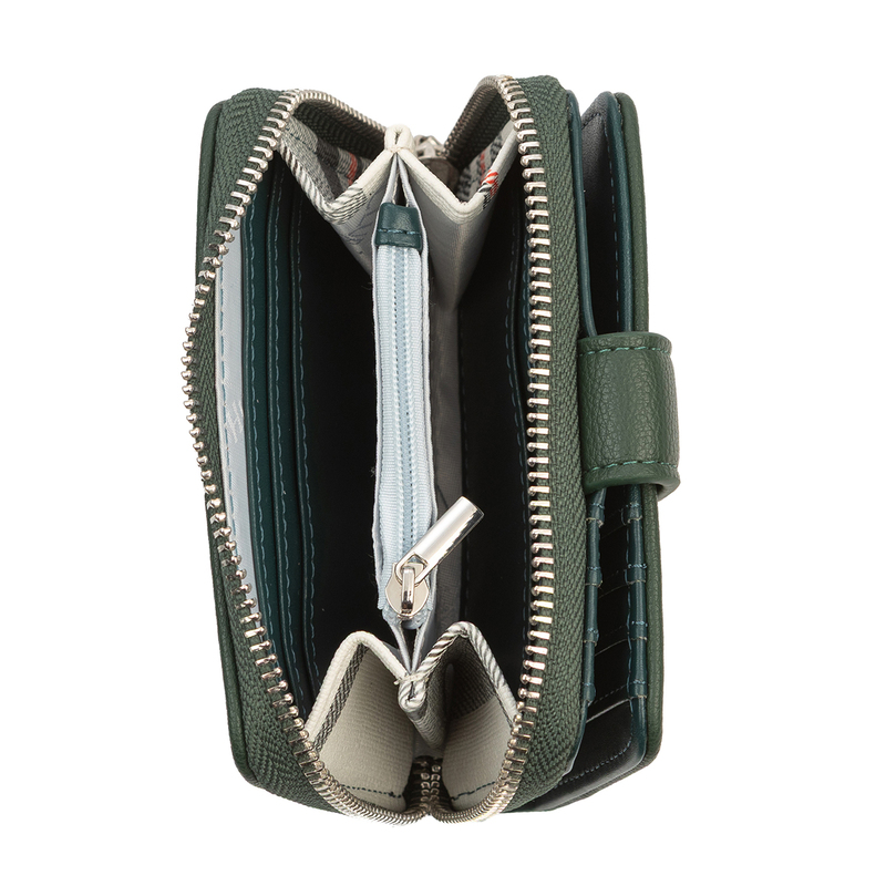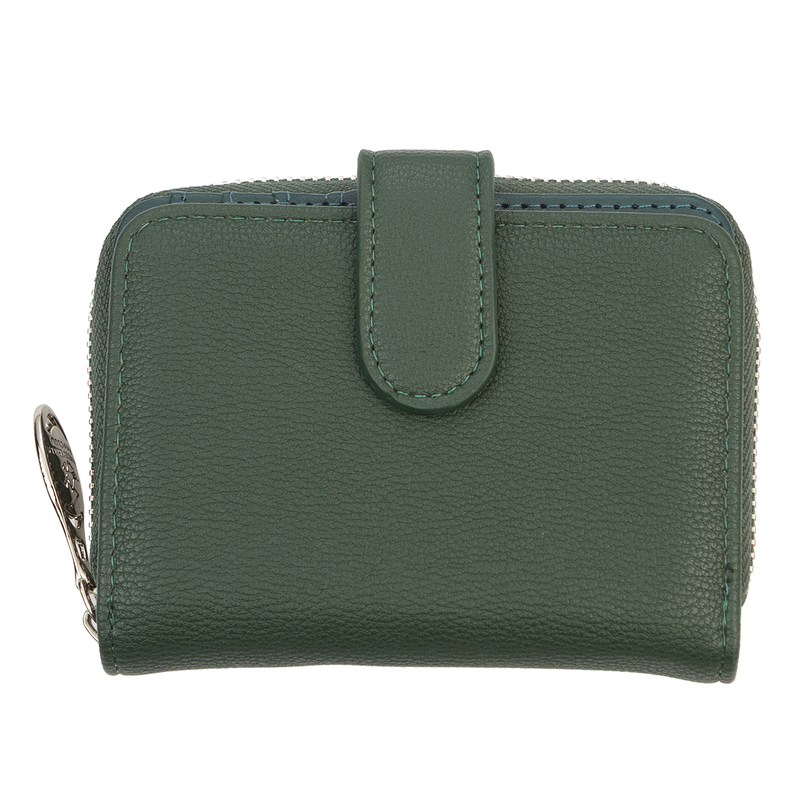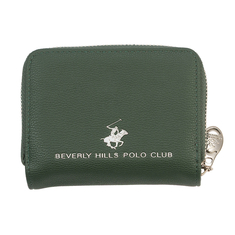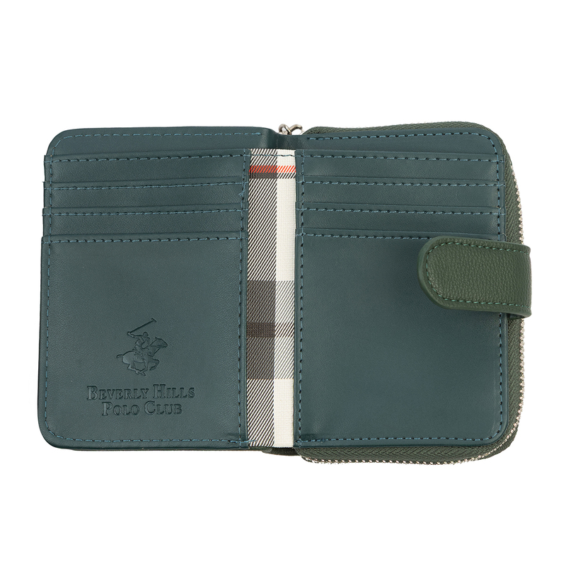 Това дамско портмоне от еко кожа в зелен цвят е идеалният избор за дами, които търсят едновременно компактност и добра организация. Правоъгълната форма и размерите 10,2 x 12 x 2,5 см позволяват лесно прибиране във всяка дамска чанта или дори носене в ръка. Вътрешната част съдържа няколко отделения за карти, място за лични документи и отделение за банкноти, а интегрираният монетник с цип съхранява сигурно дребните пари. Фините декоративни шевове, златистото лого на Beverly Hills Polo Club и меката на допир еко кожа придават изискан характер на аксесоара.