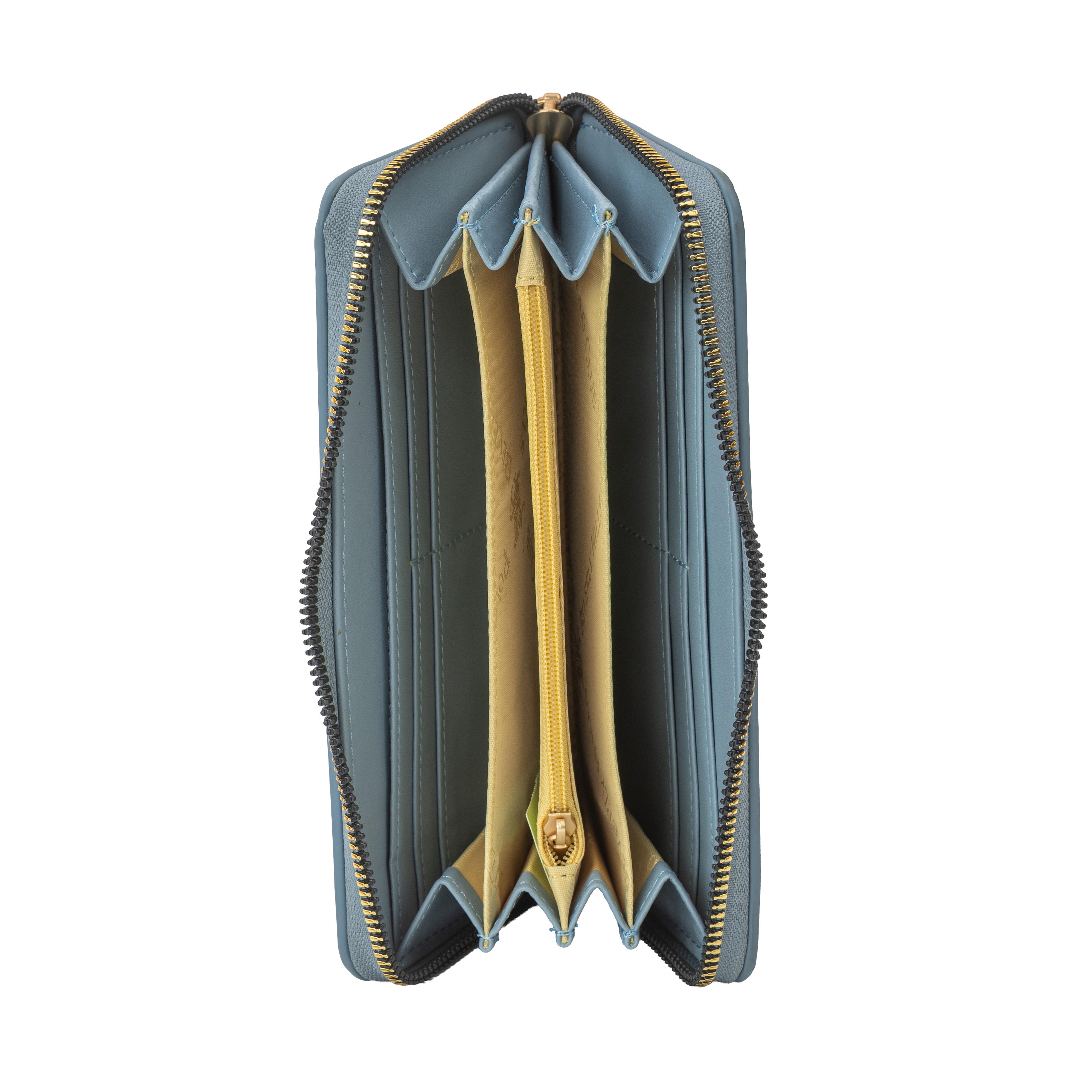 Това дамско портмоне е изработено от еко кожа и полиестер и впечатлява с изчистения си силует. Обиколният цип осигурява надеждно затваряне и защита на съдържанието, а вътрешната част е организирана с няколко разширяващи се отделения за банкноти, карти, документи и бележки. Компактната, но практична форма позволява портмонето да се носи както в по-голяма чанта, така и самостоятелно в ръка като стилен аксесоар.