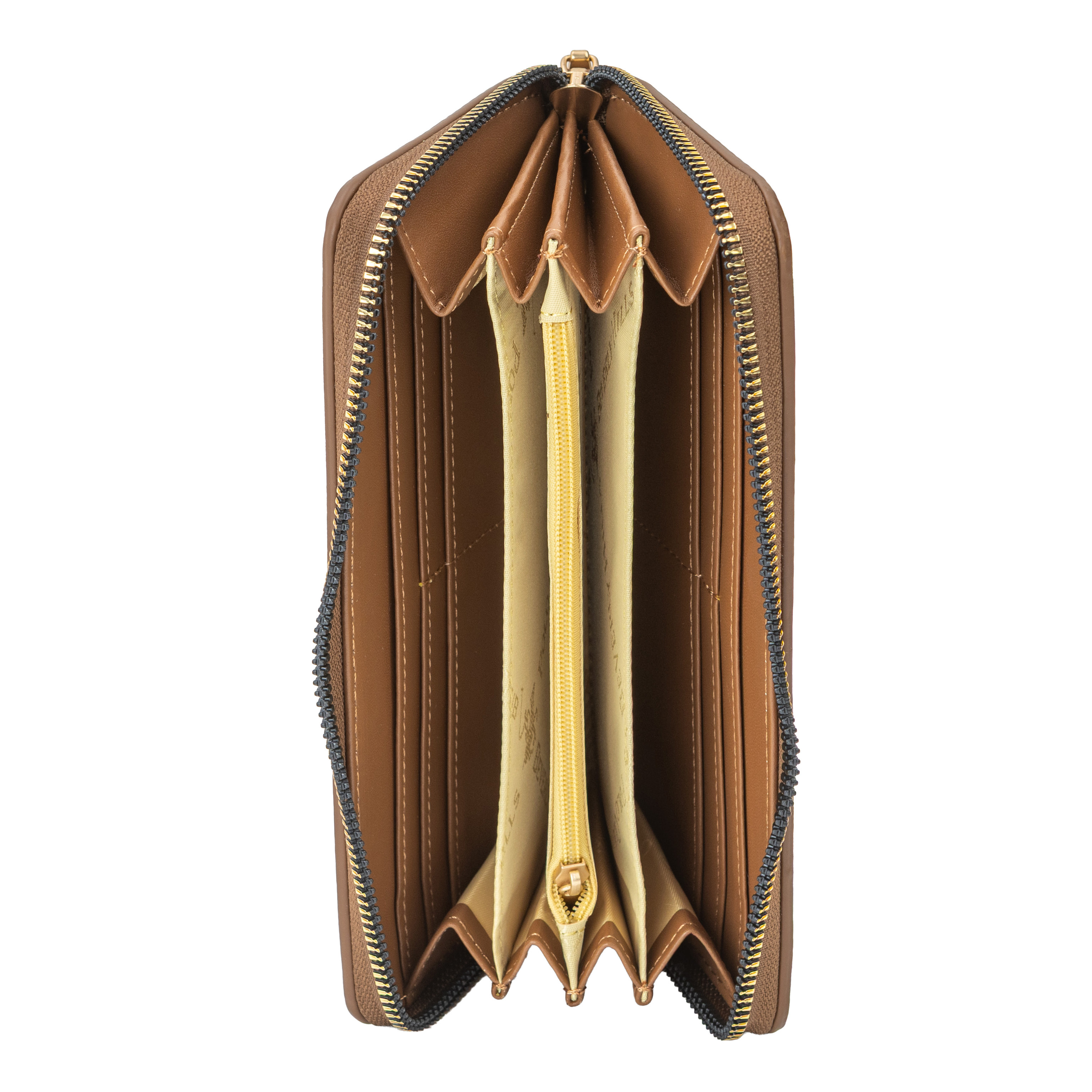 Това дамско портмоне е изработено от еко кожа и полиестер и впечатлява с изчистения си силует. Обиколният цип осигурява надеждно затваряне и защита на съдържанието, а вътрешната част е организирана с няколко разширяващи се отделения за банкноти, карти, документи и бележки. Компактната, но практична форма позволява портмонето да се носи както в по-голяма чанта, така и самостоятелно в ръка като стилен аксесоар.