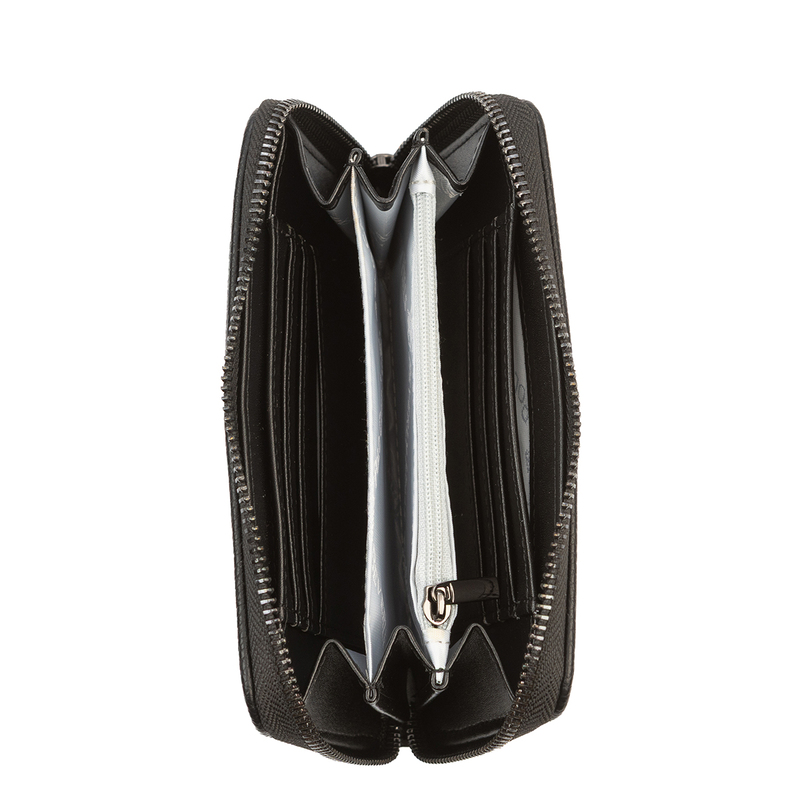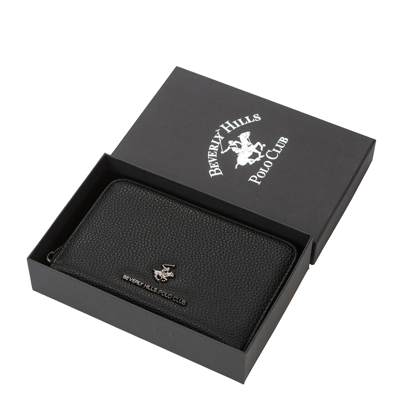 Това дамско портмоне от еко кожа впечатлява с компактна правоъгълна форма и свежо излъчване. Моделът е с удобен обиколен цип, който защитава съдържанието и позволява портмонето да се отваря широко за максимално удобство. Вътрешността е организирана с няколко разширяващи се отделения, подходящи за подредба на банкноти, карти, документи и бележки, а централното отделение може да се използва и за монети. Дискретното златисто лого Beverly Hills Polo Club в предната част придава изискан акцент и превръща портмонето в чудесен подарък.