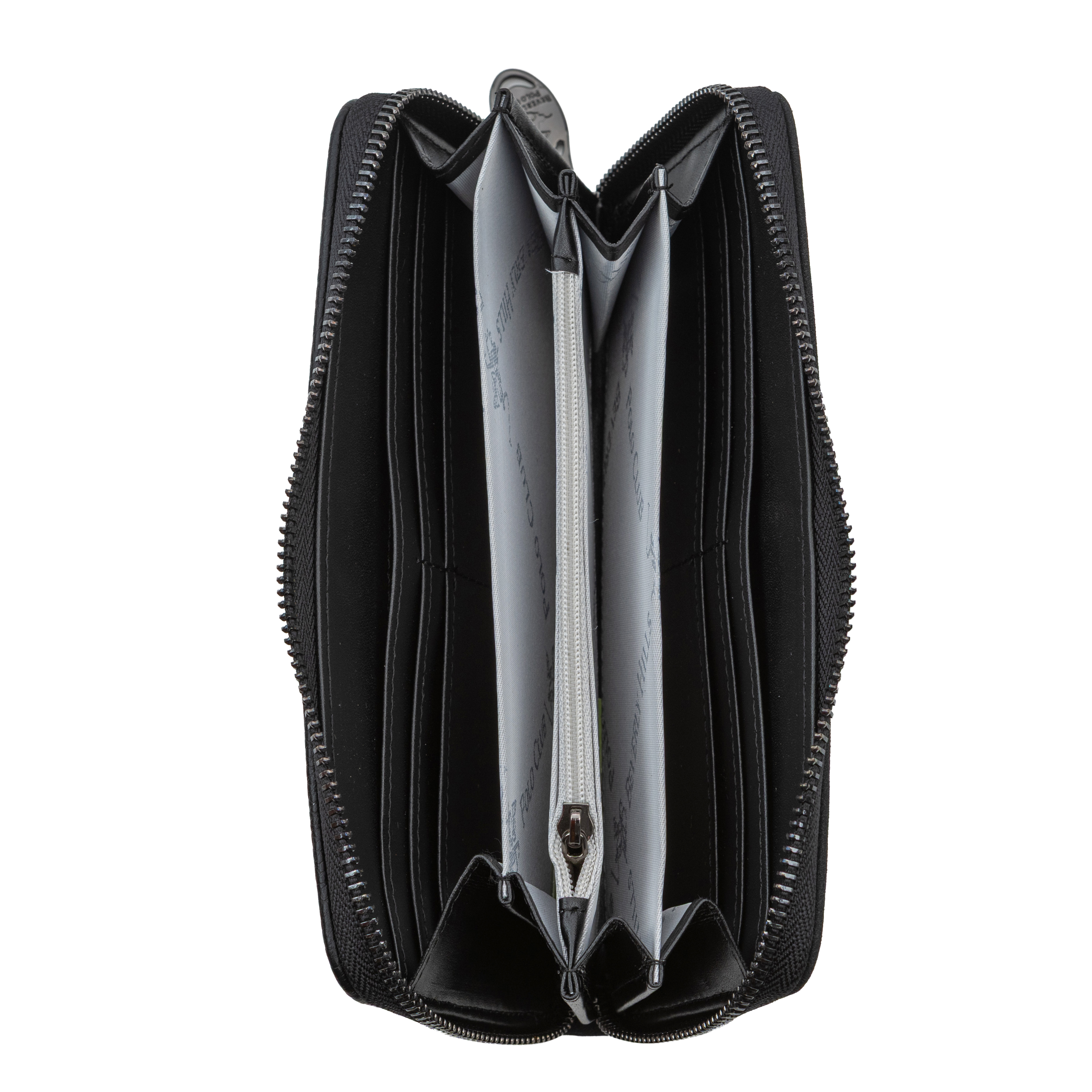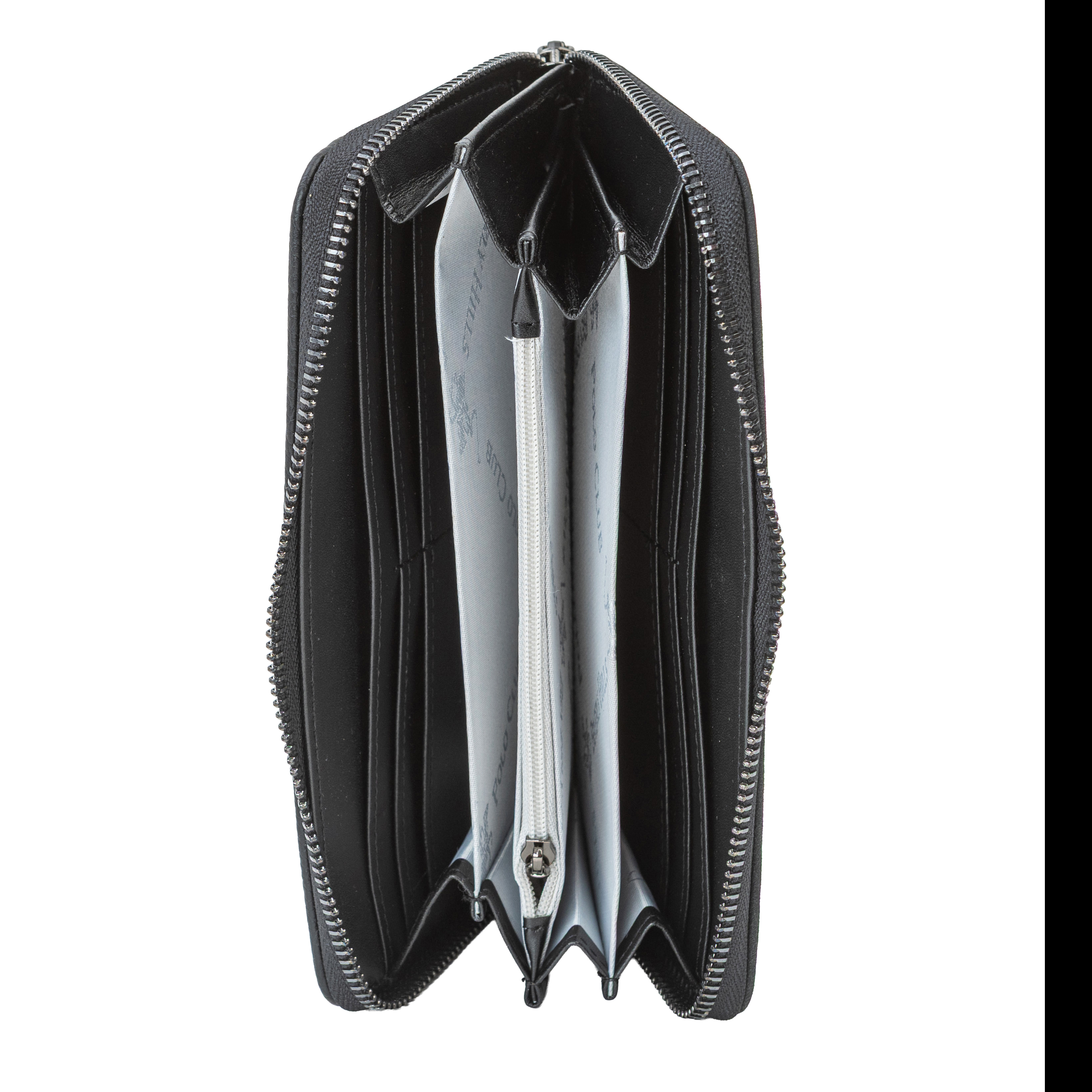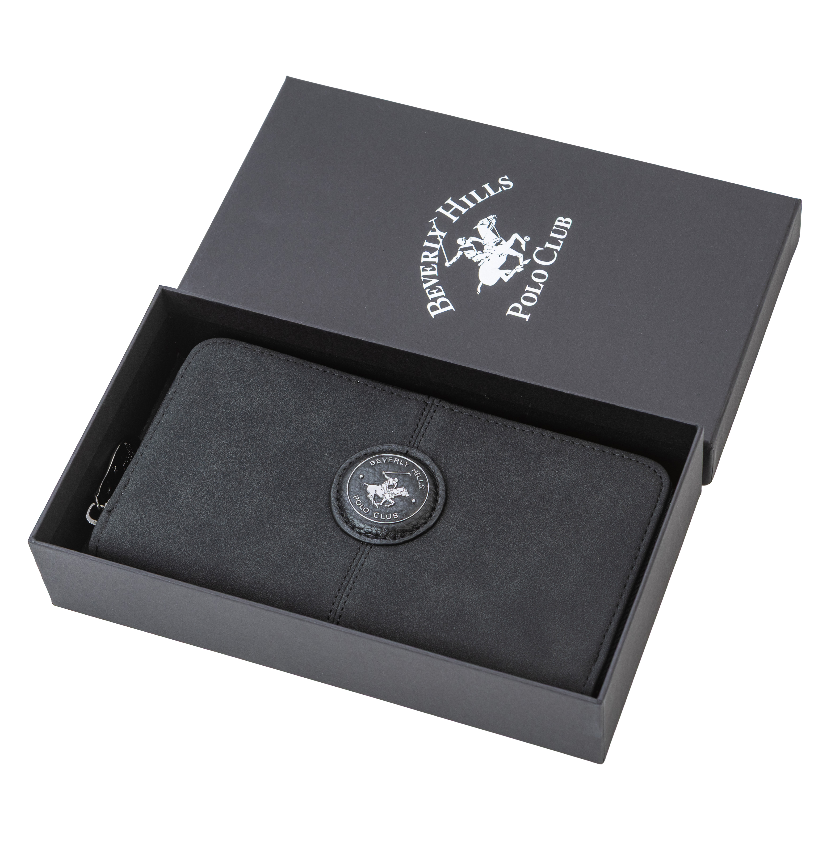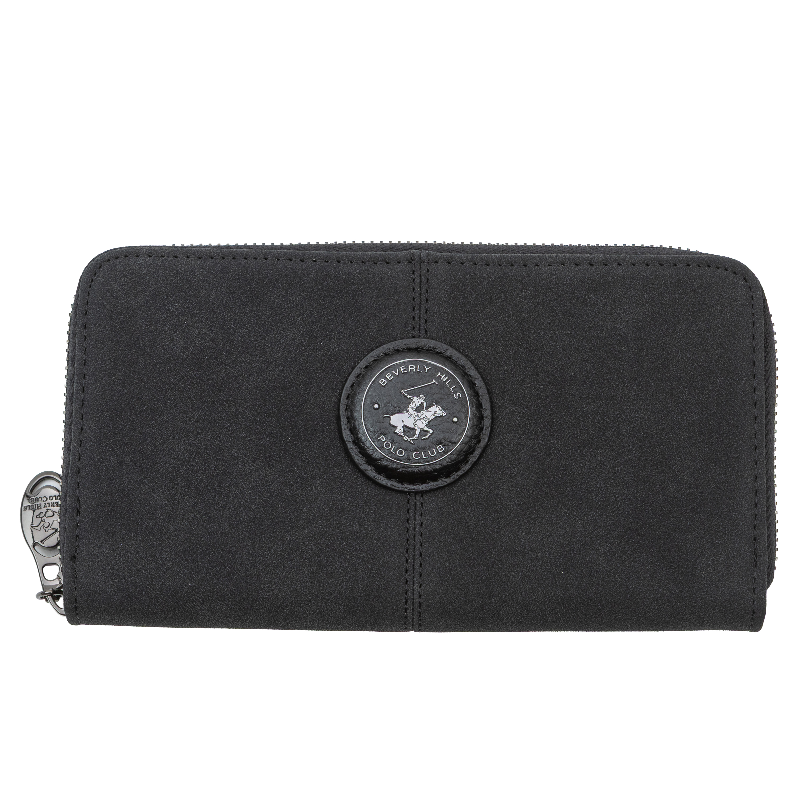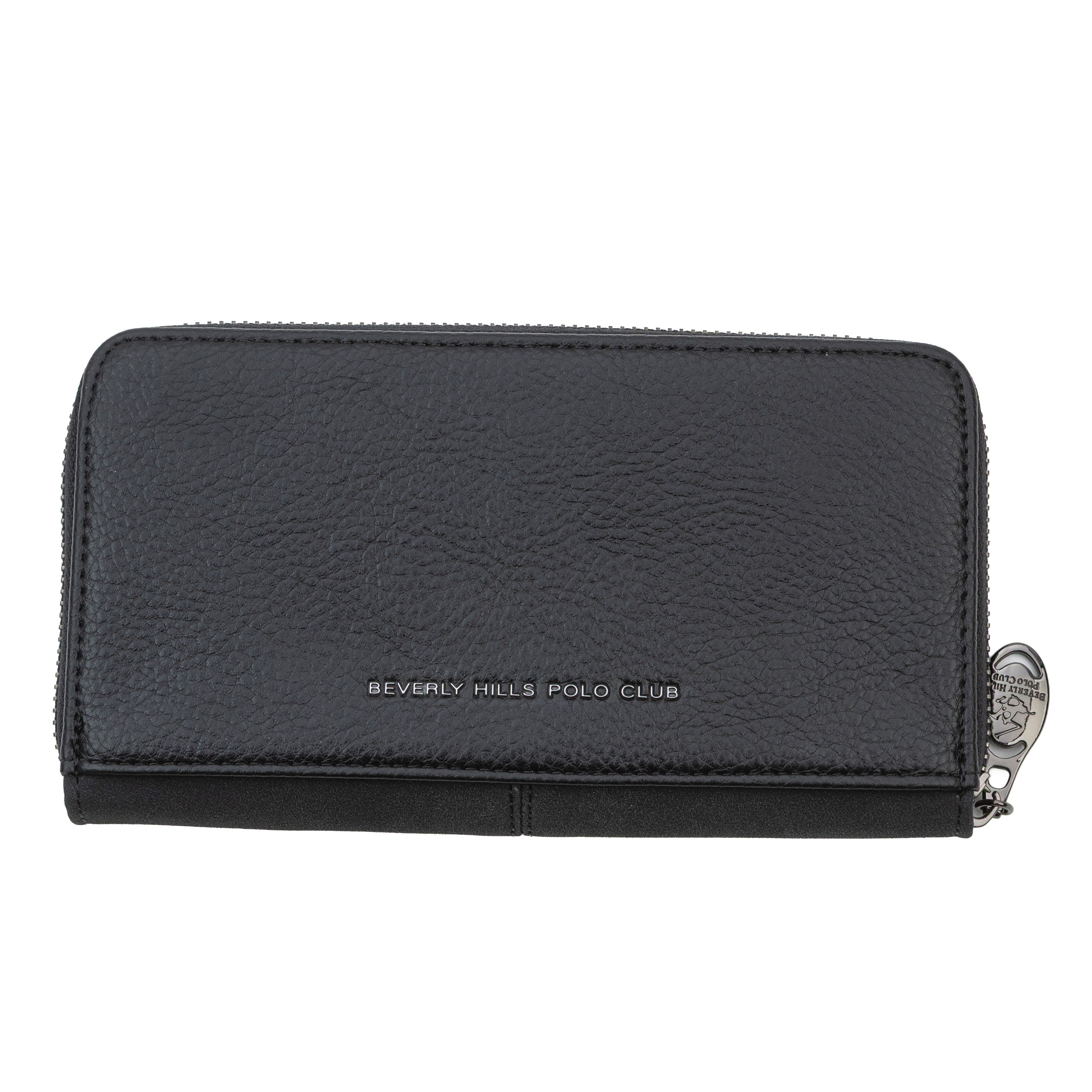 Това дамско портмоне от еко кожа впечатлява с класически силует в черен цвят, който лесно се комбинира с различни дамски чанти. Моделът е с обиколен цип, който осигурява надеждна защита на съдържанието и позволява портмонето да се отваря широко за максимално удобство. Вътрешността е организирана с няколко разширяващи се отделения, подходящи за подредба на банкноти, карти, документи и бележки, както и централно отделение, в което могат да се съхраняват монети. Декоративният кръгъл медальон с логото на Beverly Hills Polo Club придава изискан, леко винтидж акцент и превръща портмонето в красив завършек на всяка визия или готов подарък в комплект с дамска чанта.