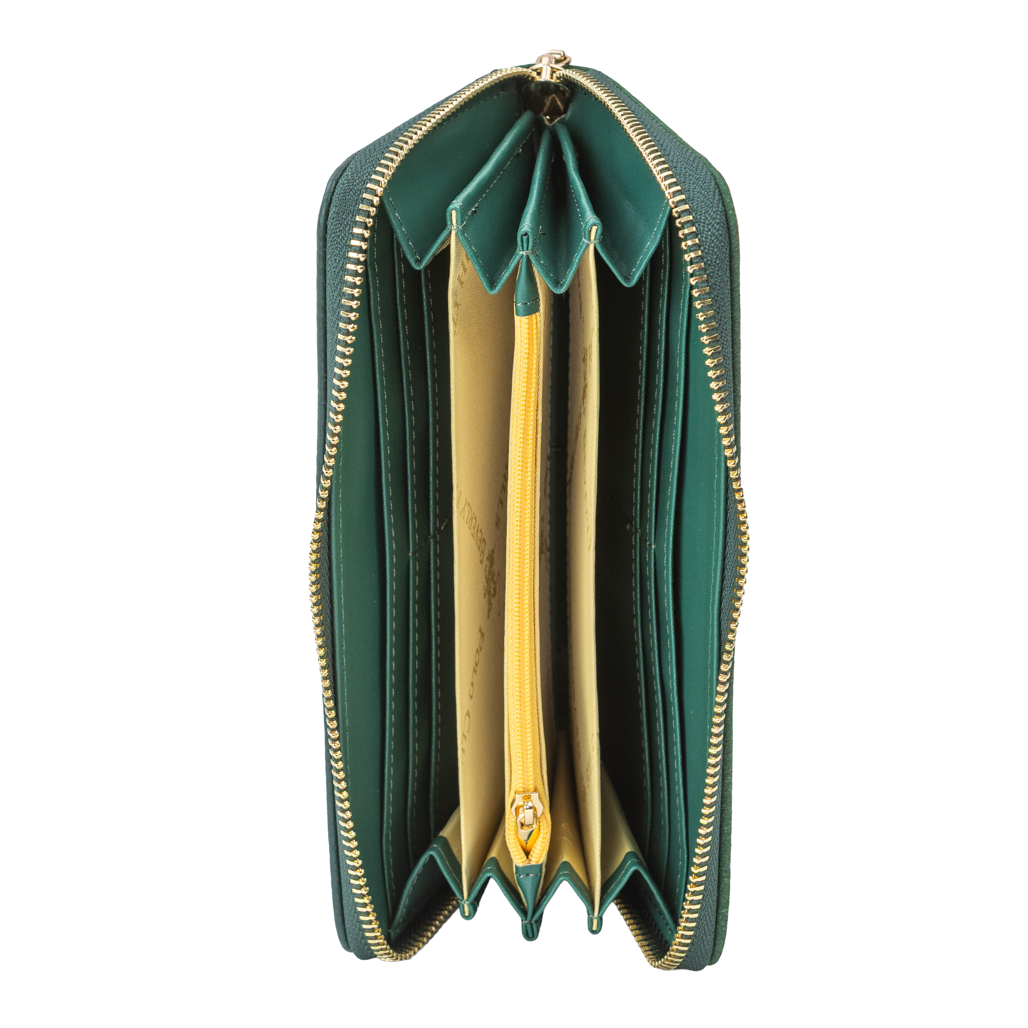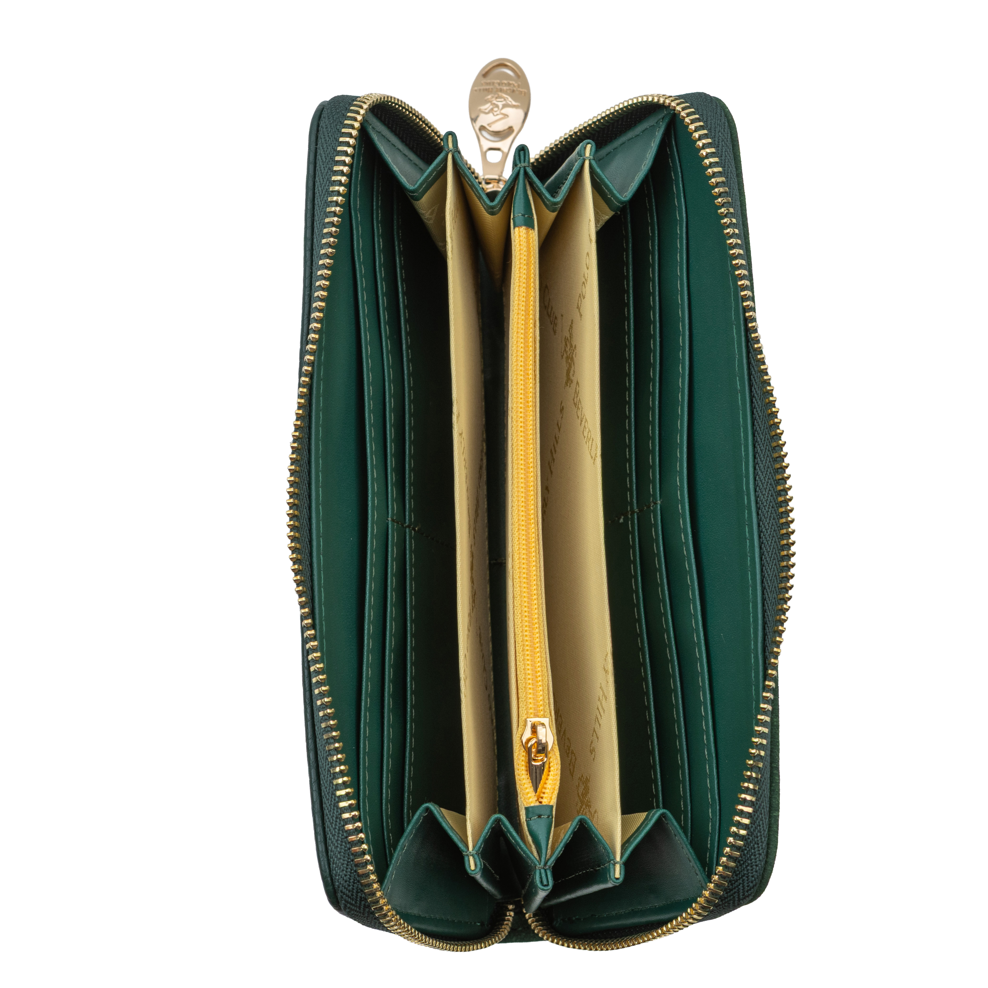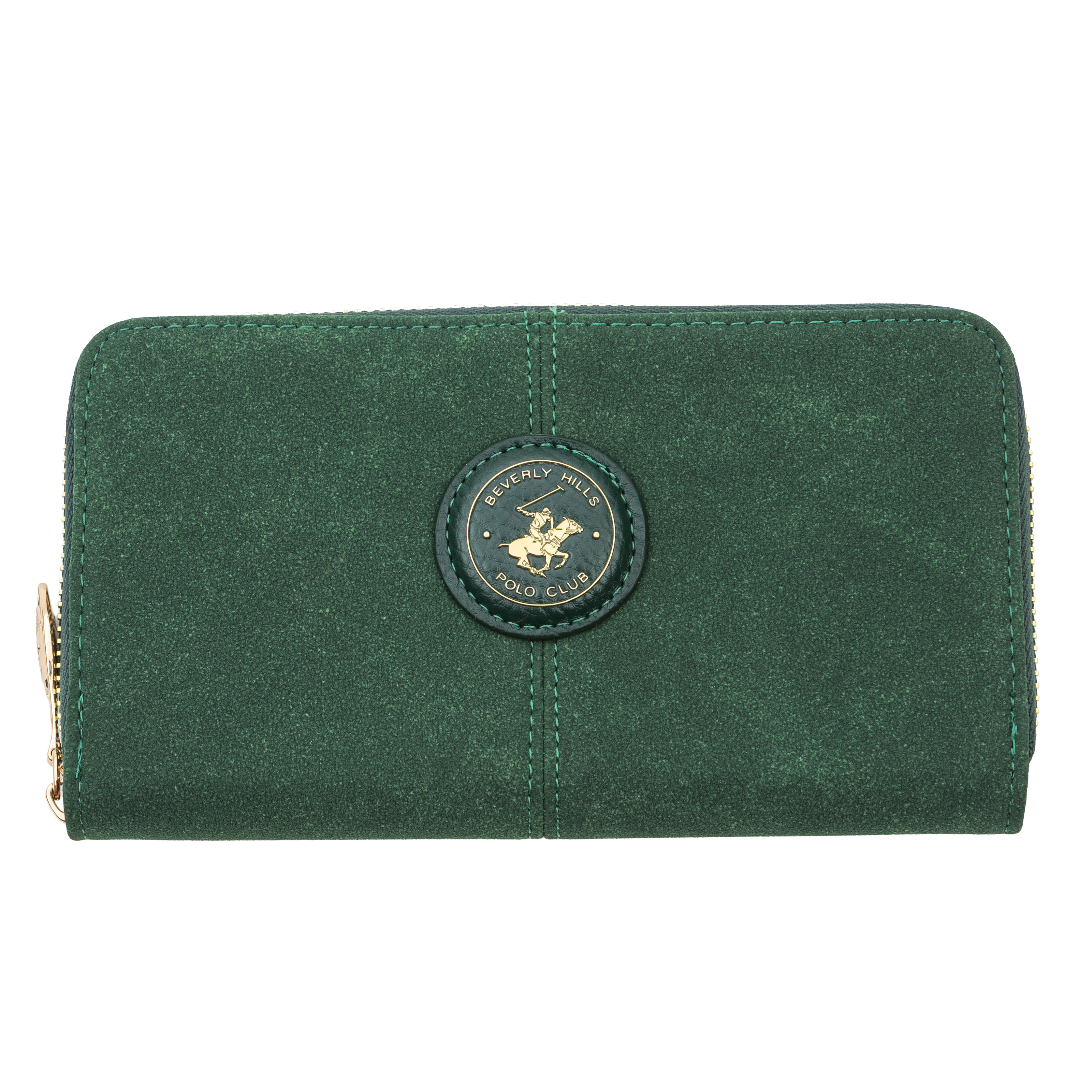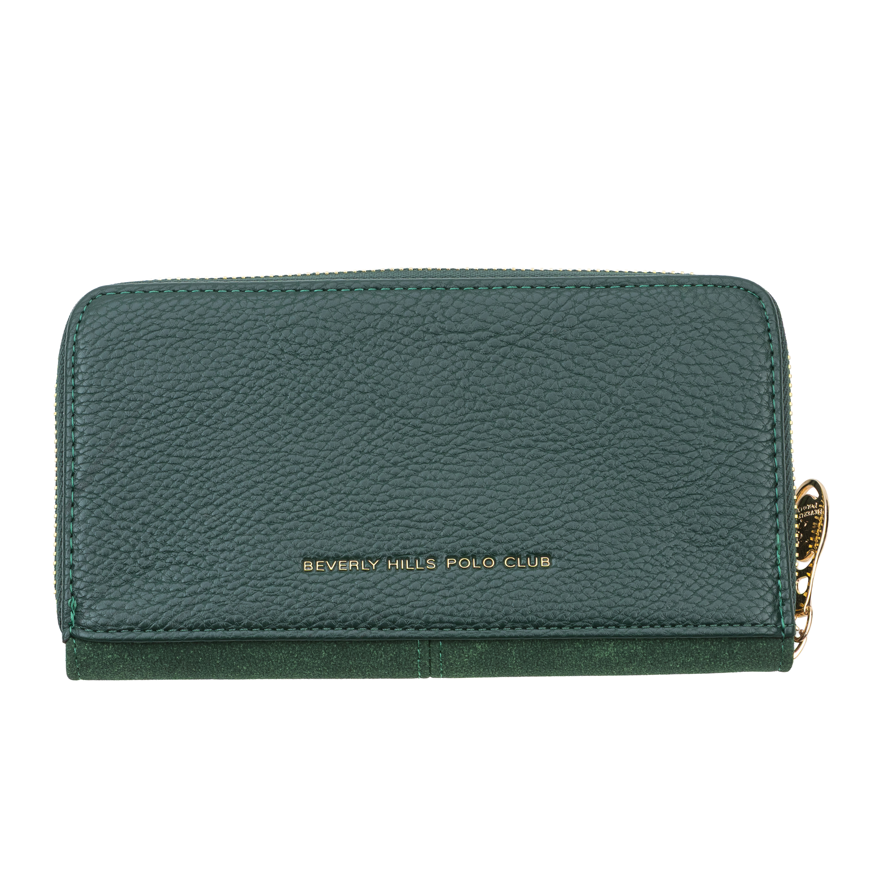 Това дамско портмоне от еко кожа впечатлява с класически силует в зелен цвят, който лесно се комбинира с различни дамски чанти. Моделът е с обиколен цип, който осигурява надеждна защита на съдържанието и позволява портмонето да се отваря широко за максимално удобство. Вътрешността е организирана с няколко разширяващи се отделения, подходящи за подредба на банкноти, карти, документи и бележки, както и централно отделение, в което могат да се съхраняват монети. Декоративният кръгъл медальон с логото на Beverly Hills Polo Club придава изискан, леко винтидж акцент и превръща портмонето в красив завършек на всяка визия или готов подарък в комплект с дамска чанта.