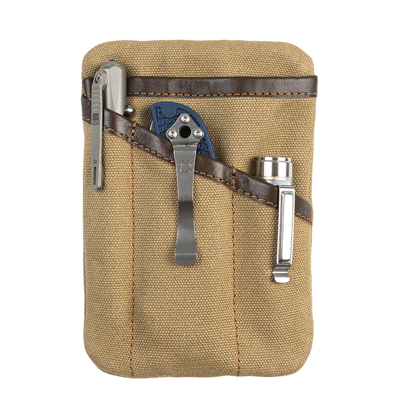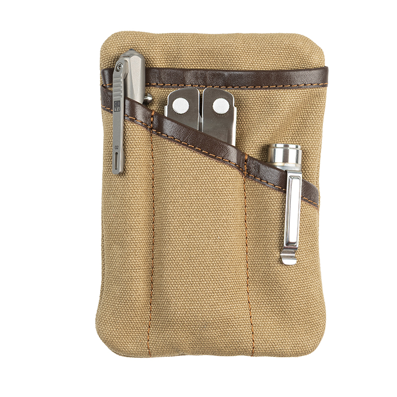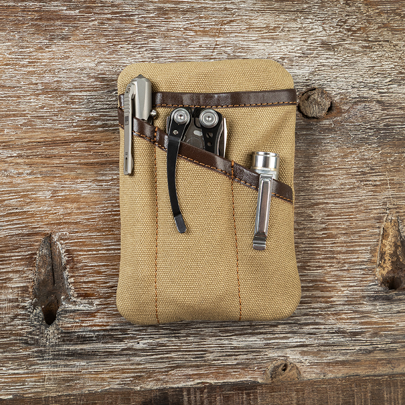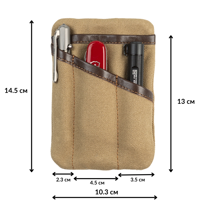 Този компактен органайзер с размери 10,3 х 14,5 см е перфектният джобен органйзер за всеки мъж, който държи на реда в ежедневието си. Лек, издръжлив и експертно изработен, той събира на едно място всички важни джаджи и инструменти – от химикалка и фенерче до нож или мултитул. Изработен от здрав импрегниран брезент, с подсилени ръбове от естествена телешка кожа, органайзерът предлага надеждна защита и дълготрайна употреба. Основното отделение с метален цип побира вещите ви сигурно, а четирите външни джоба осигуряват бърз достъп до най-често използваните принадлежности.Благодарение на тънкия си и плосък профил, калъфът се побира удобно в джоб на панталон, чанта или раница, без да създава обем.