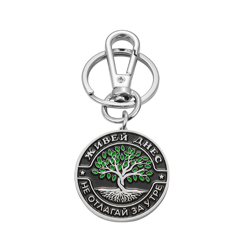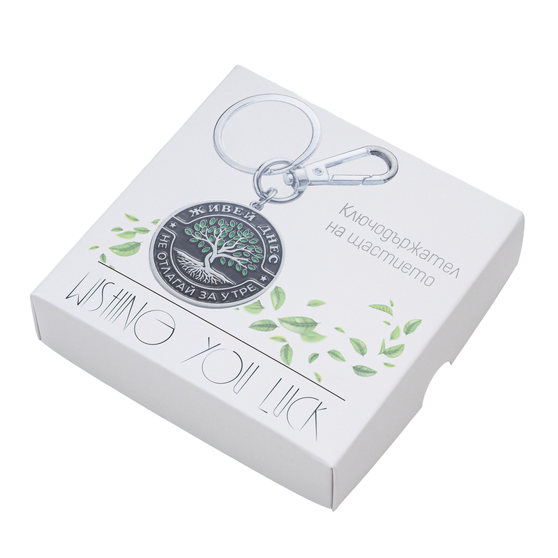 Елегантният ключодържател „Живей Днес“ е изработен от масивен метал със златисто покритие и удобен карабинер за бързо закачане към колан, раница или чантичка. Към него е добавен класически разделителен пръстен за ключове и овален медальон в черно с контрастен бял символ и зелени акценти – стилизирано „Дърво на живота“ и текста „Живей днес – не отлагай за утре“. Изчистеният дизайн и стабилната конструкция го правят подходящ както за ежедневието, така и за стилен, практичен подарък.