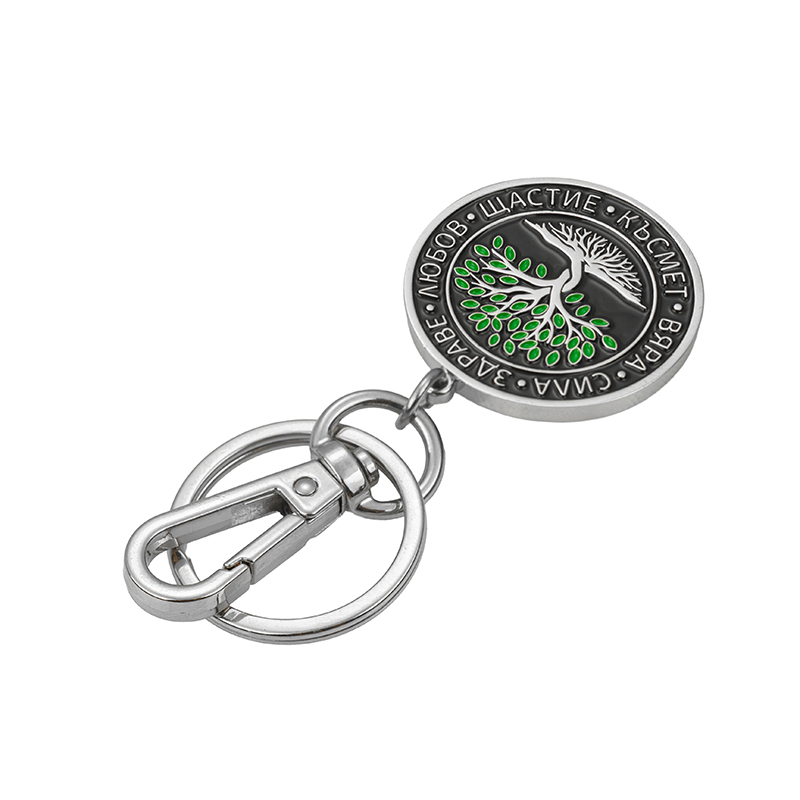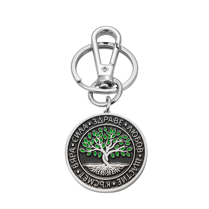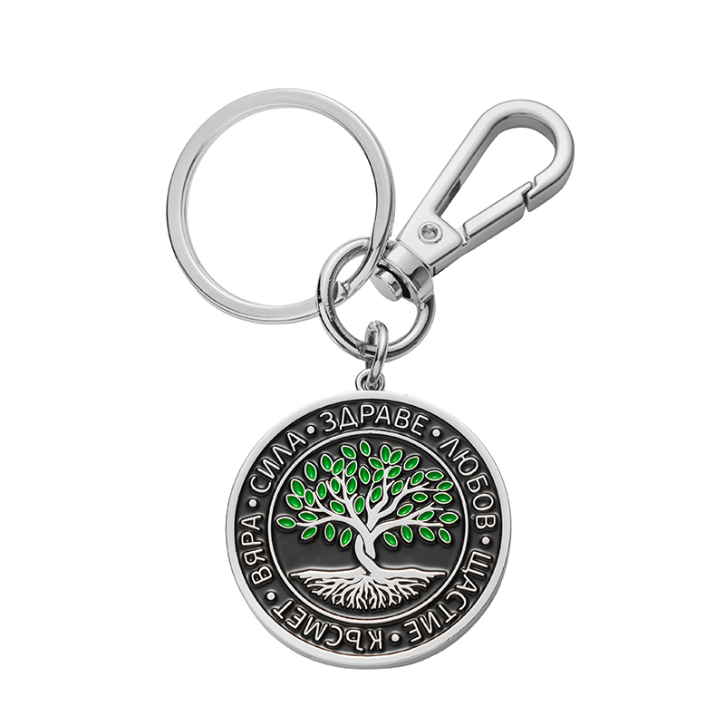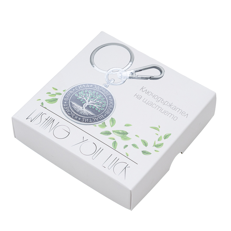 Елегантният метален ключодържател съчетава златист карабинер за бързо закачане, класически пръстен за ключове и кръгъл медальон в черно. В центъра е „Дървото на живота“ с фини зелени акценти, а по периферията са гравирани думите Вяра, Сила, Здраве, Любов, Щастие, Късмет – стилен талисман и смислен подарък за близък човек или за вас самите. Гладката метална повърхност и надеждните връзки осигуряват здравина, а изчистеният дизайн се комбинира с всеки стил.