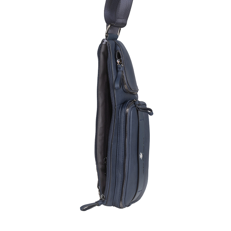 Тази мъжка чанта от еко кожа в син цвят е подходяща за ежедневието, когато искате всичко необходимо да е под ръка. Удължената форма тип „crossbody“ и размерите 35 x 15 x 4 см позволяват удобно съхранение на телефон, портфейл, ключове, документи и дребни аксесоари. Основното отделение се затваря с цип и осигурява сигурност за ценните вещи. По лицевата част са разположени няколко външни джоба с цип, които дават бърз достъп до най-често използваните предмети – слушалки, карти, монетник или документи за пътуване. Регулируемата презрамка позволява чантата да се носи през рамо или диагонално според предпочитанията, като осигурява максимален комфорт при движение. Еко кожата в син нюанс се поддържа лесно и придава на модела модерно, урбанистично излъчване, а дискретното лого Beverly Hills Polo Club допълва стилния завършек.