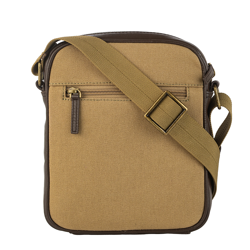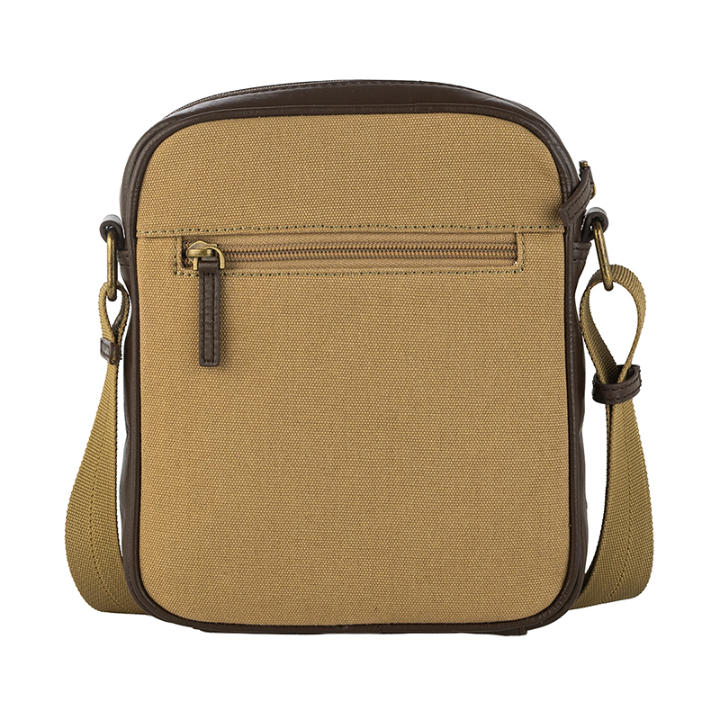 Моделът разполага с основно отделение с цип, което предлага достатъчно пространство за телефон, портфейл, ключове и аксесоари, както и допълнителен преден джоб за бърз достъп. Регулируемата презрамка позволява персонализирано прилягане и комфорт при носене през рамо. Изработена от импрегниран брезент с подсилени ръбове от естествена телешка кожа в цвят каки, чантата съчетава високо качество, издръжливост и надеждност при дълготрайна употреба.