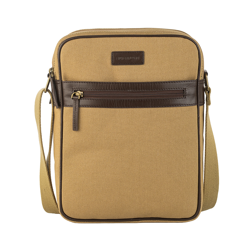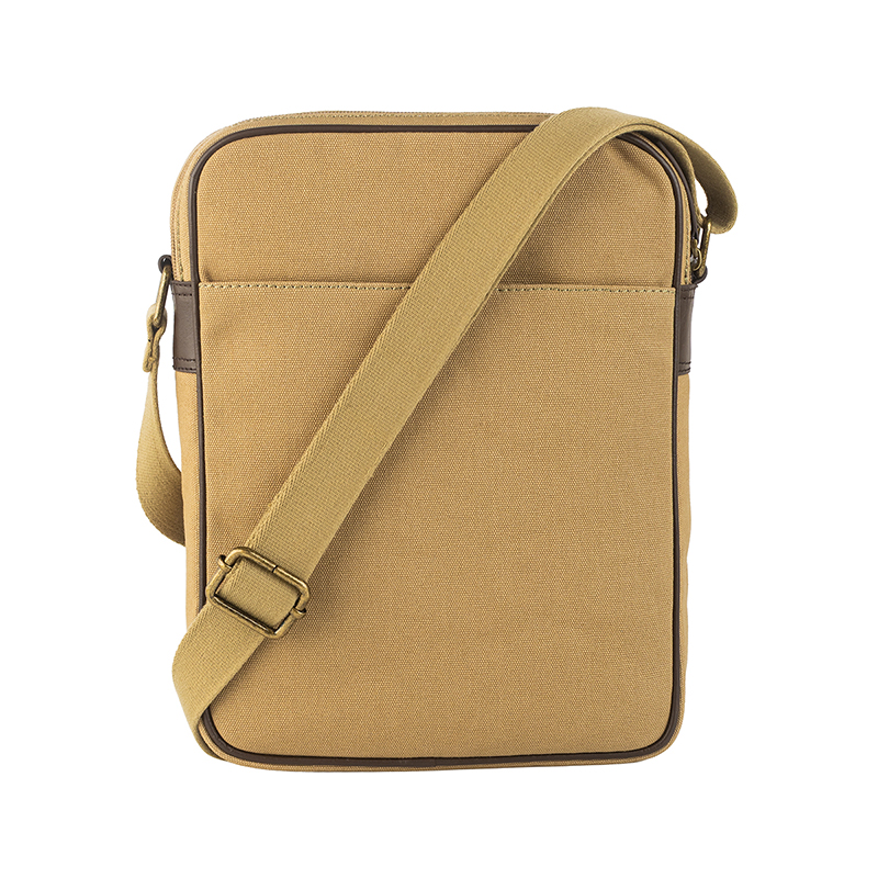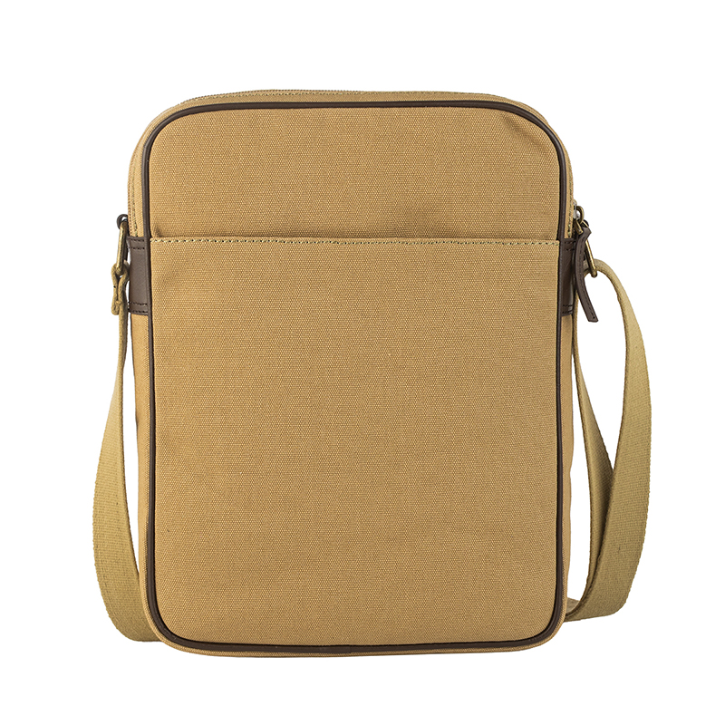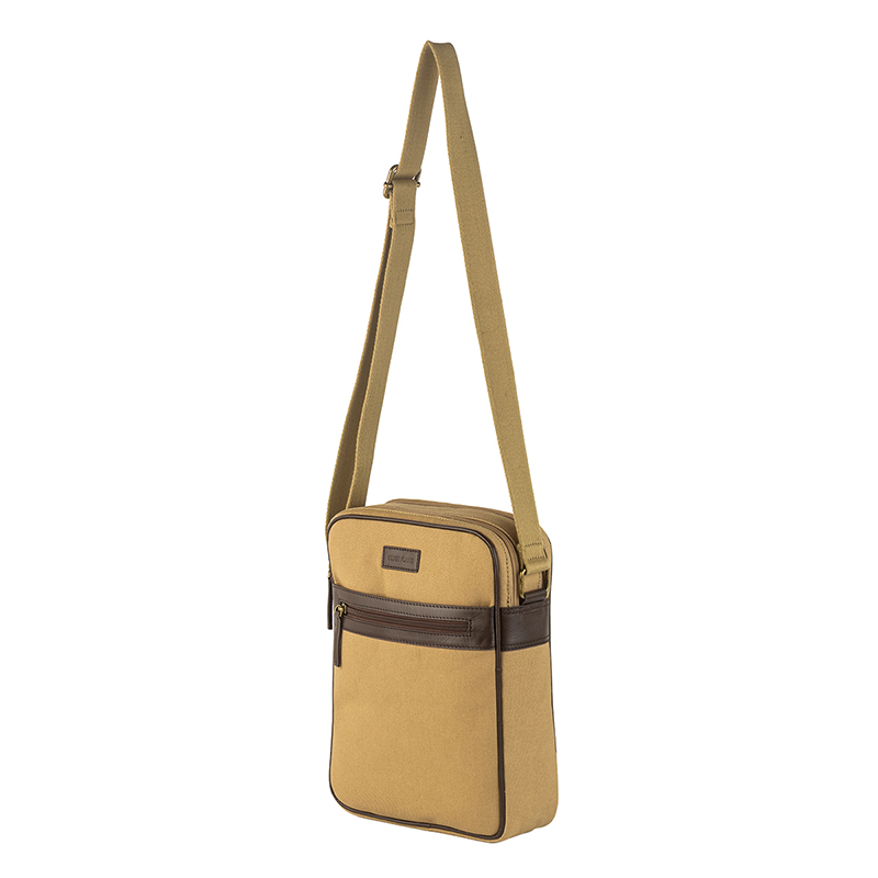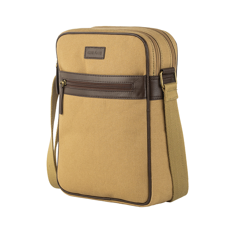 Моделът разполага с просторно основно отделение с цип, подходящо за документи, таблет, портфейл и аксесоари, както и преден джоб за бърз достъп до най-използваните предмети. Регулируемата презрамка позволява удобно носене през рамо според индивидуалните предпочитания. Изработена от импрегниран брезент с подсилени ръбове от естествена телешка кожа в цвят каки, чантата съчетава високо качество, издръжливост и надеждност при дълготрайна употреба.