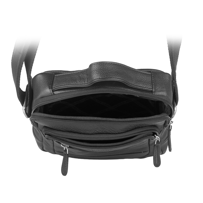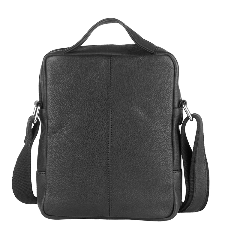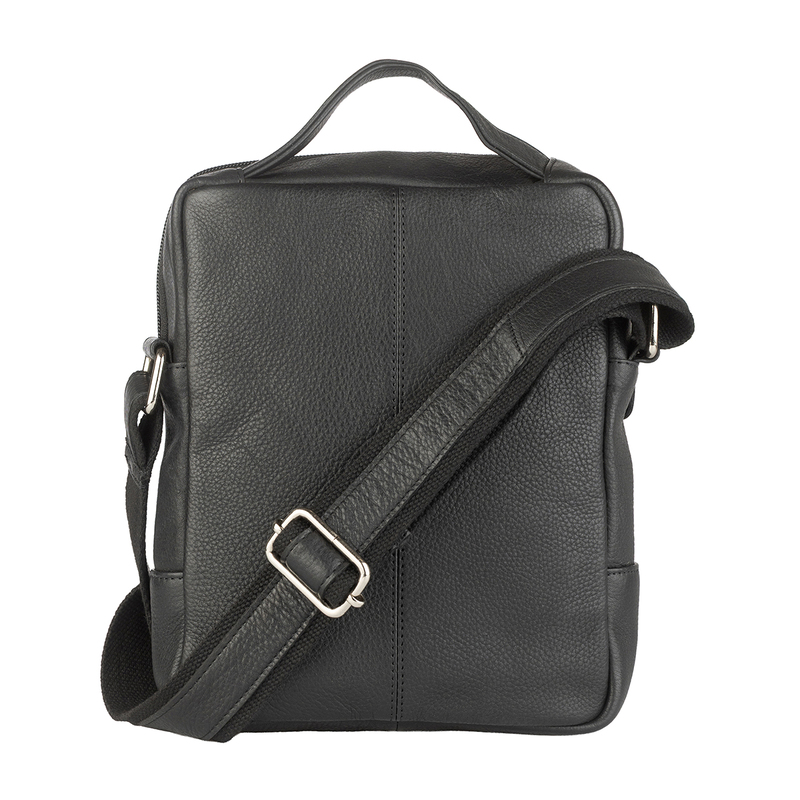 Тази мъжка кожена чанта е изработена от фина естествена кожа в класически черен цвят и е отлично решение за работа, пътуване или ежедневни излизания. Компактната правоъгълна форма позволява да поберете портфейл, телефон, ключове, документи и други необходими принадлежности. На лицевата страна има голям външен джоб с цип и допълнителен преден джоб за бърз достъп до най-често ползваните вещи. Удобната регулируема презрамка позволява носене през рамо или диагонално според предпочитанията, а горната дръжка улеснява хващането в ръка.