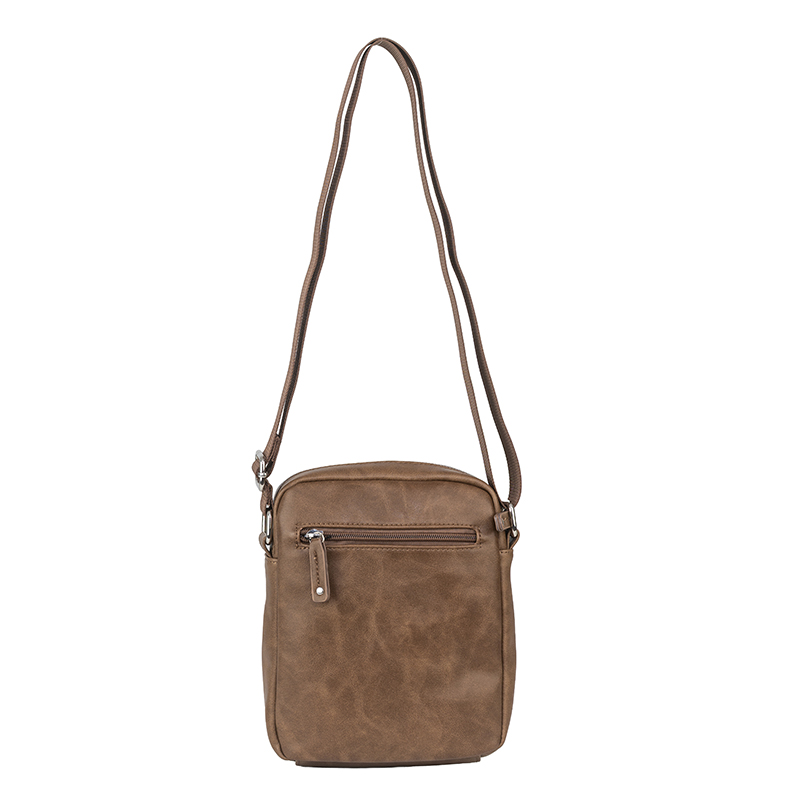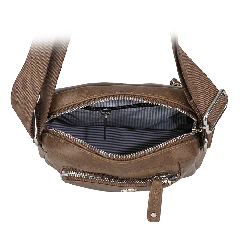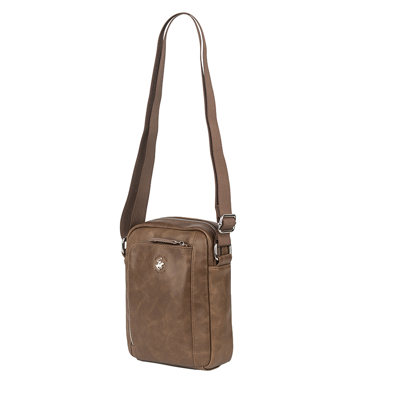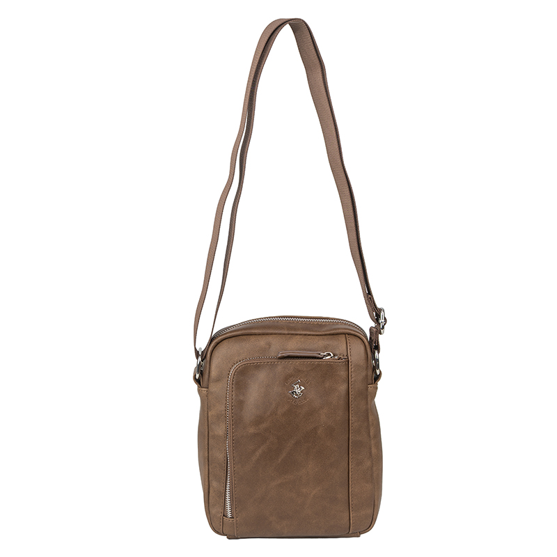 Тази елегантна мъжка чанта през рамо е изработена от фина еко кожа в класически тъмнокафяв цвят. Вертикалният силует е компактен и удобен, а лицевият панел е акцентиран с дискретно лого и два практични ципа – горен джоб за бърз достъп и преден вертикален джоб. Основното отделение се затваря сигурно с цип и е подплатено с райе, като вътре има джобове за телефон, документи и аксесоари. На гърба ще откриете още един джоб с цип за ценни вещи. Широката регулируема текстилна презрамка, подсилена с метални халки, осигурява стабилност и комфорт при носене – идеален избор за град, офис и като удобна чанта за пътуване. Компактният размер 18x23x6,5 см побира всичко необходимо, без излишен обем – качествена мъжка чанта от кожа за всеки стил.