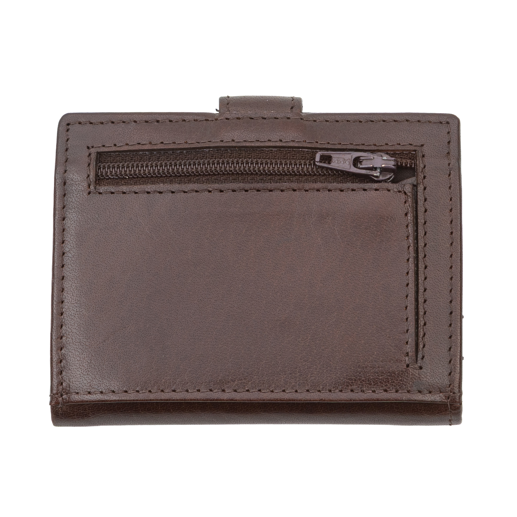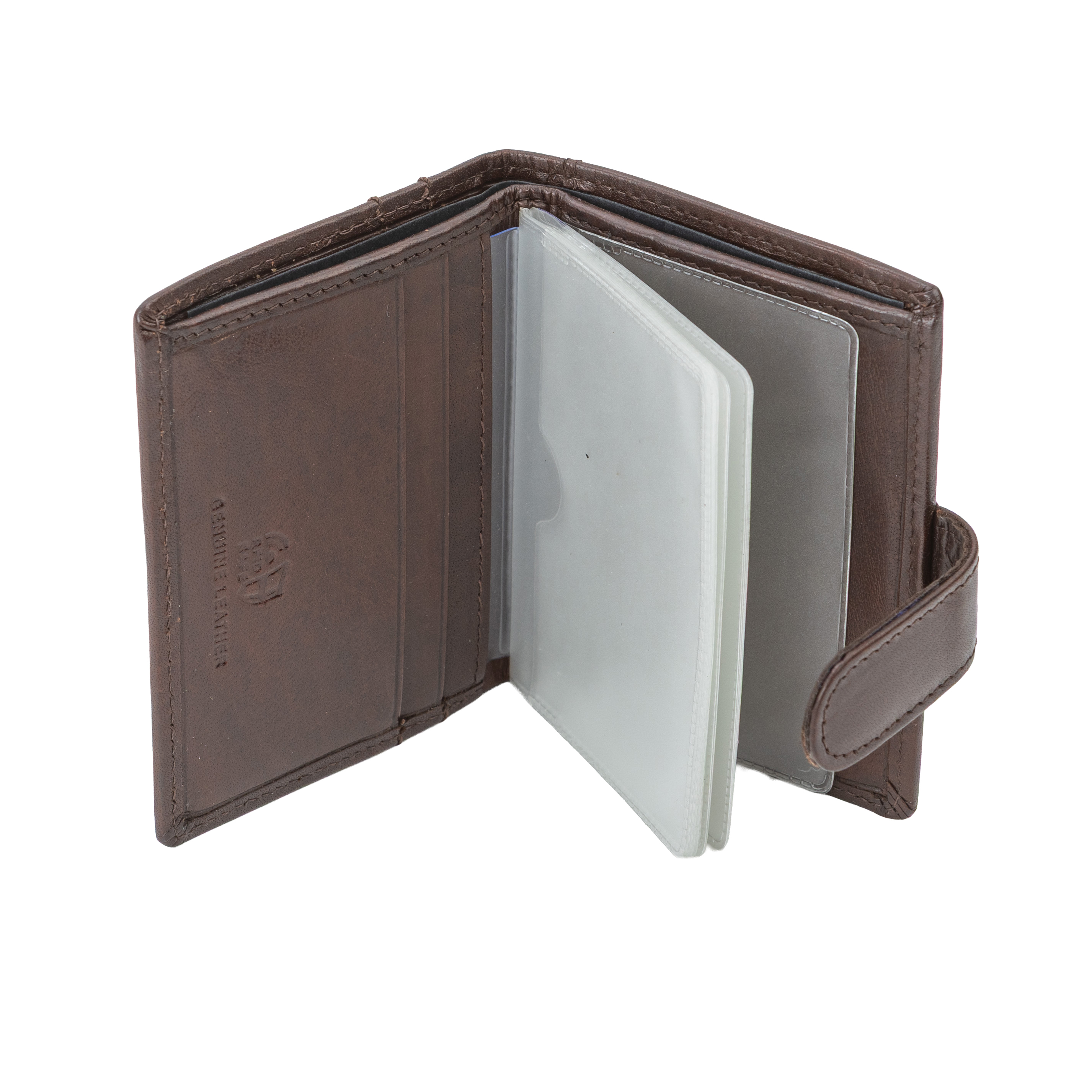 Този мъжки портфейл от естествена кожа в класически кафяв цвят е функционален модел с компактни размери, подходящ както за ежедневно ползване, така и за подарък. Вертикалният дизайн предлага органайзер с много отделения за карти и документи, което позволява отлична подредба и бърз достъп до тях. Широкото отделение за банкноти побира удобно различни валути, а на гърба е разположен джоб с цип, в което можете да съхранявате монети или малки вещи. Външното закопчаване с каишка осигурява допълнителна защита и стабилност при затваряне, като същевременно придава стилен акцент към дизайна. Естествената кожа гарантира дълготрайна употреба, а дискретното релефно лого добавя фин завършек към цялостния вид.