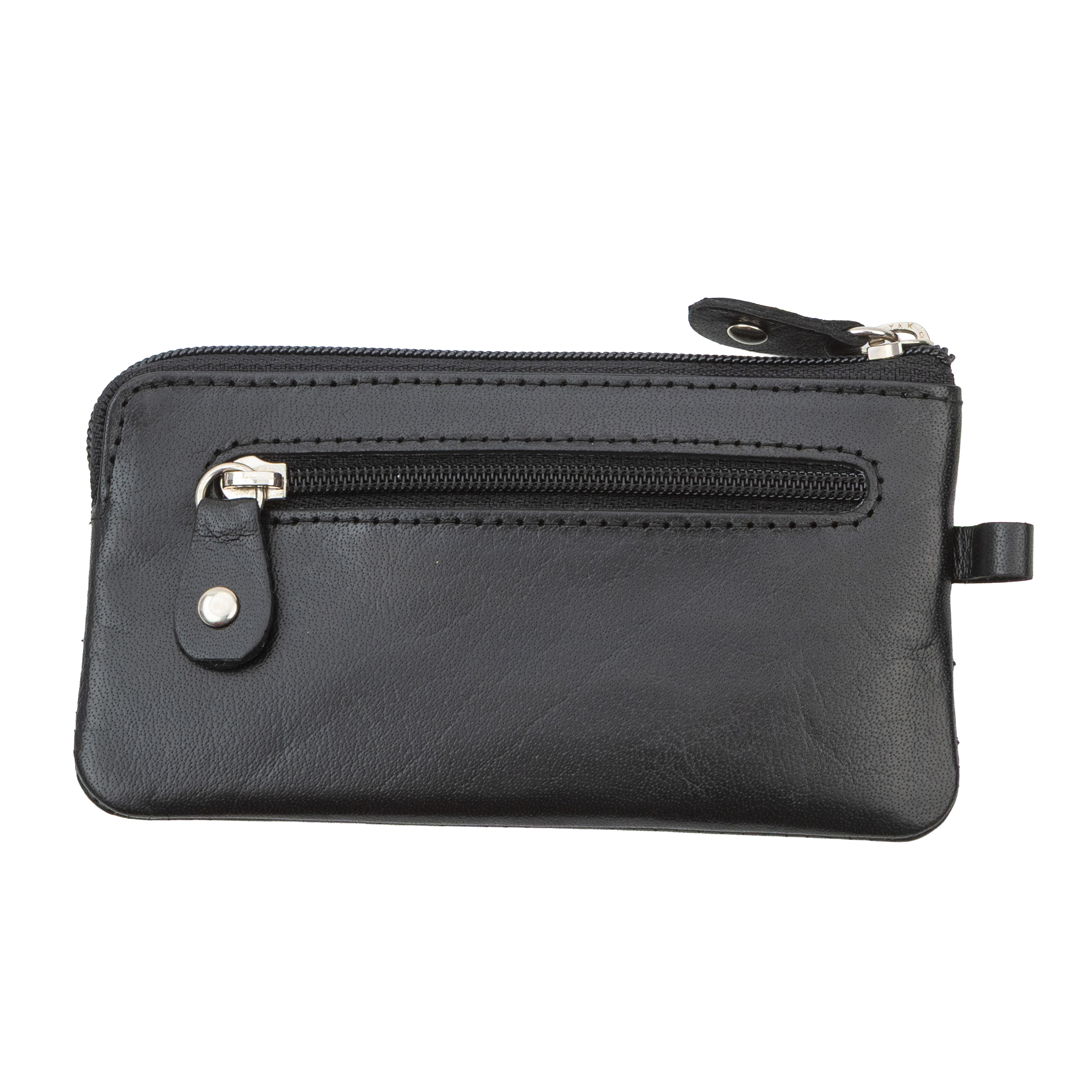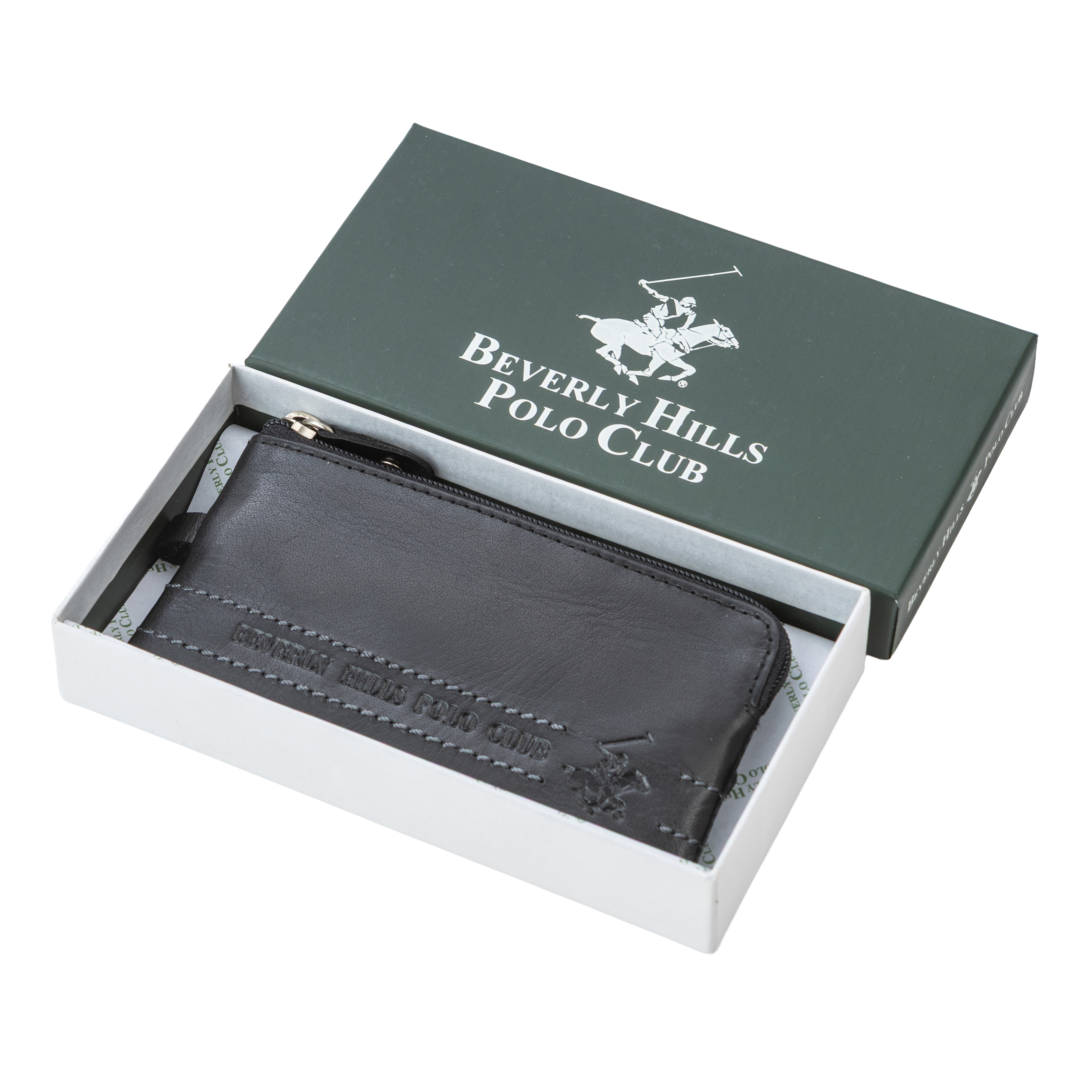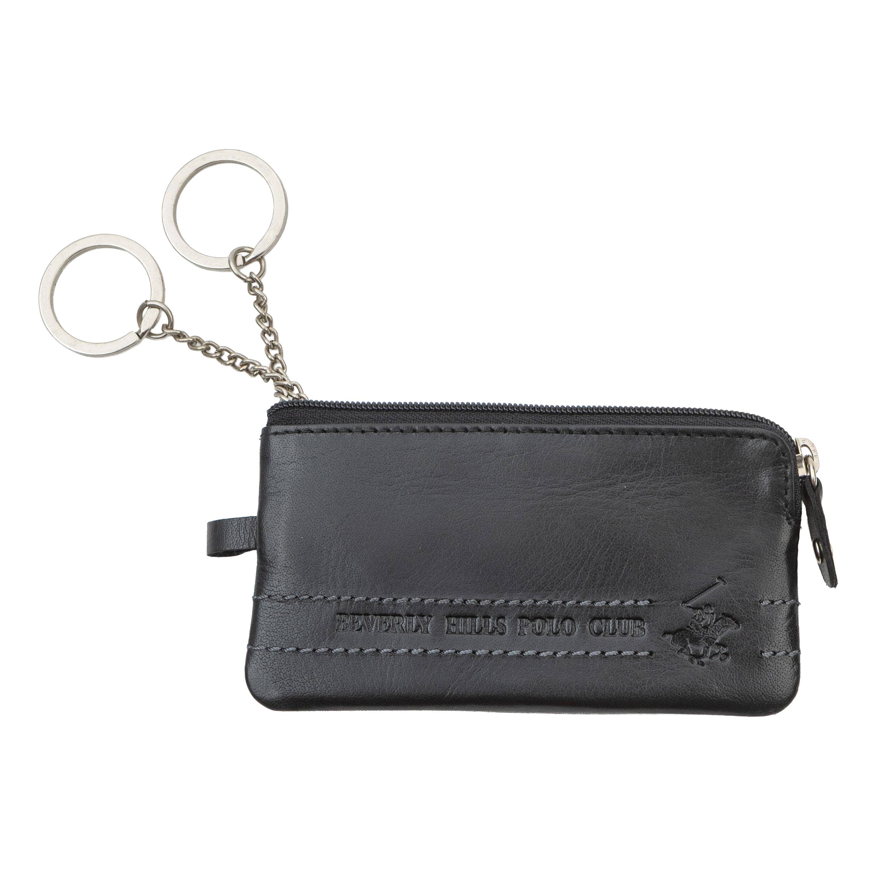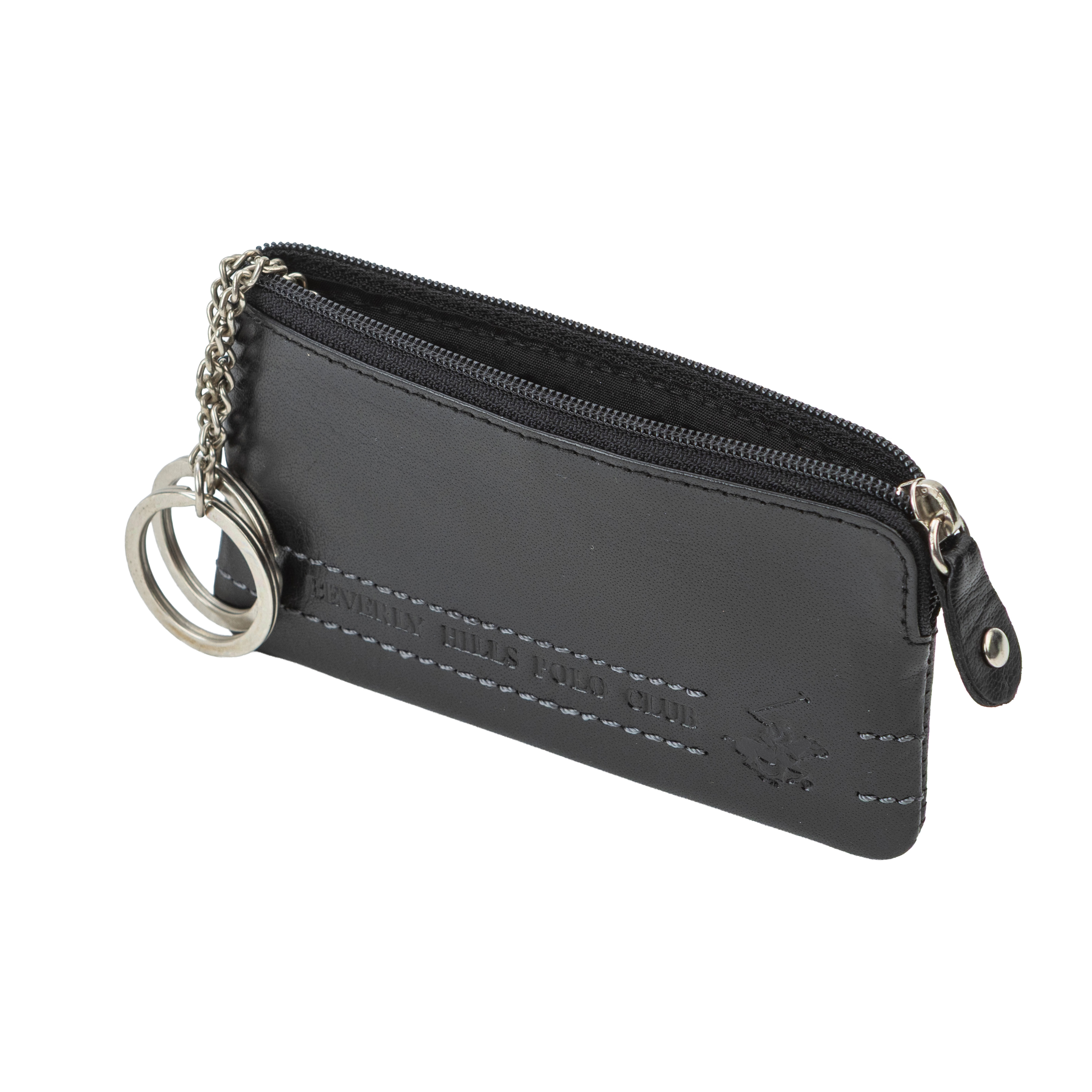 Този мъжки портфейл–калъф от естествена кожа в черен цвят е практичен модел, съчетаващ ключодържател и портфейл в едно. Основното отделение с цип предлага безопасно място за монети, сгънати банкноти или ключове. Двете метални халки - ключодържатели, свързани със здрава верижка, осигуряват удобно закачане на ключове. Естествената кожа издръжлива, а фините декоративни шевове и дискретното лого на Beverly Hills Polo Club придават стилен характер на аксесоара.
