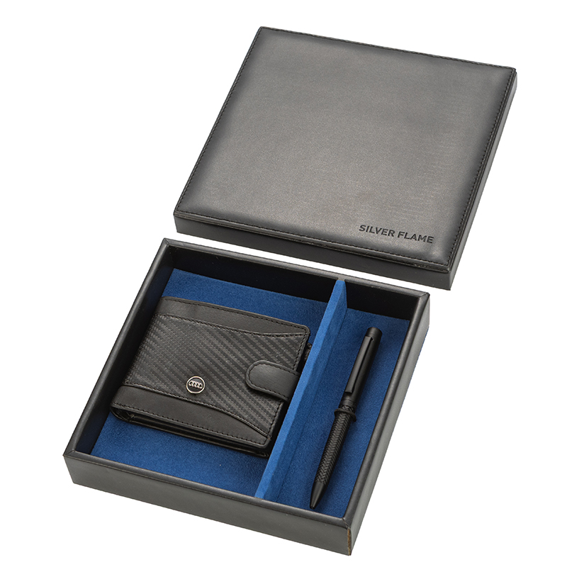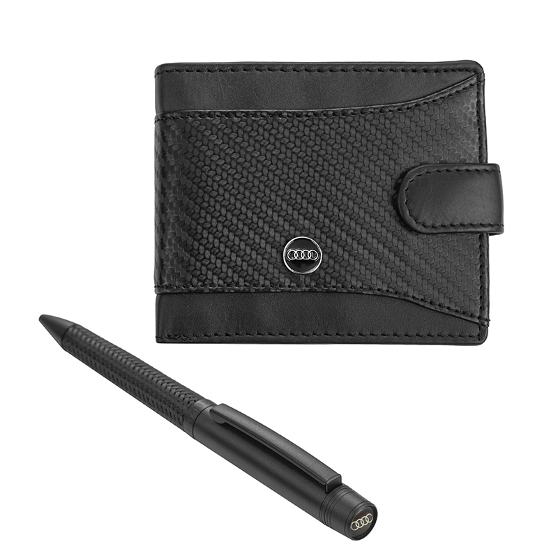 Добавете изисканост към ежедневието си или зарадвайте специален човек с този стилен мъжки комплект Audi. Комплектът включва изискан портфейл с карбонов завършек и стилна химикалка, и двата с логото на Audi. Продуктът е представен в луксозна подаръчна кутия, което го прави изключителен избор за мъжки подарък с вкус и характер.