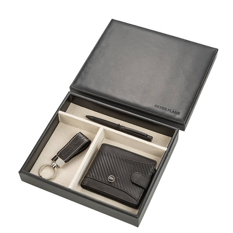 Комплектът комбинира стил и удобство: компактен портфейл от фина естествена кожа с емблема Audi отпред; метален химикал с релефен корпус за стабилен захват; кожен ключодържател с декоративен шев и масивен пръстен за сигурно съхранение на ключове. Всичко е подредено в елегантна подаръчна кутия, готова за директно поднасяне.