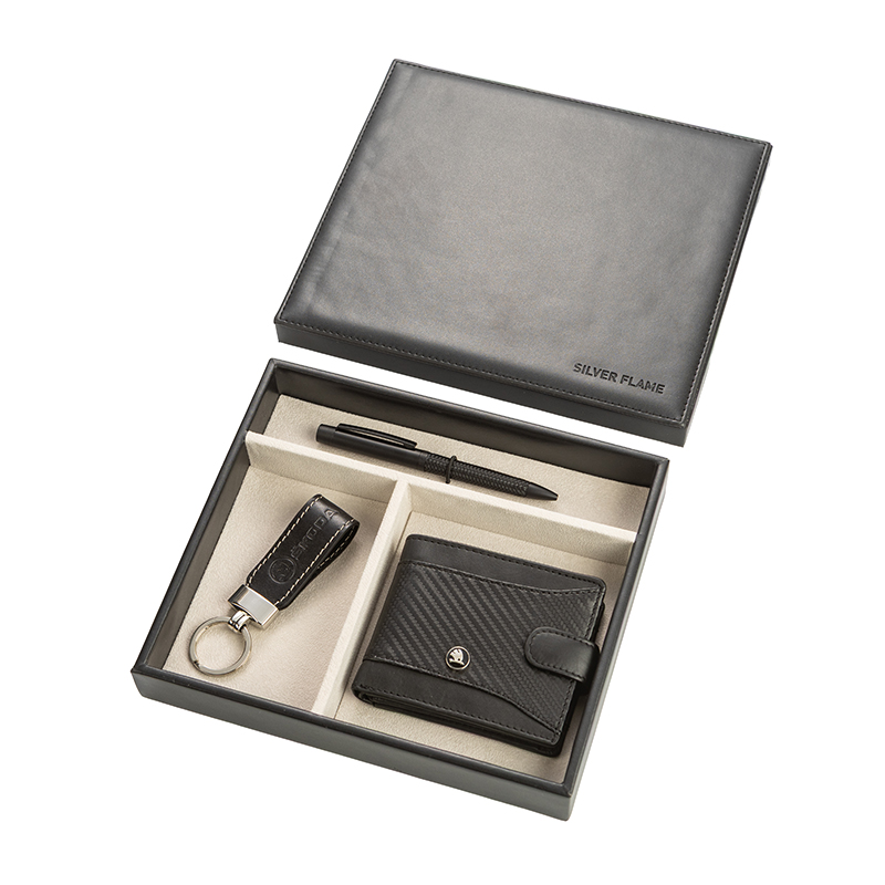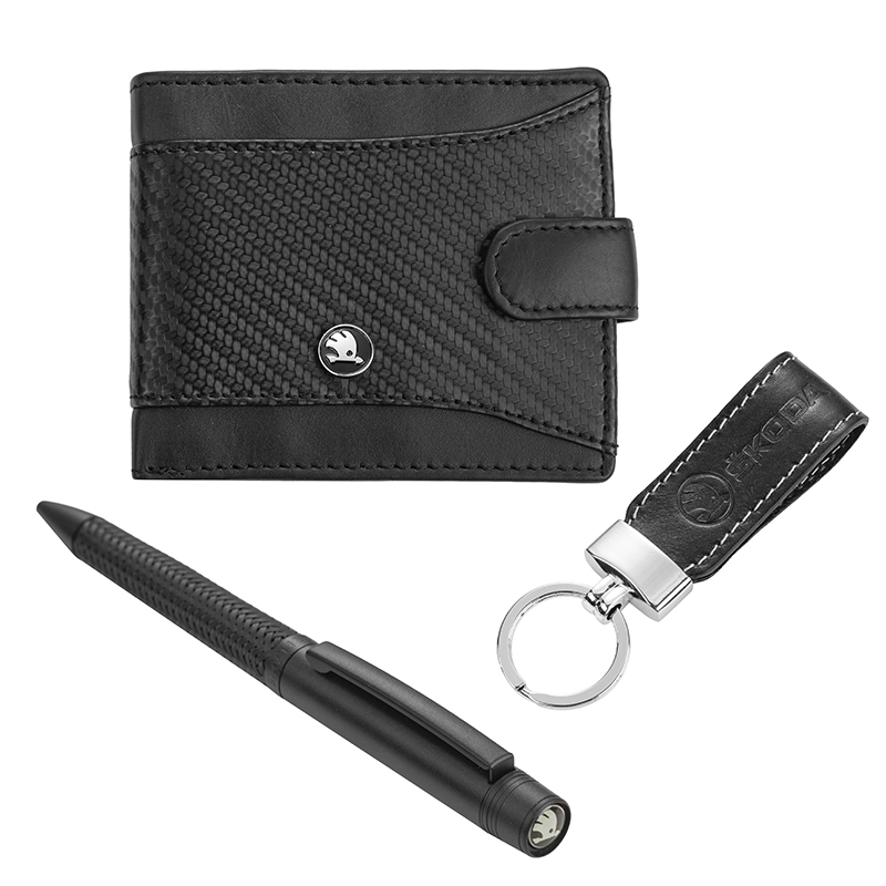 Комплектът комбинира стил и удобство: компактен портфейл от фина естествена кожа с емблема Skoda отпред; метален химикал с релефен корпус за стабилен захват; кожен ключодържател с декоративен шев и масивен пръстен за сигурно съхранение на ключове. Всичко е подредено в елегантна подаръчна кутия, готова за директно поднасяне.