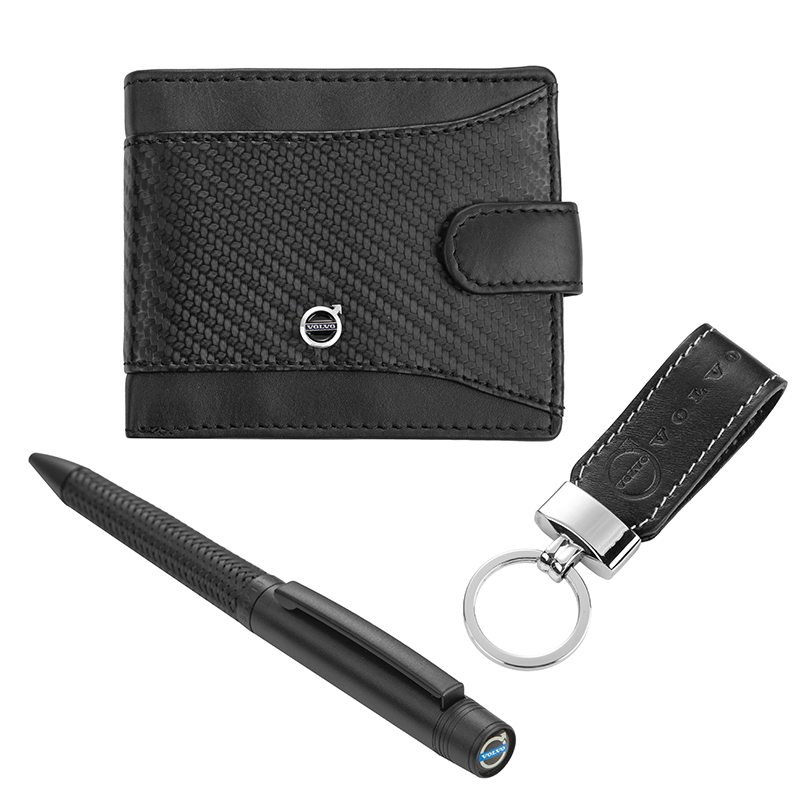 Комплектът комбинира стил и удобство: компактен портфейл от фина естествена кожа с емблема Volvo отпред; метален химикал с релефен корпус за стабилен захват; кожен ключодържател с декоративен шев и масивен пръстен за сигурно съхранение на ключове. Всичко е подредено в елегантна подаръчна кутия, готова за директно поднасяне.