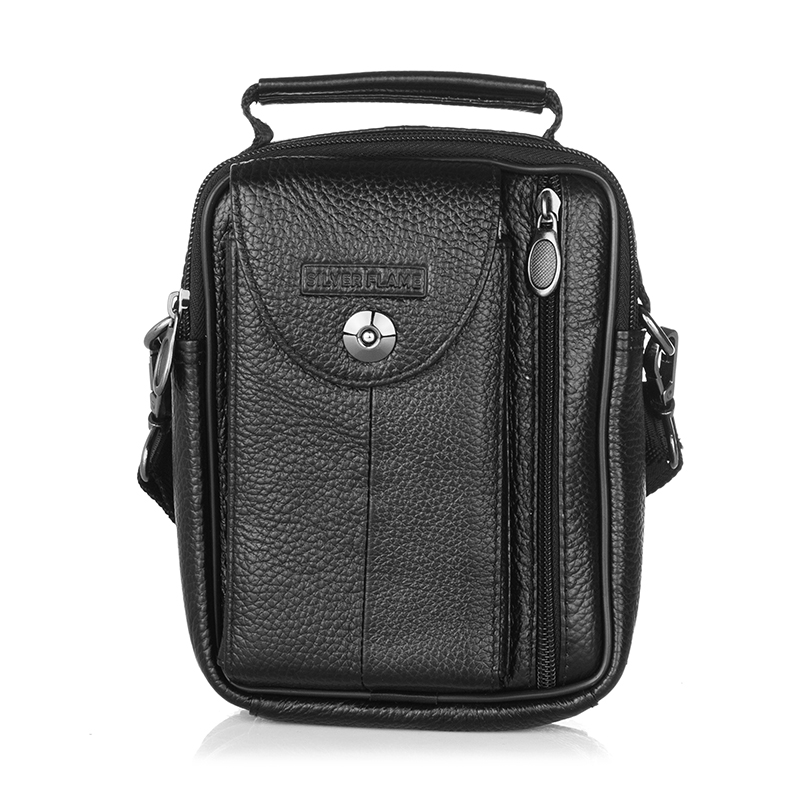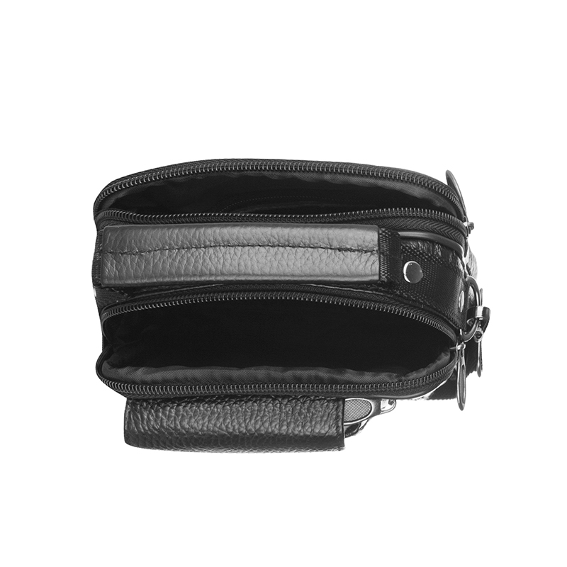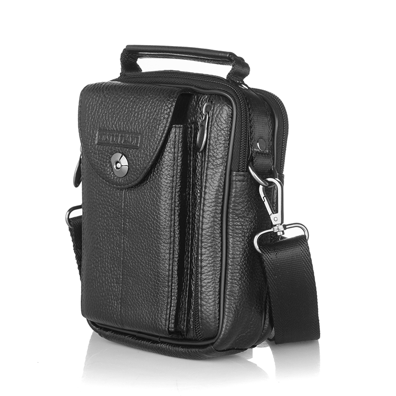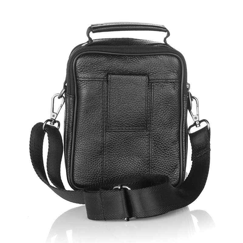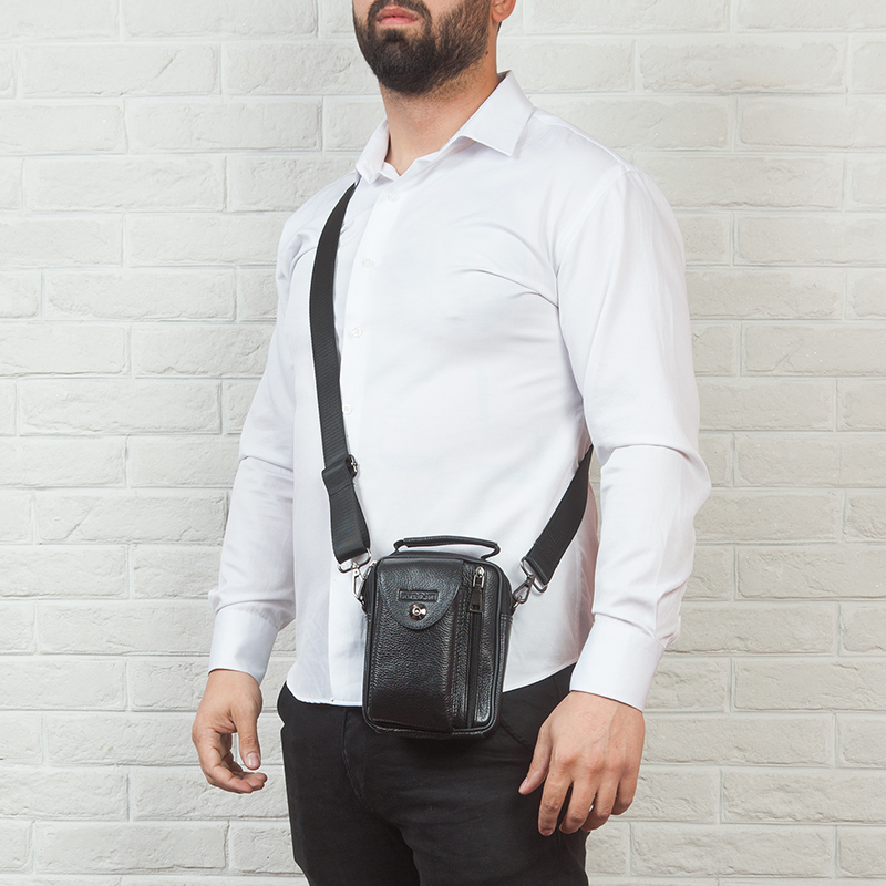 Тази мъжка кожена чанта през рамо е изпълнена от релефна черна естествена кожа и компактни размери 22×17×6 см – идеална за ежедневието. Фасадата съчетава практичен джоб с капак и копче за бърз достъп и вертикален джоб с метален цип за телефон или документи. Отгоре има удобна дръжка за носене в ръка, а отзад – грифка/лента за фиксиране към колан. Основната част разполага с два отделни отделения с цип за подредено съхранение на портфейл, ключове, паспорт, бележник и зарядни. Регулируемата текстилна презрамка се сваля, а подсилените шевове и металният обков гарантират дълъг живот. Перфектен избор за „компактна мъжка чанта за телефон и документи“ и „кожена градска чанта през рамо“.