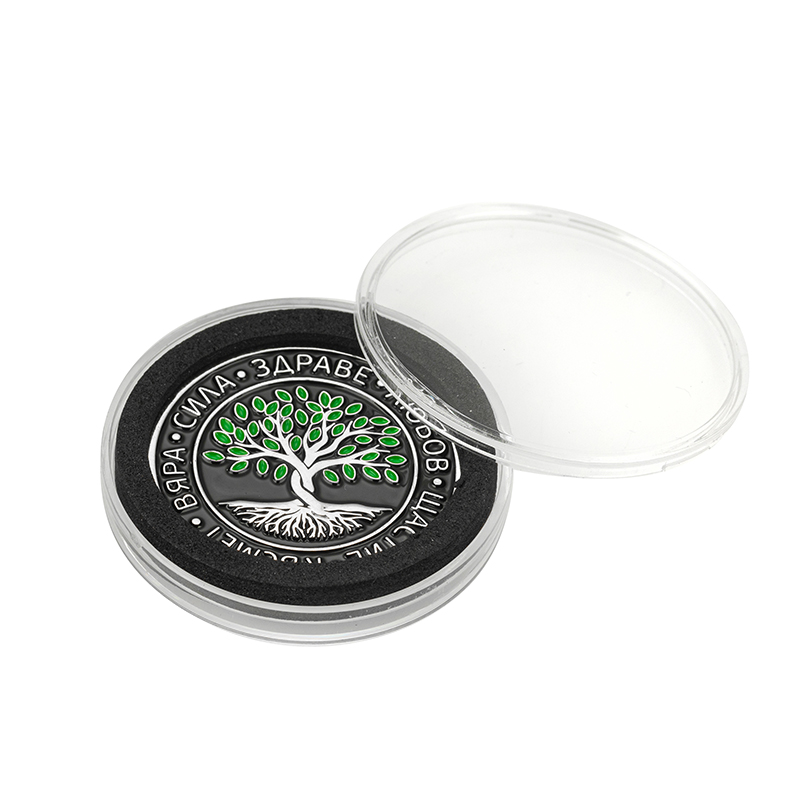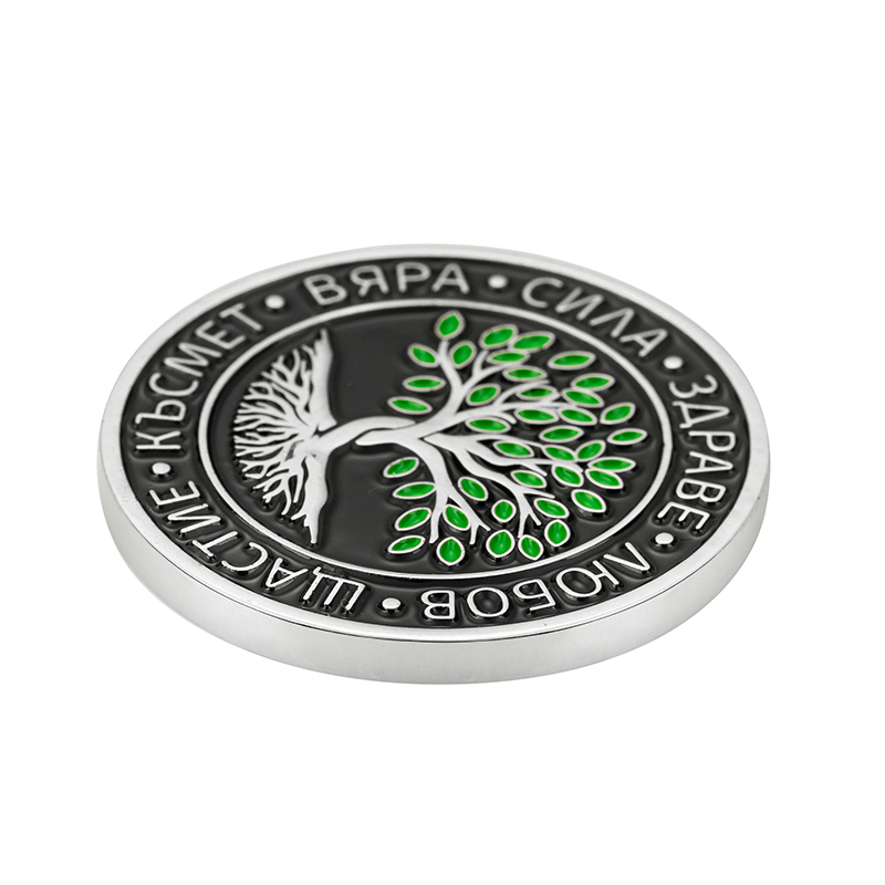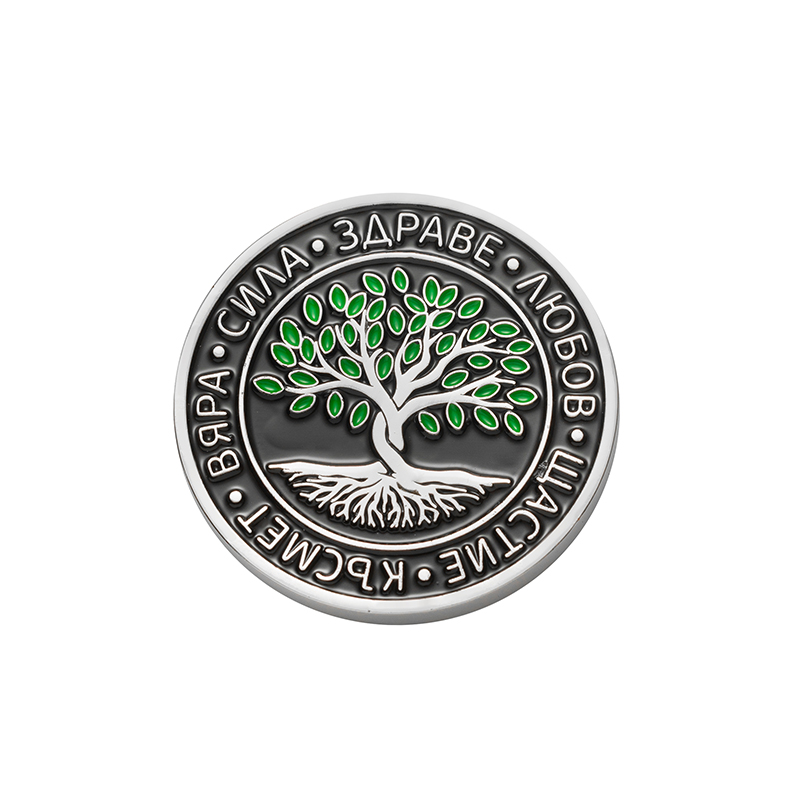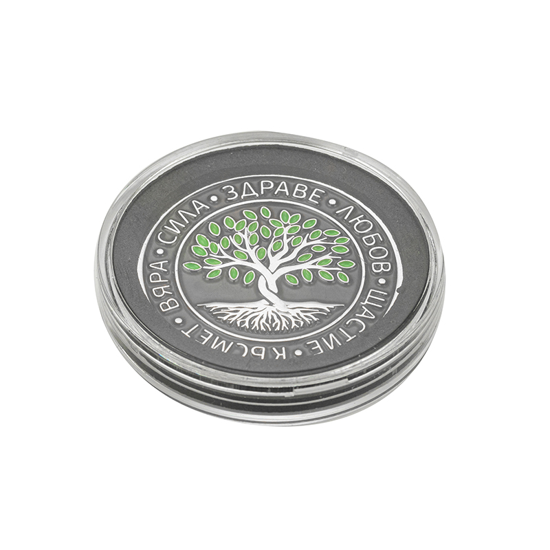 Тази вдъхновяваща монета е с класически кръгъл дизайн и релефно Дърво на живота в центъра – универсален символ на растеж и устойчивост. Околният пръстен е с ясно четливи девизи: вяра, сила, здраве, любов, щастие, късмет, които действат като личен амулет и фокус за позитивна нагласа. Контрастната черна основа подчертава белите и зелени акценти и придава елегантен, модерен вид. Компактните размери позволяват монетата да се носи в портфейл, джоб или автомобил и я правят чудесен символичен подарък за близък човек или за собствена мотивация.